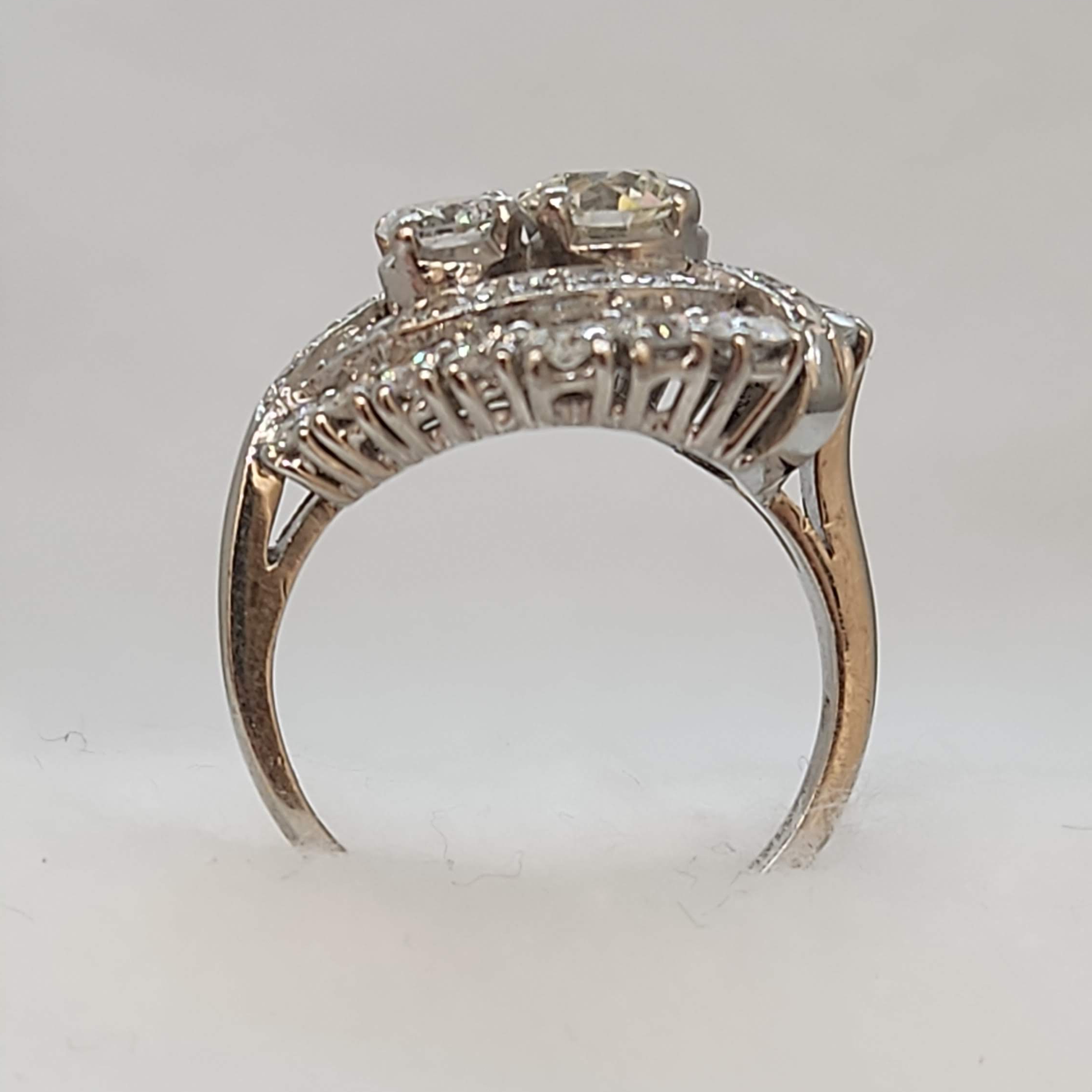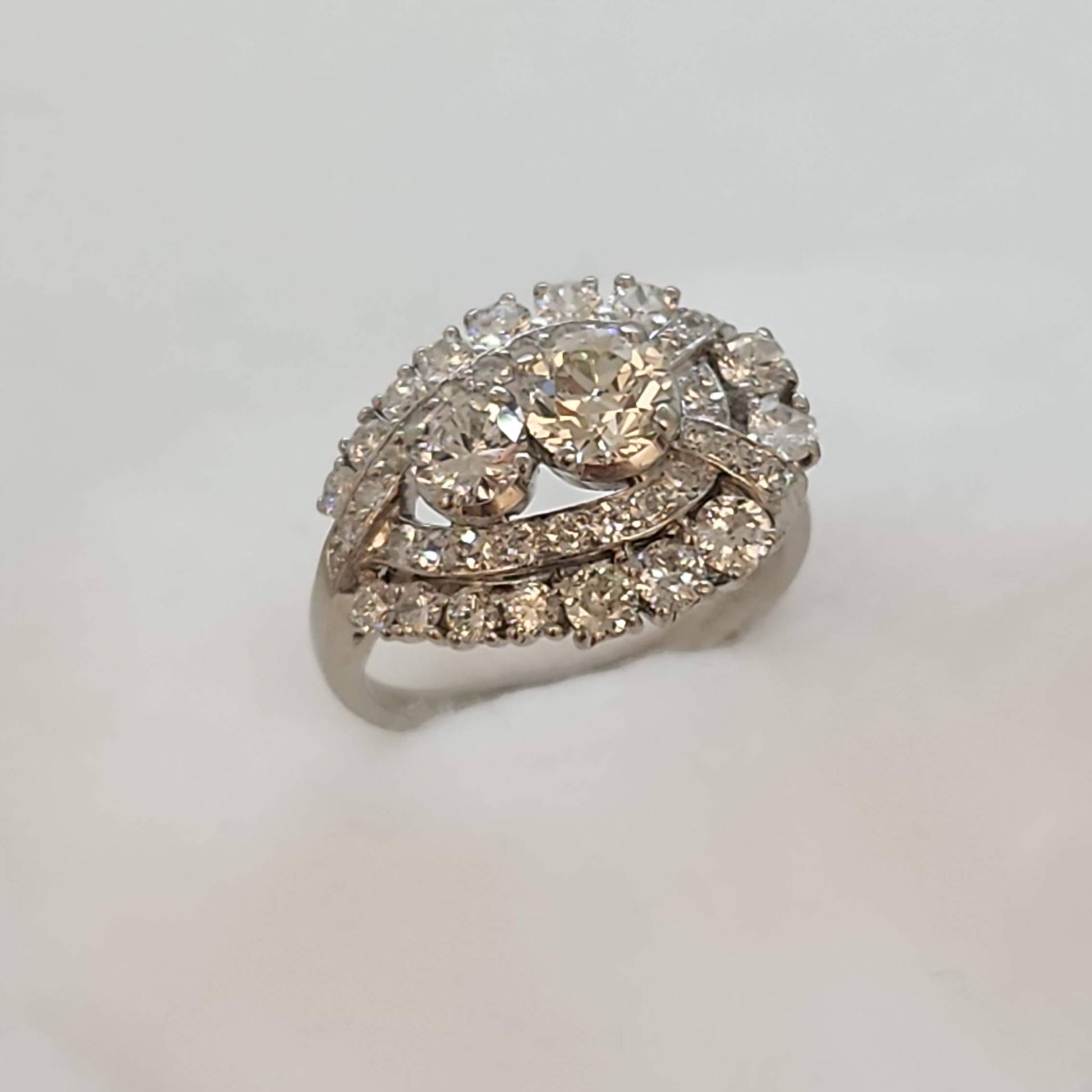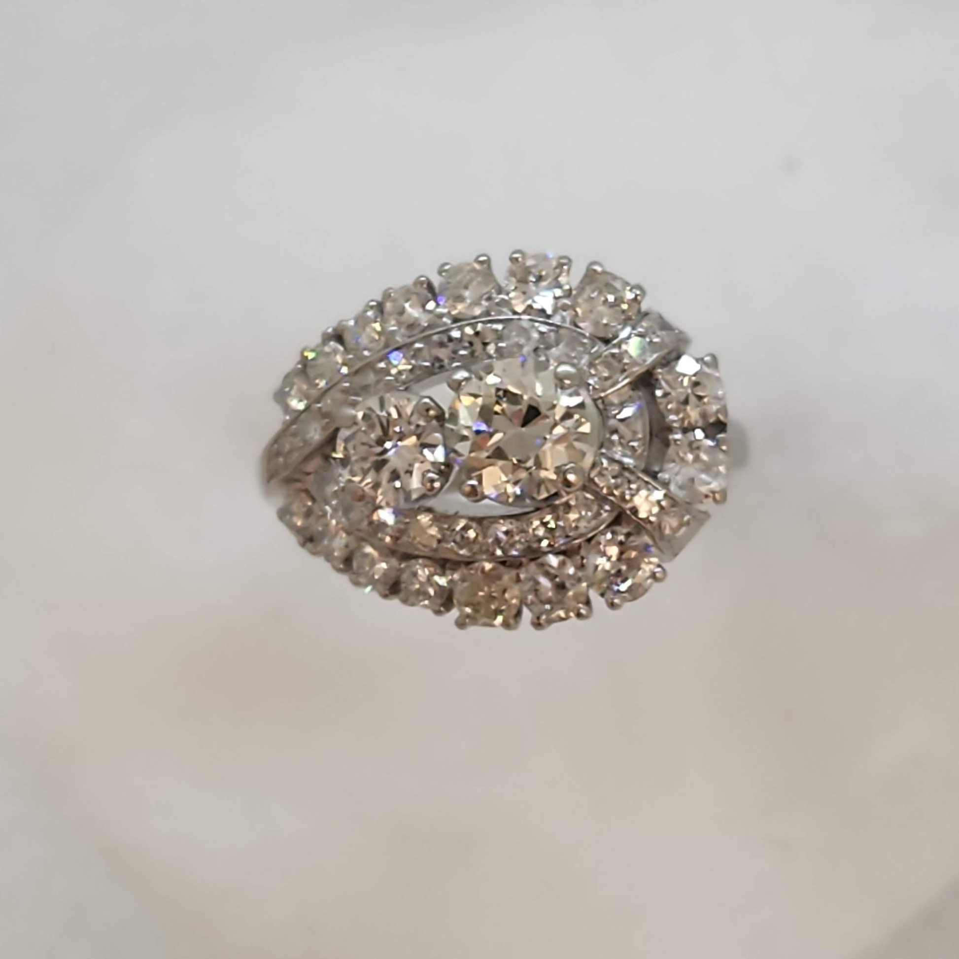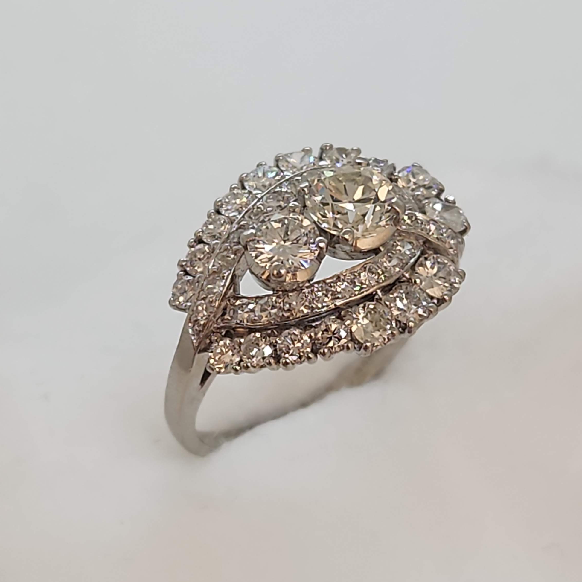Feminine paisley design . This ring was made by birks sometime in the late 40's - early 60s. From the different vintages of diamond cuts it was most likely a custom piece they made for a client using diamonds repurposed from other jewellery. This ring is in excellent shape and can be worn for years to come however two exterior diamonds are chipped. They can be replaced or left as is a reminder of it's age. This could be a completely unique engagement ring, or a fabulous right hand ring.
