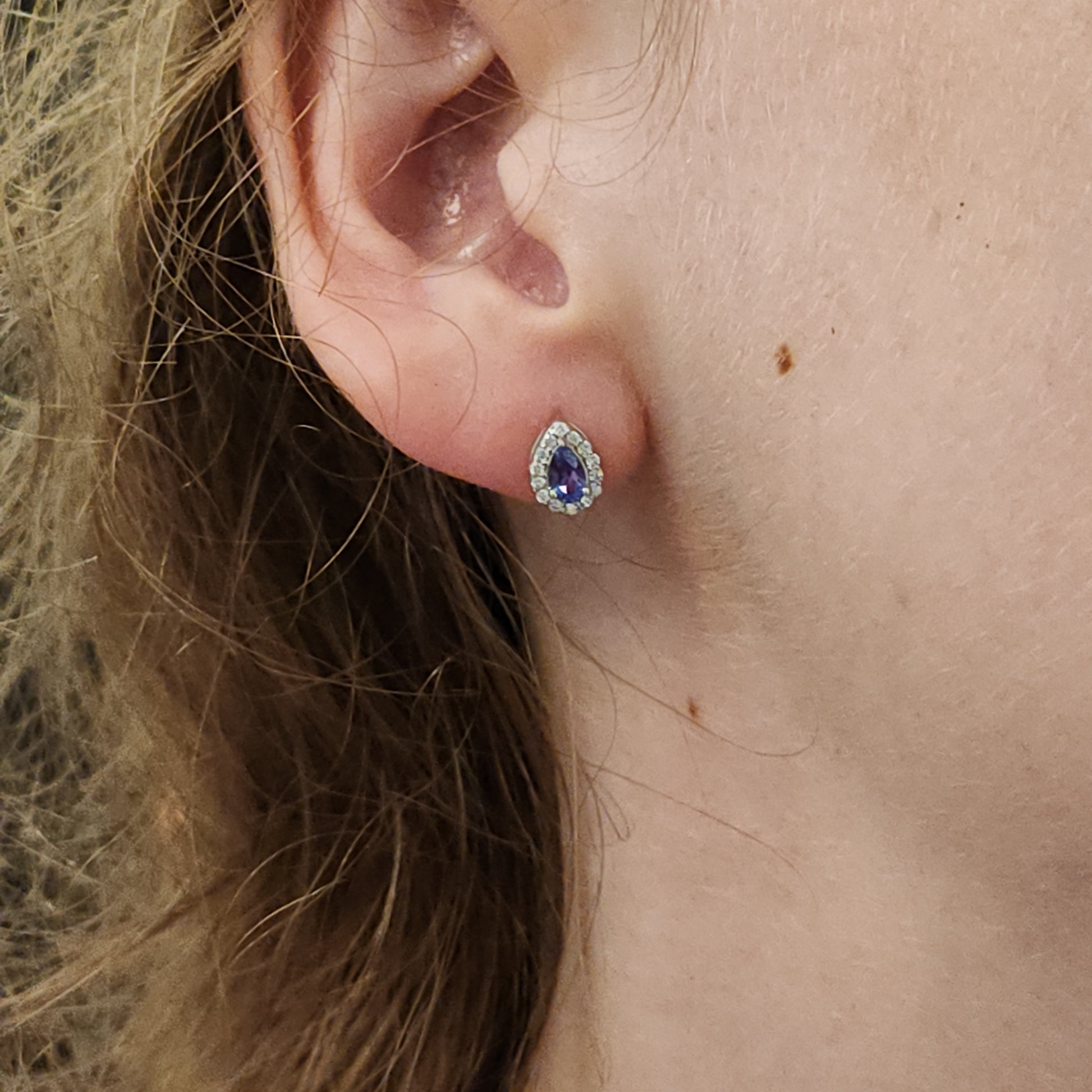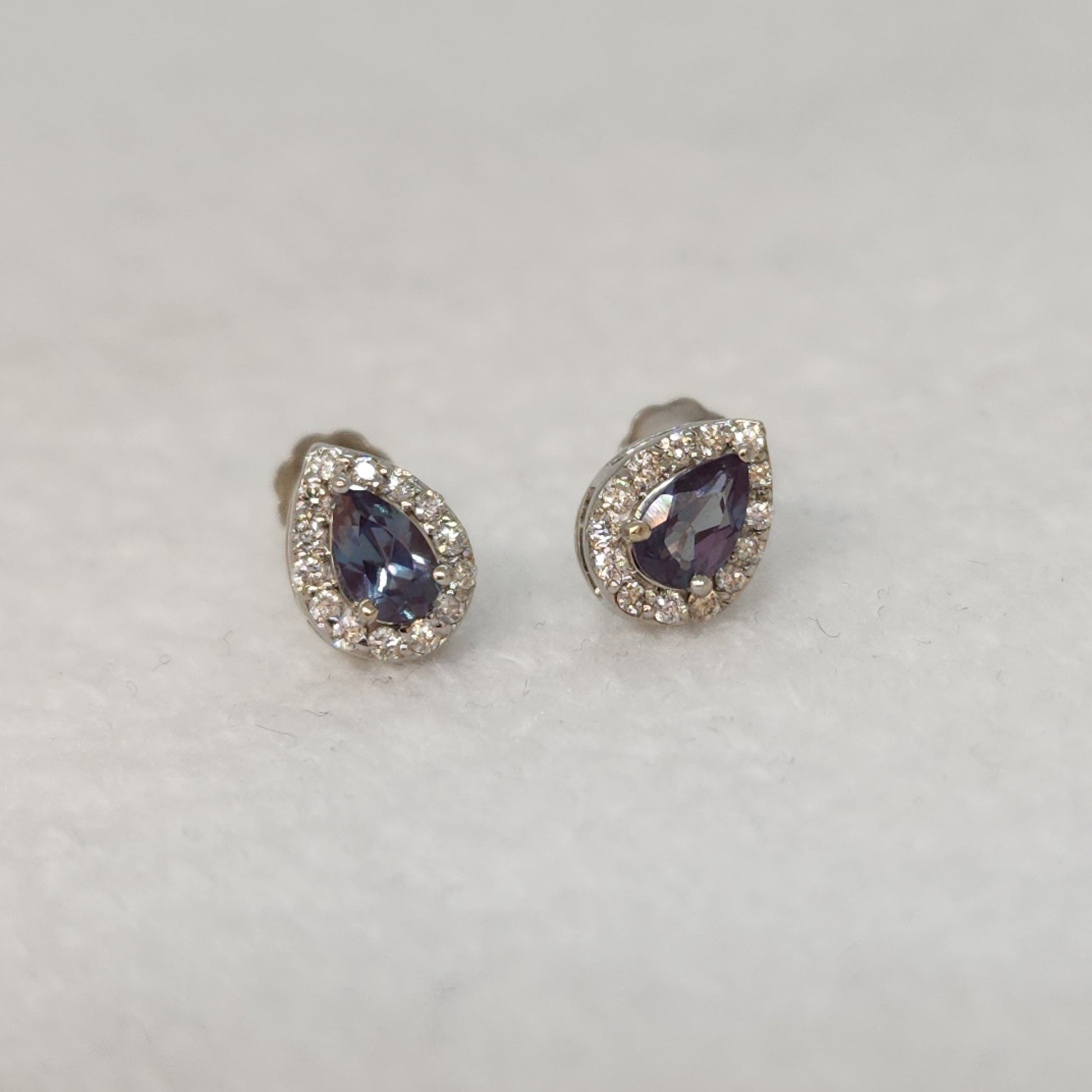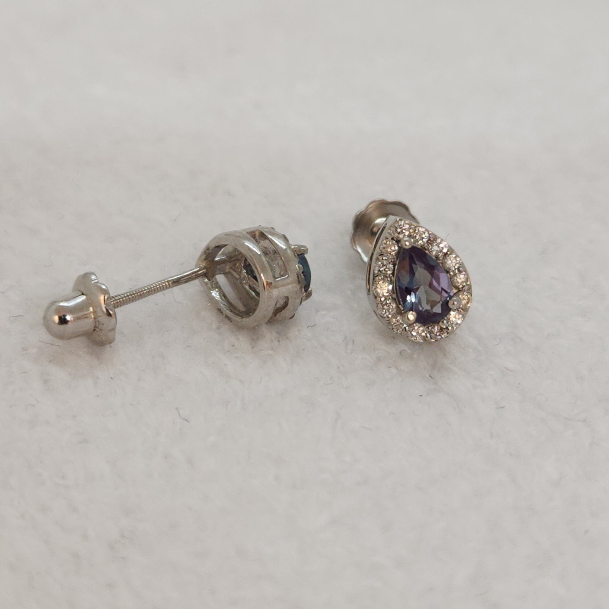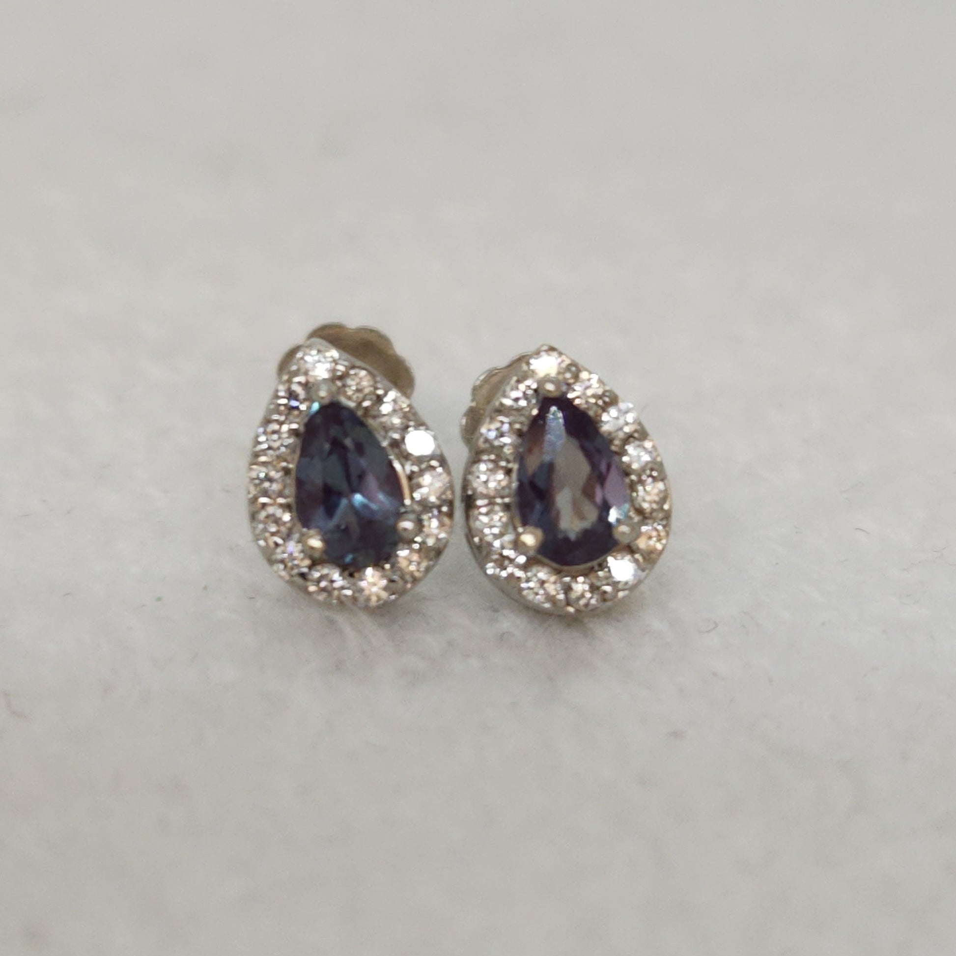 Alexandrite is one of the birthstones for June. It is a unique stone that changes colour in different lights. It will be bluish green in daylight to purplish red under incandescent light. Surrounded by a halo of sparkling diamonds, these earrings come with very secure screw back closures.