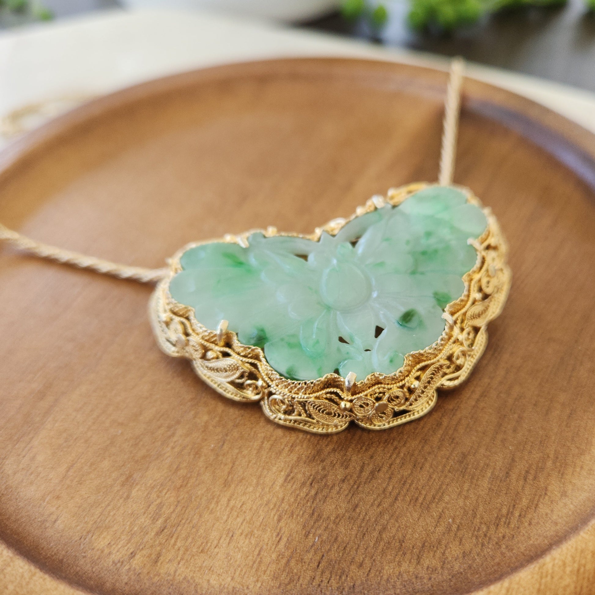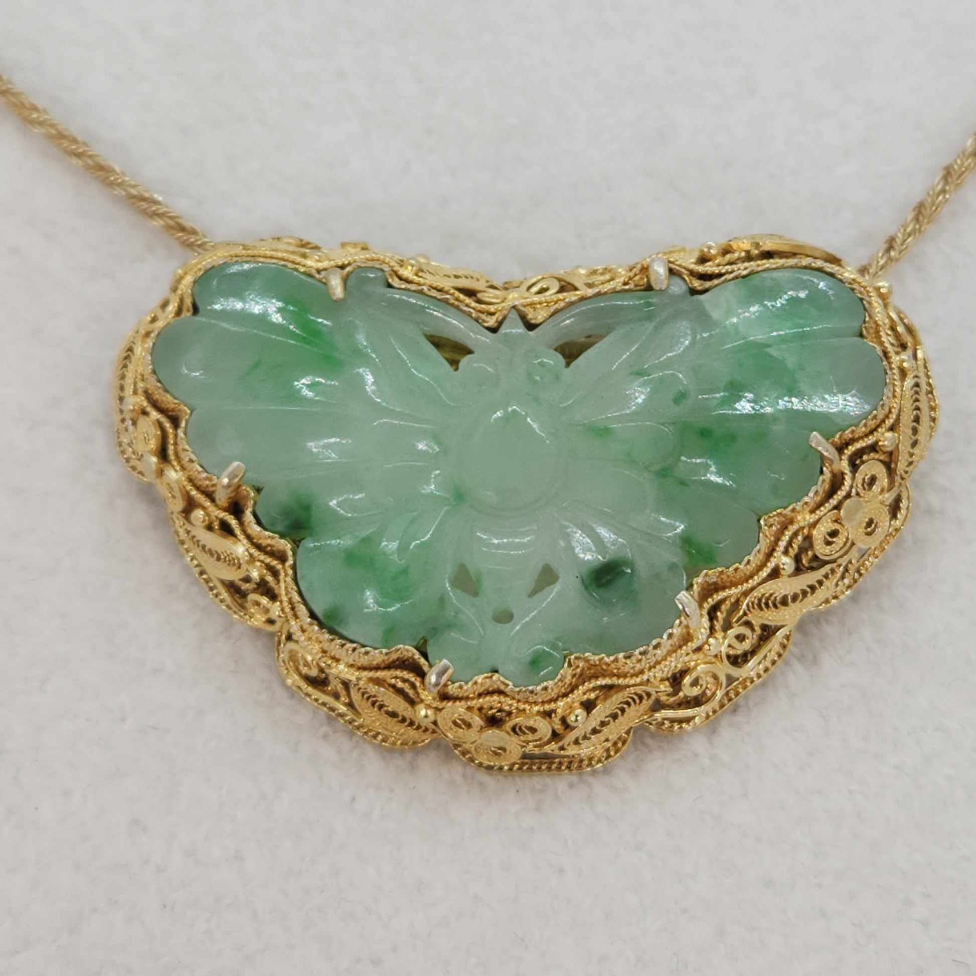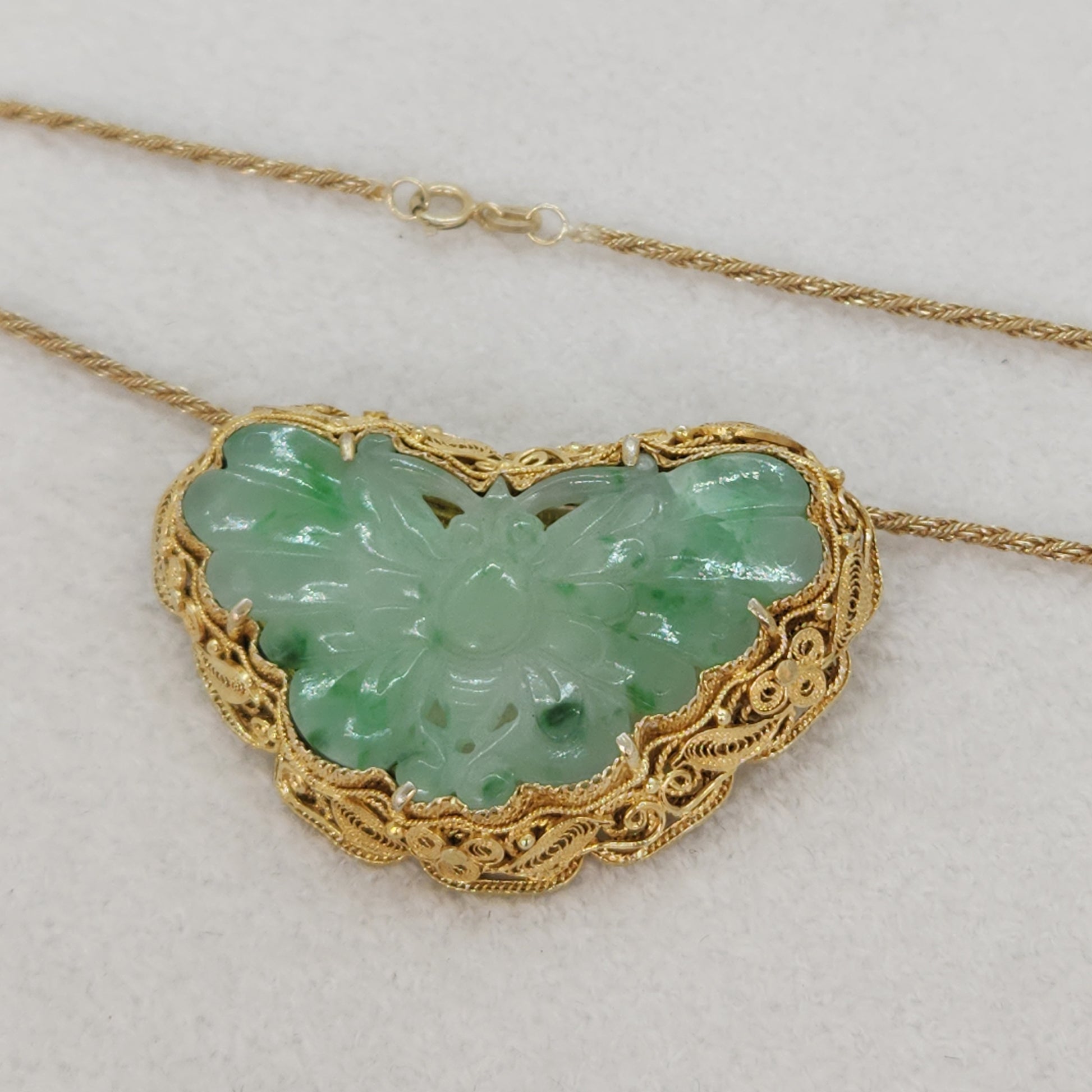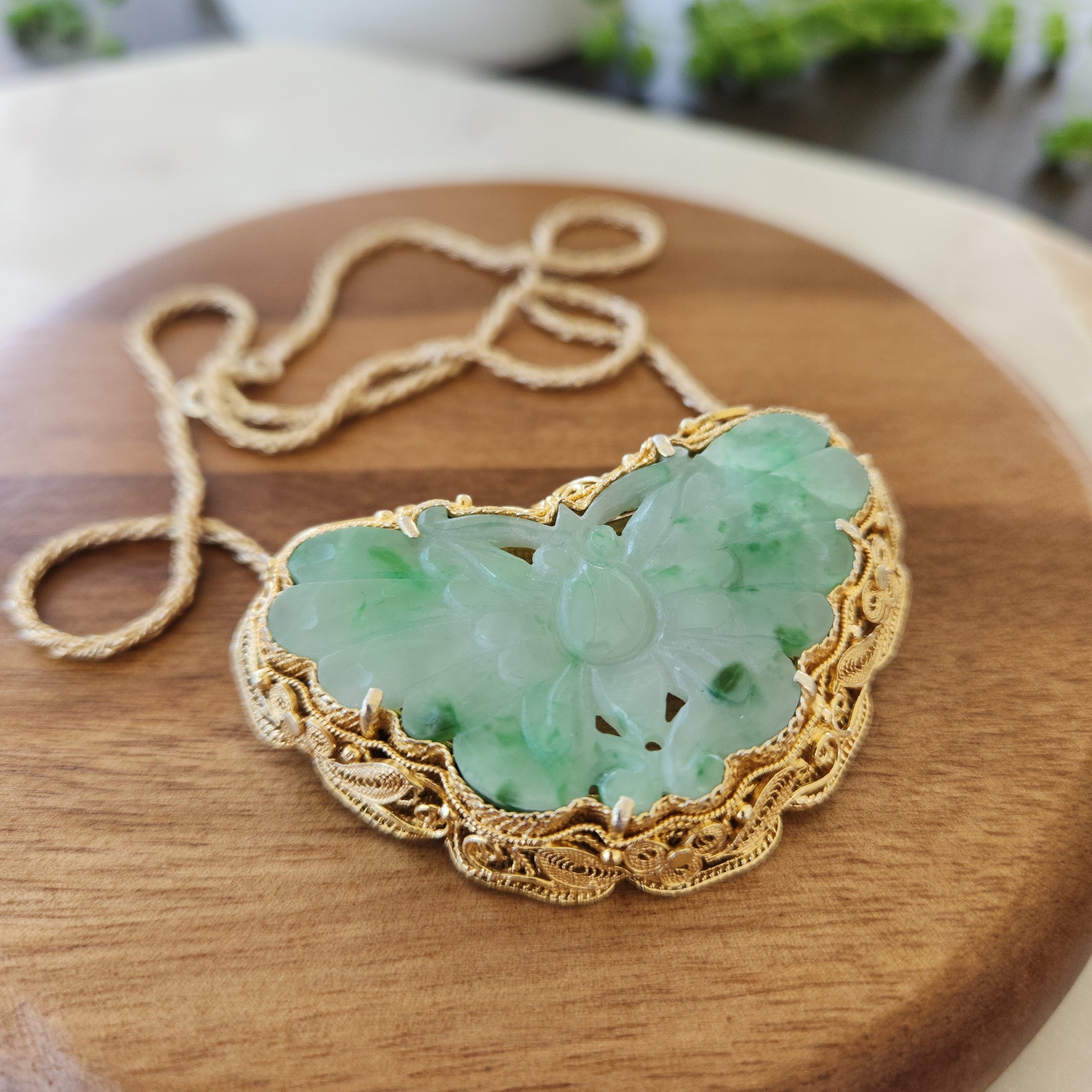 Absolutely stunning detail. This is a carved jade in a butterfly or moth design in a light apple green colouring. The setting is silver with a vermeil (gold) coating and it has all the filigree detail you'd dream of. A intricate and layered design surrounds the jade. This pendant also has a brooch closure at the back, letting you wear this either as a necklace or a brooch depending on your outfit. This has age and character!