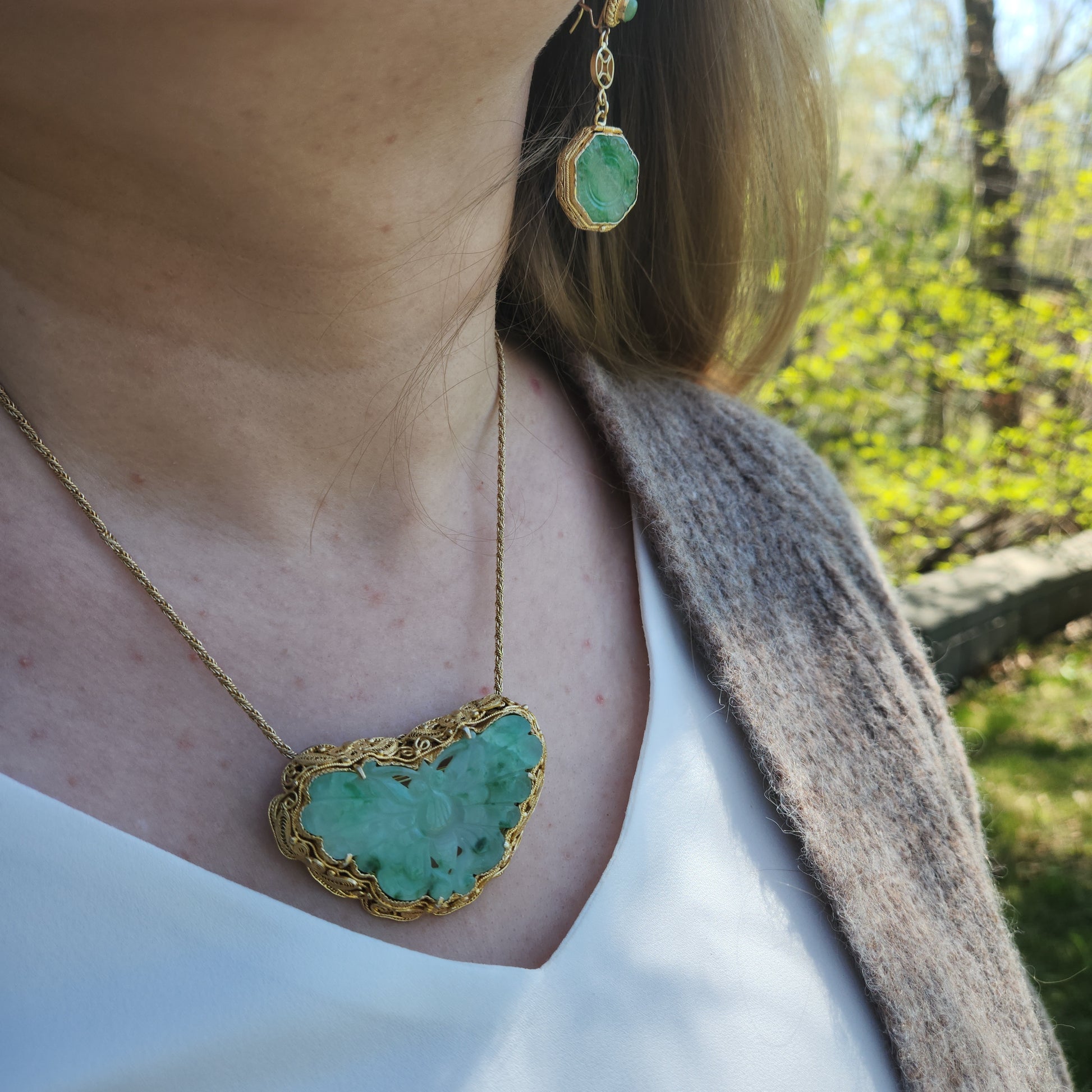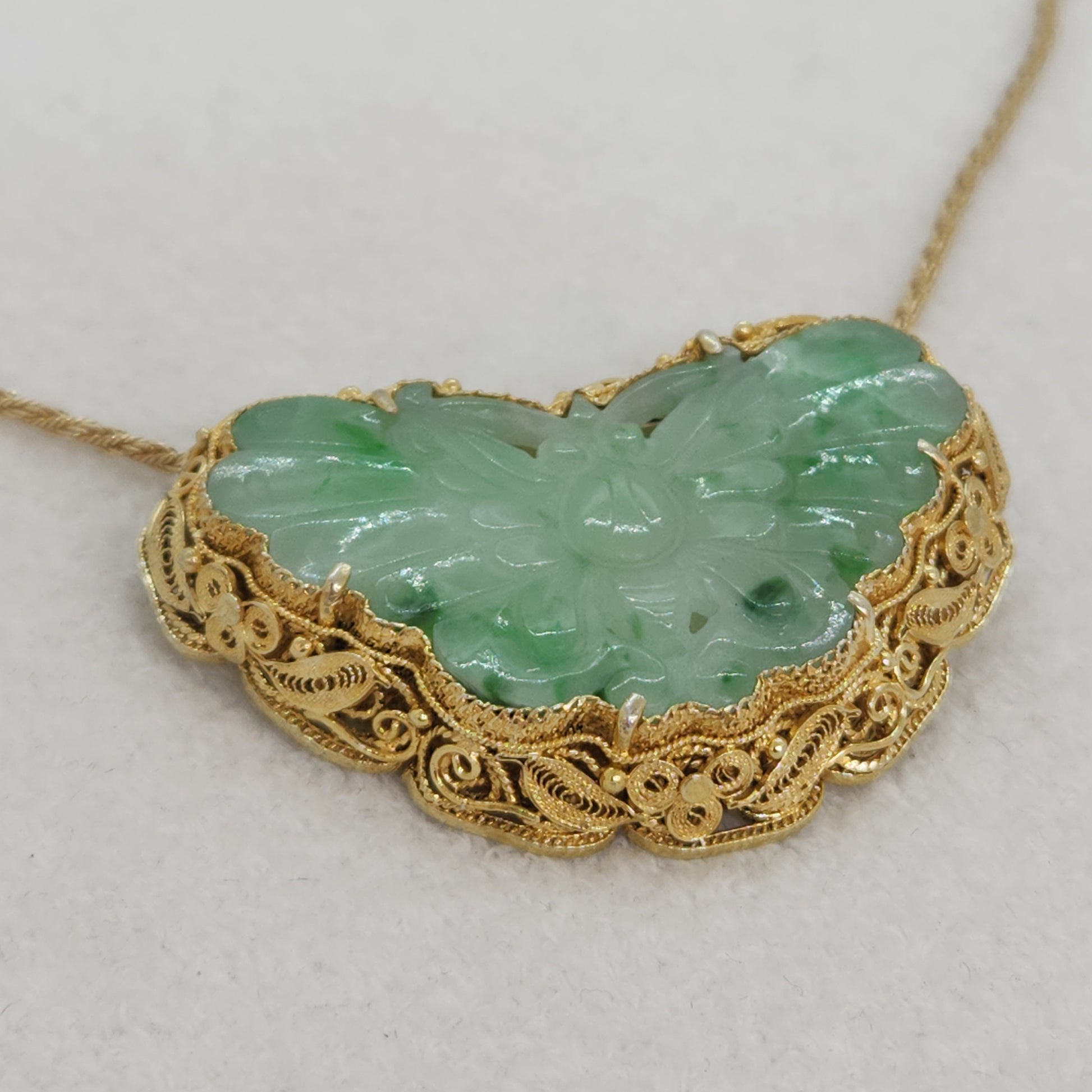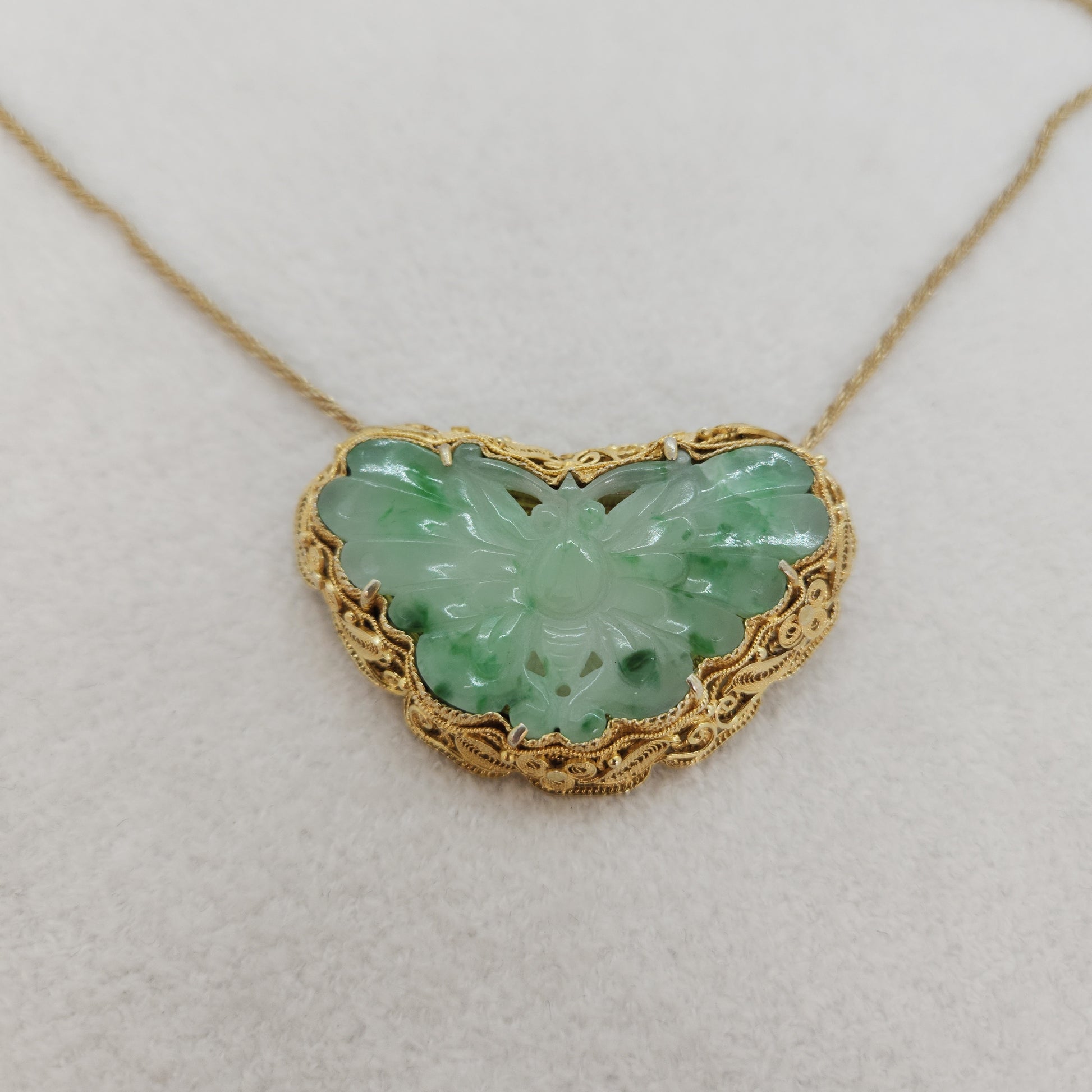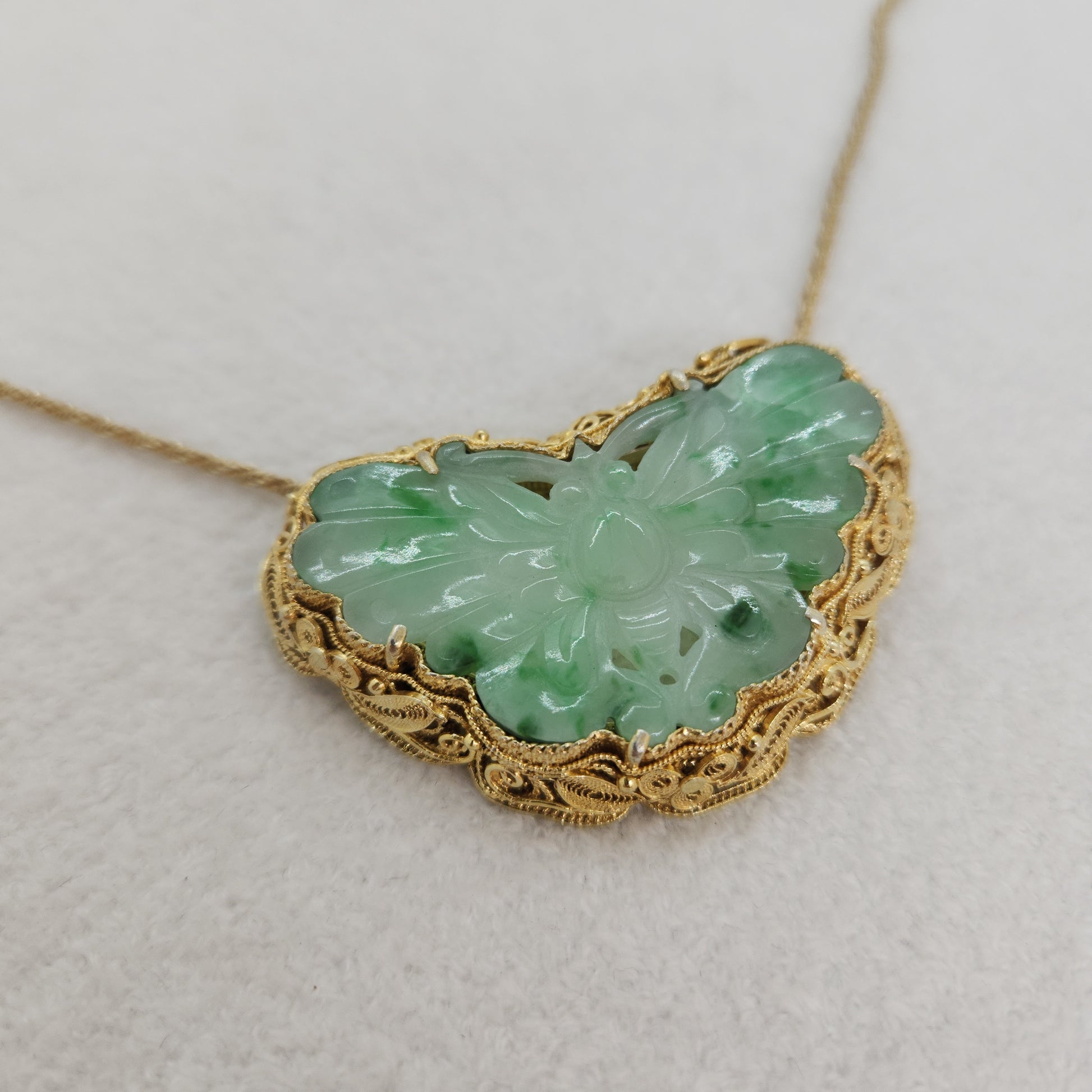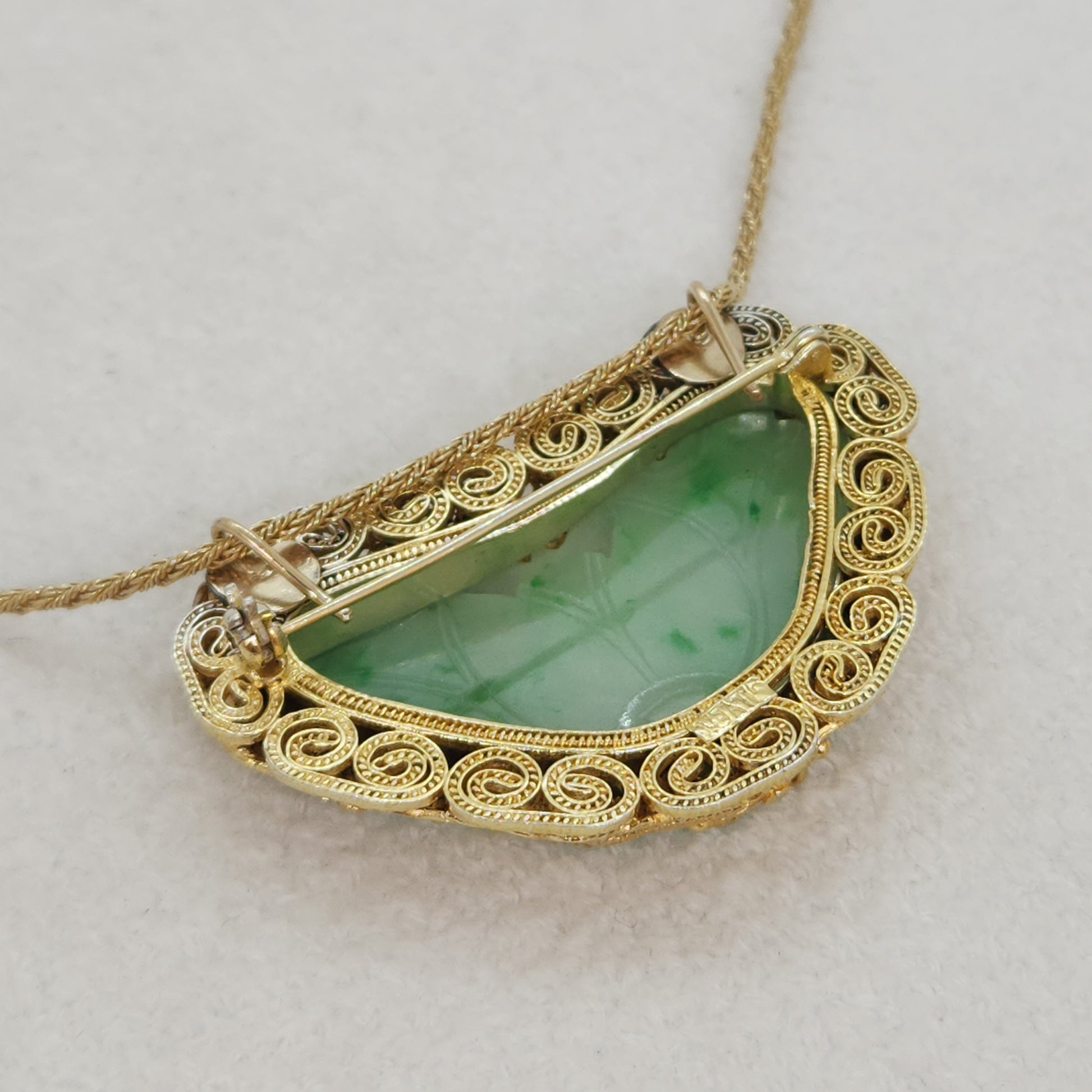 Absolutely stunning detail. This is a carved jade in a butterfly or moth design in a light apple green colouring. The setting is silver with a vermeil (gold) coating and it has all the filigree detail you'd dream of. A intricate and layered design surrounds the jade. This pendant also has a brooch closure at the back, letting you wear this either as a necklace or a brooch depending on your outfit. This has age and character!