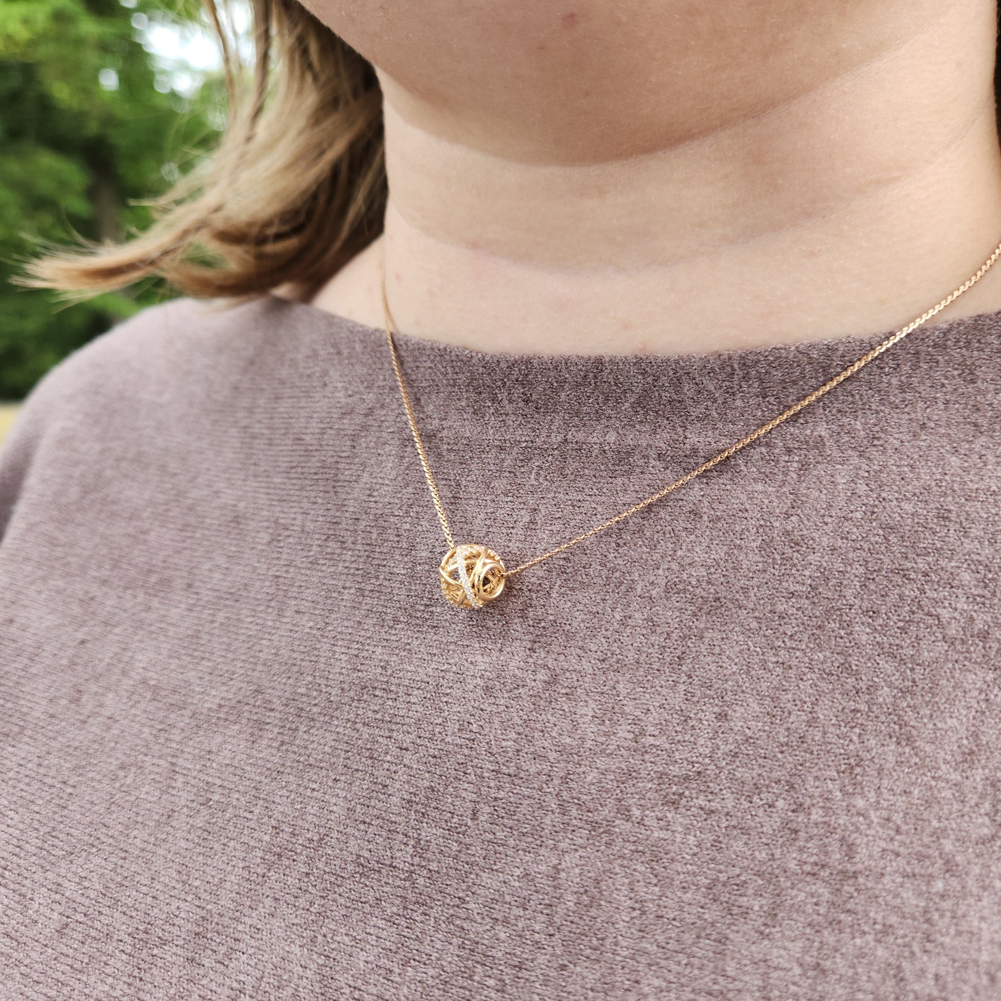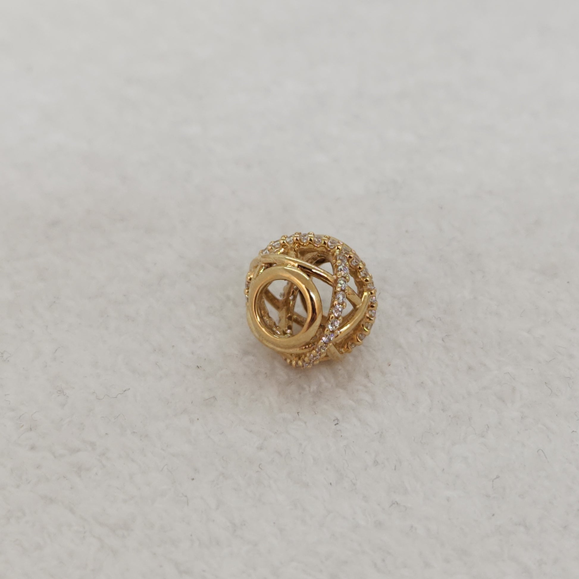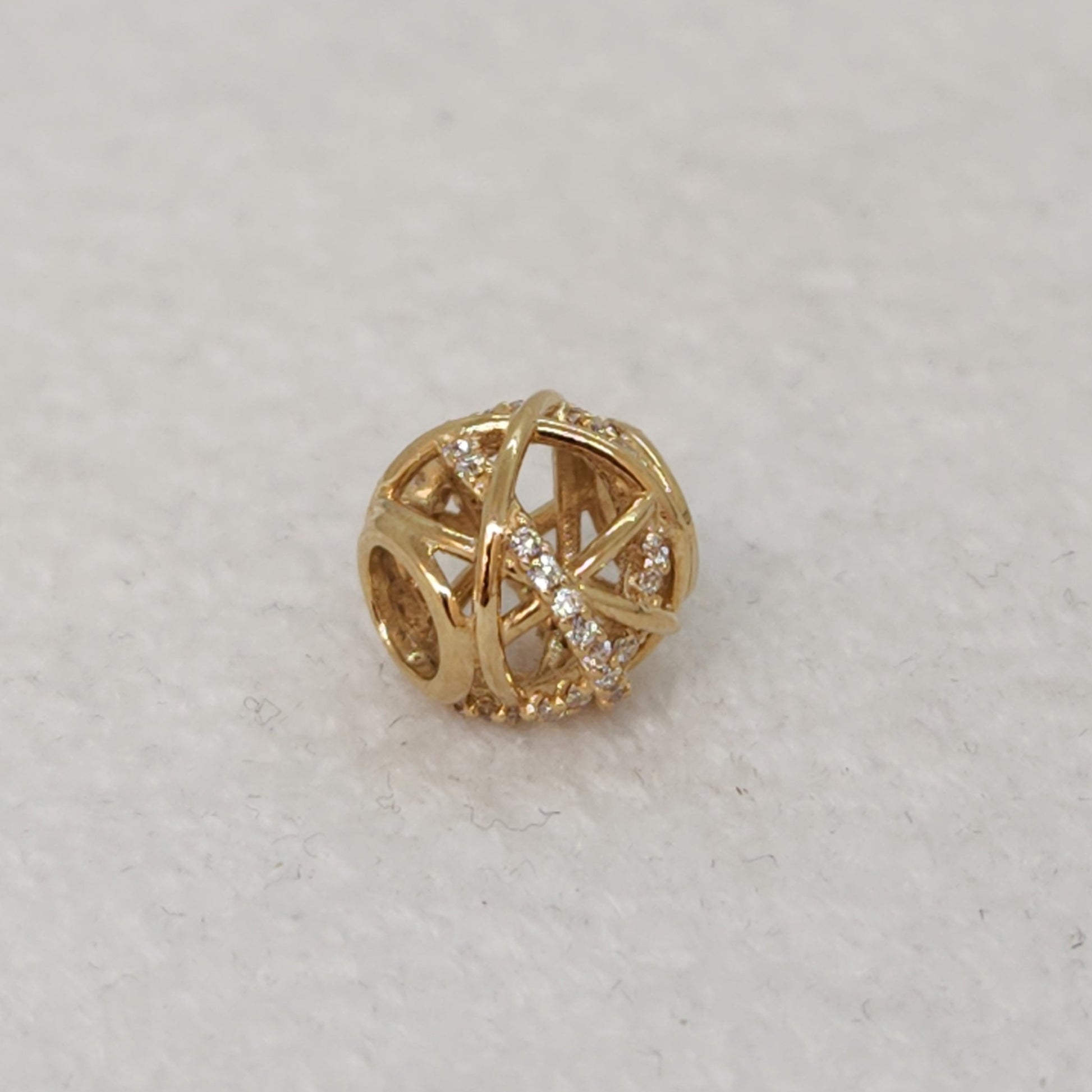 A golden bead with strands of gold and glittering cubics wrapping to form a sphere. Can be strung on a variety of chains, and easily swapped between necklaces and bracelets!