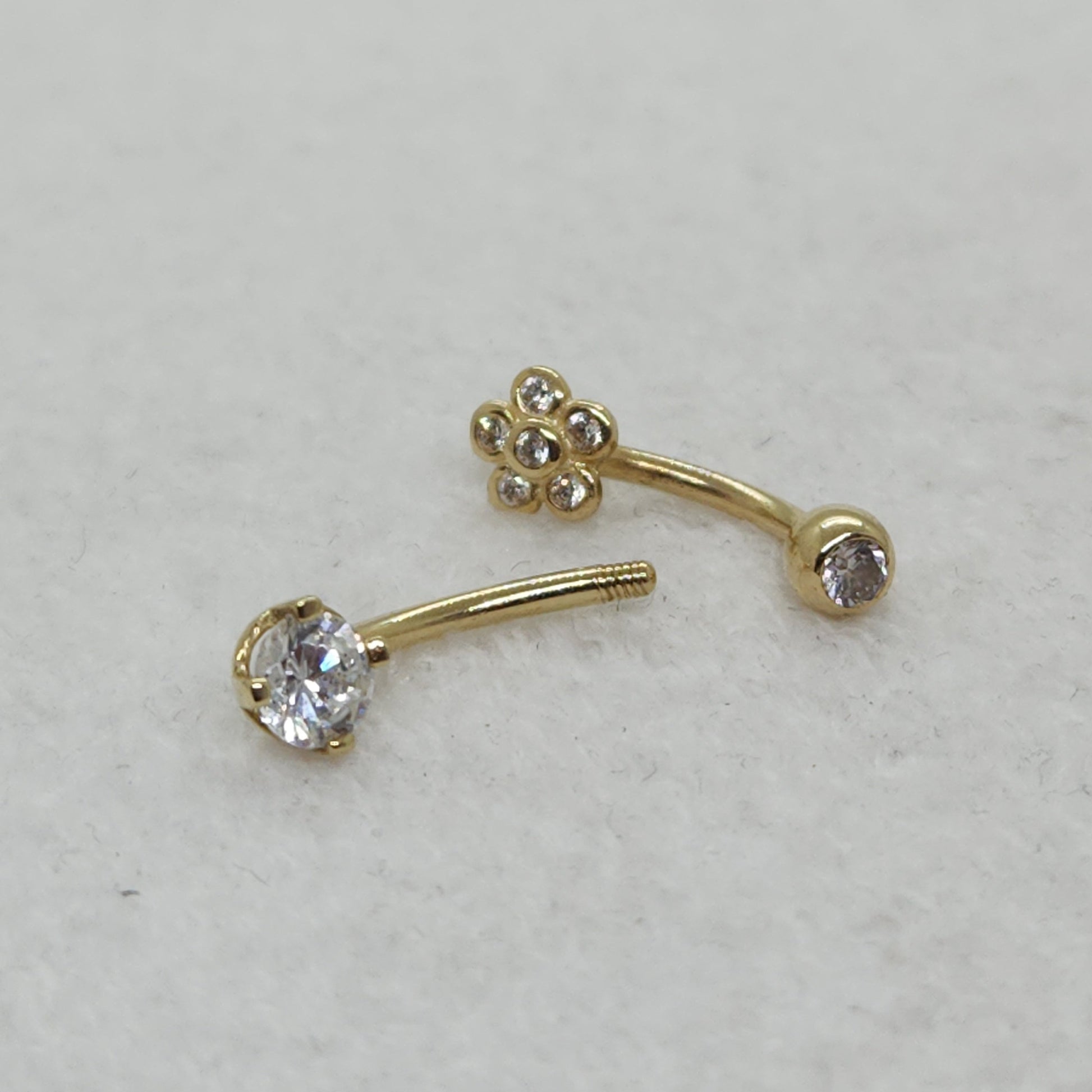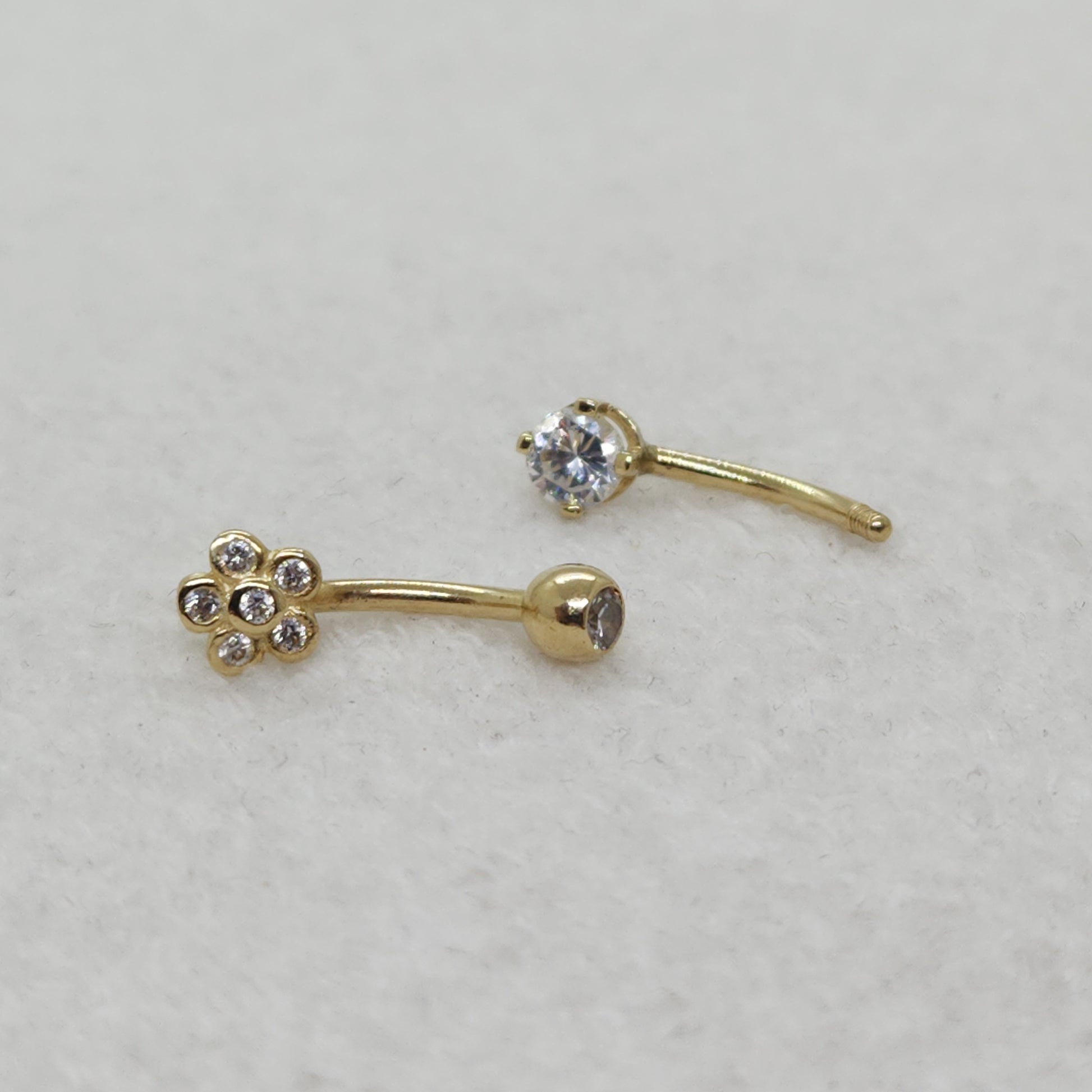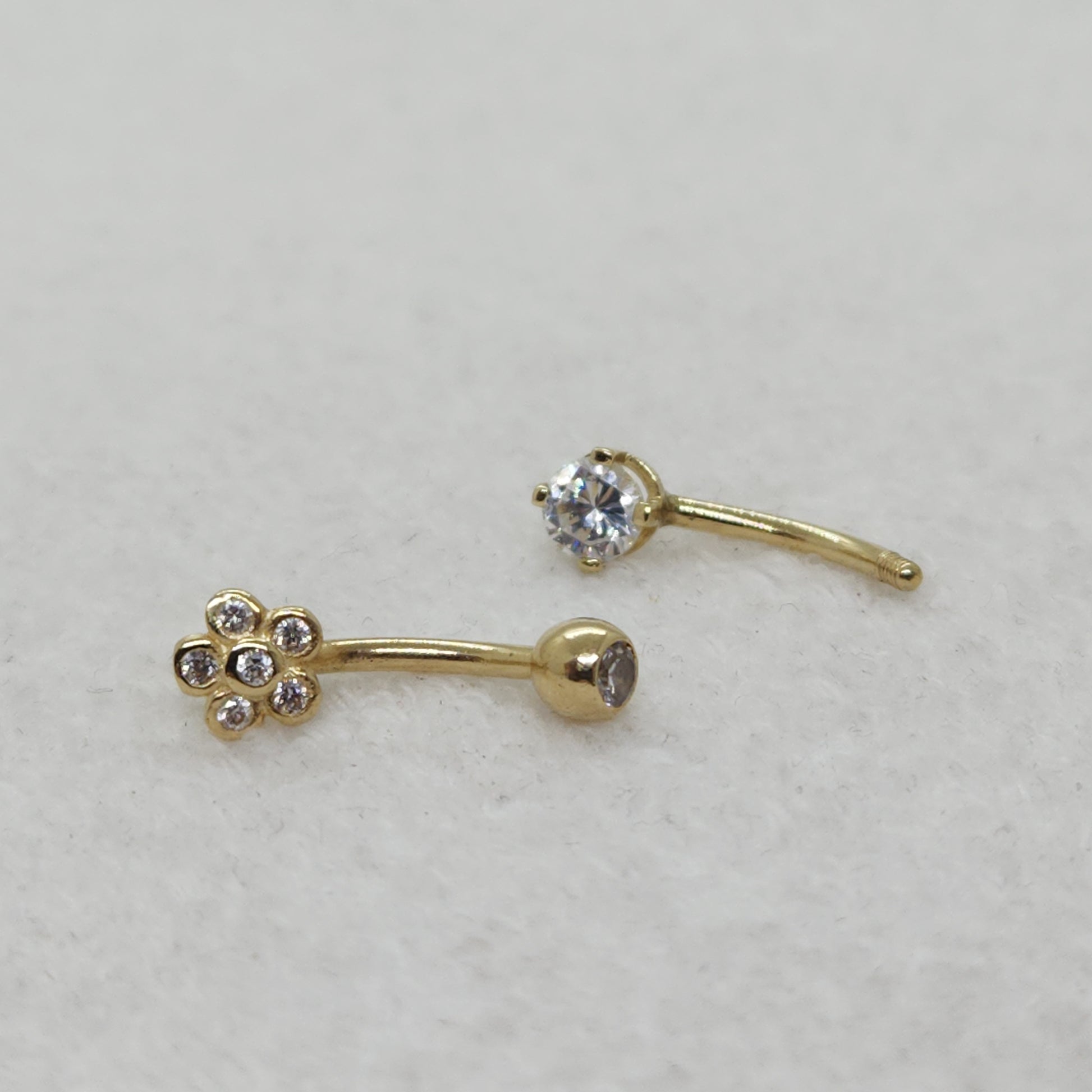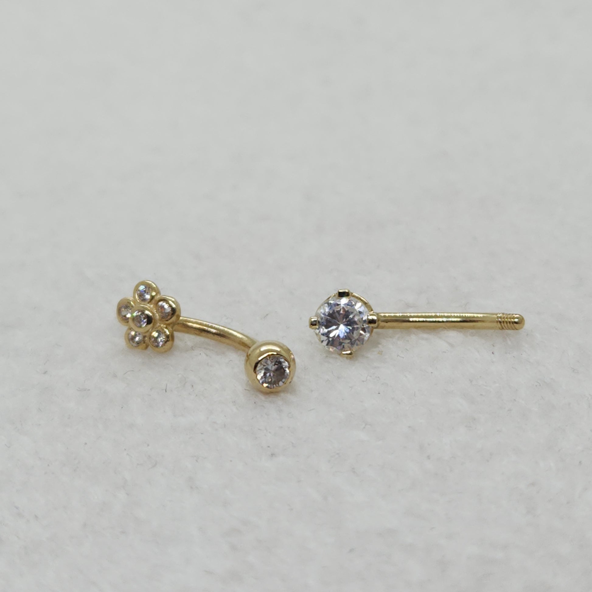 Two for the price of one! A pair of bellybutton rings, one with a small sparkly flower, and the other a simple larger gemstone.