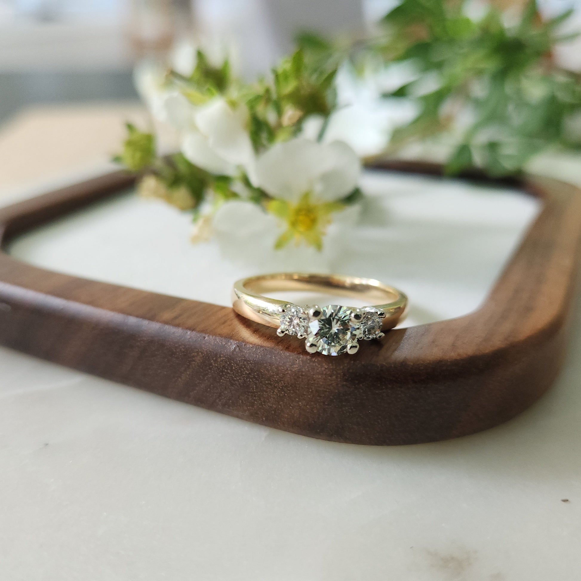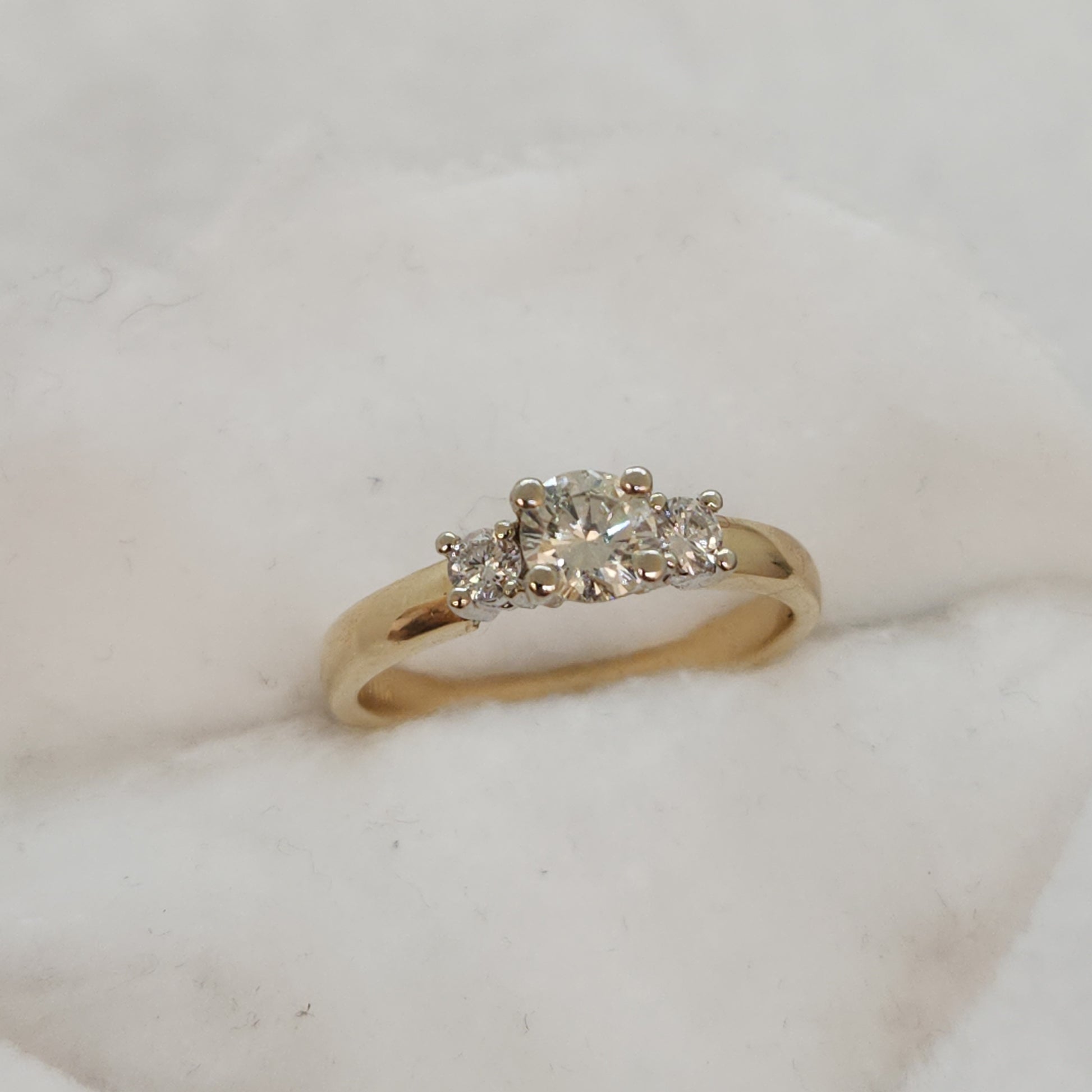 A vintage classic, a three-diamond engagement ring. Often called a trilogy ring, symbolizing a couple's past, present and future together. A classic ring for a classic lady!