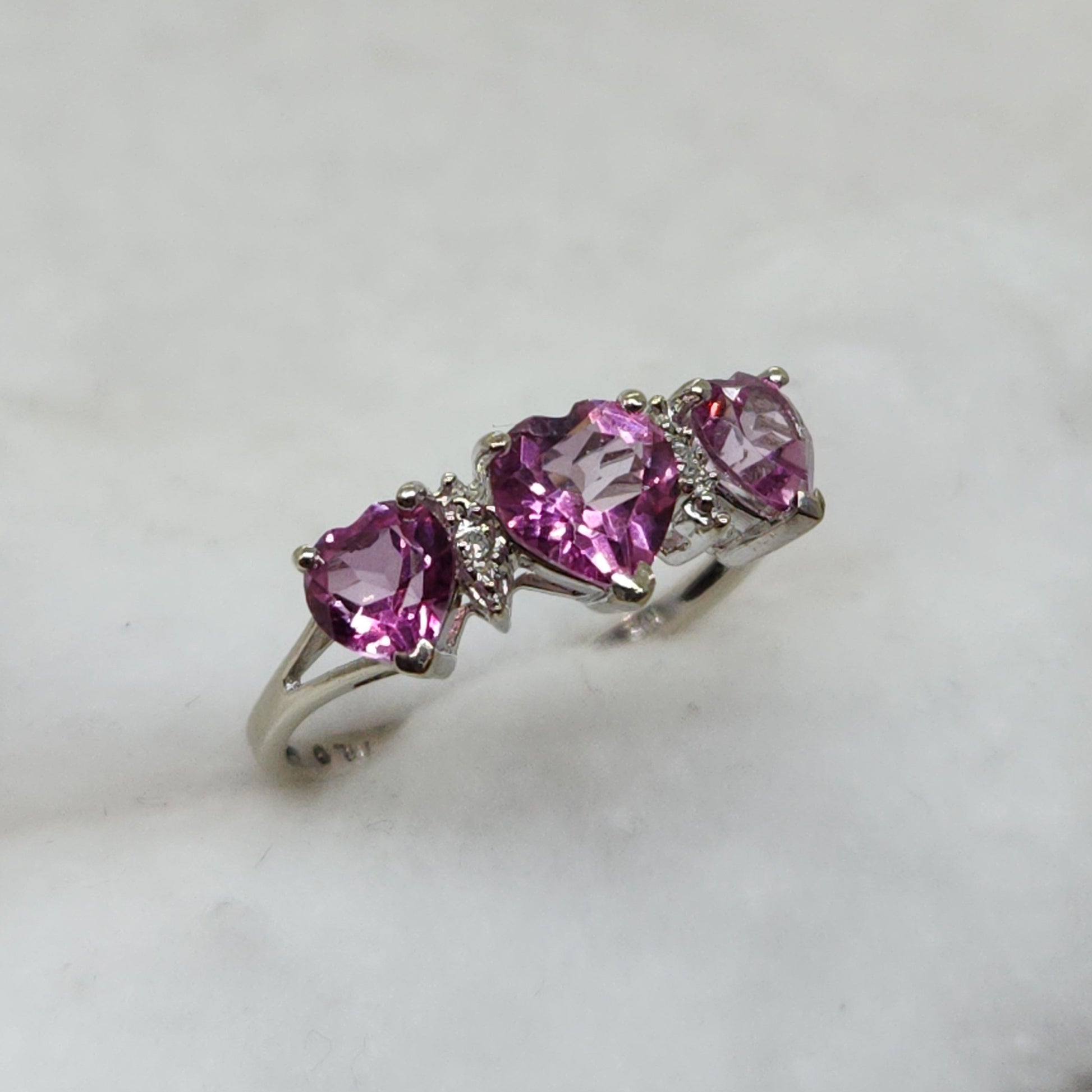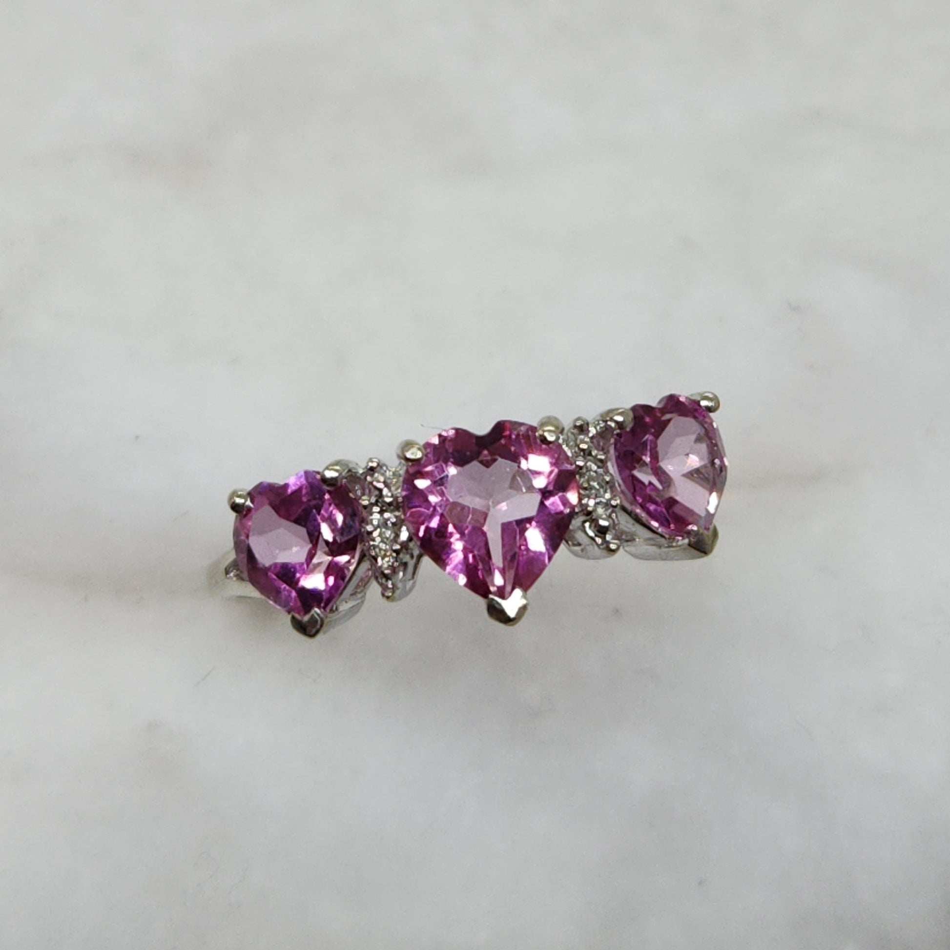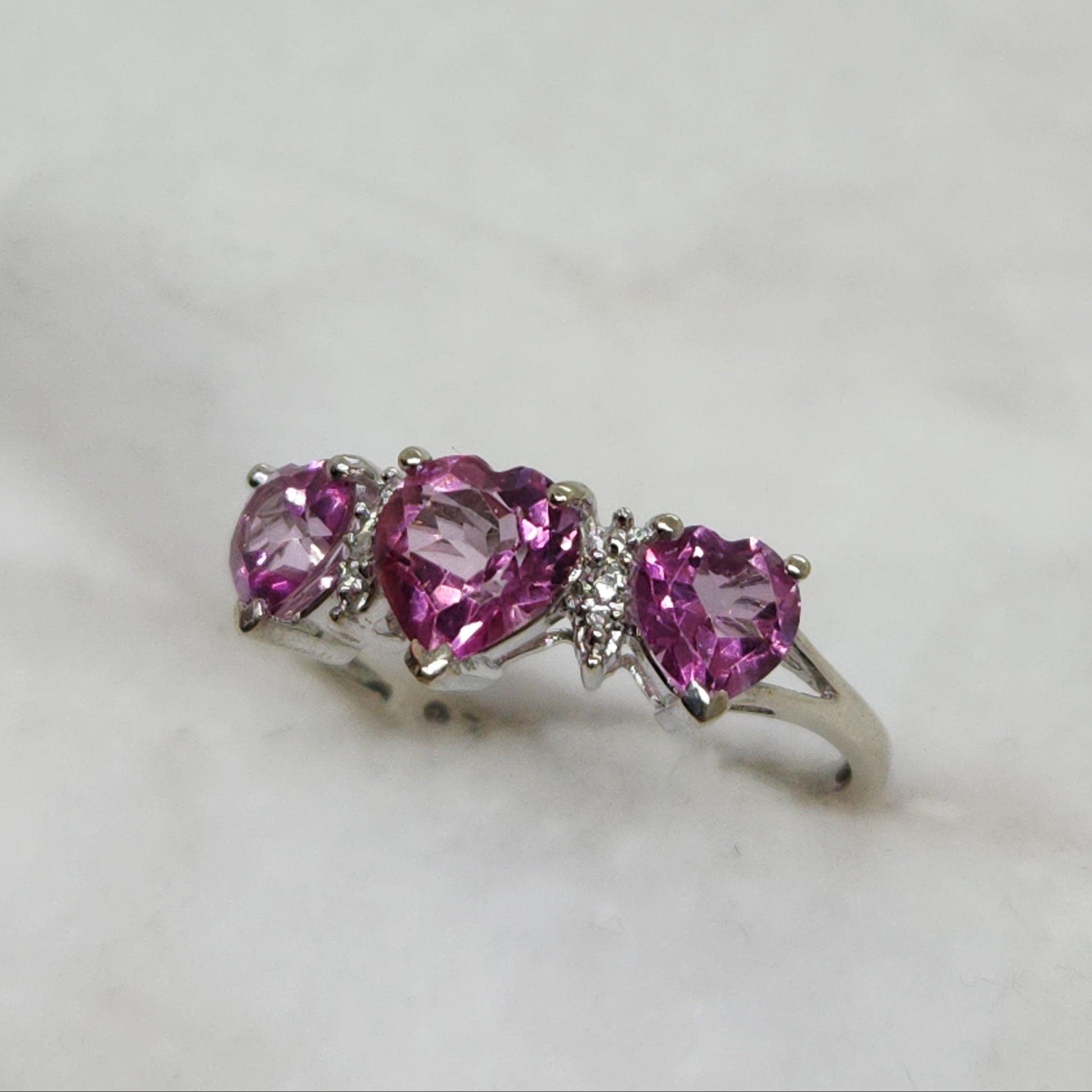Three heart-shaped spinels interspersed with single-cut natural diamonds - perfect for the woman who wears her heart on her sleeve.