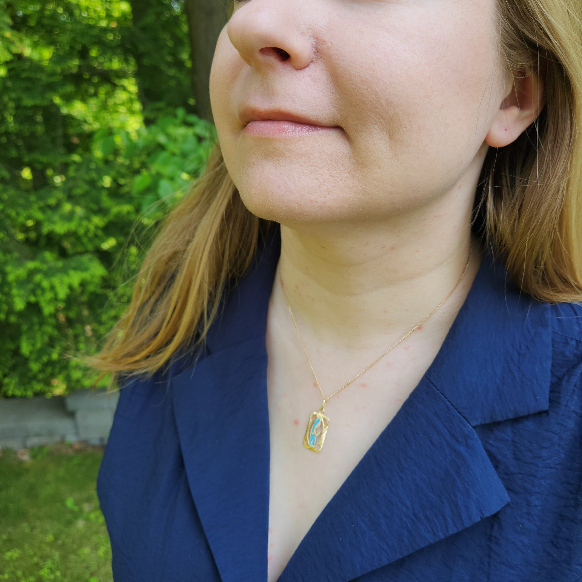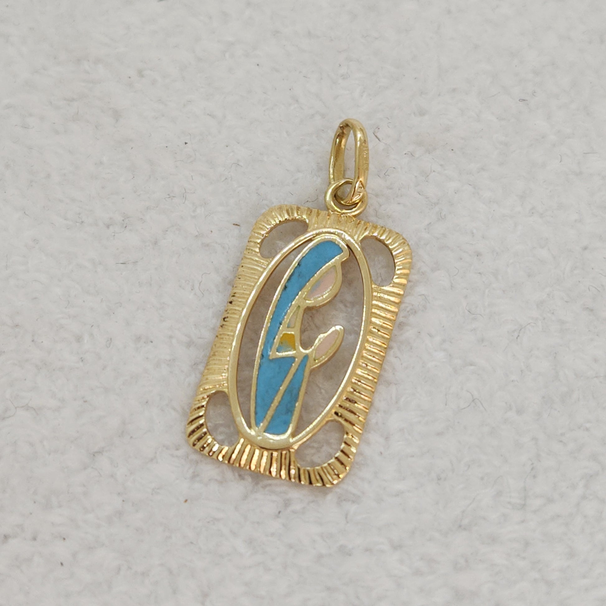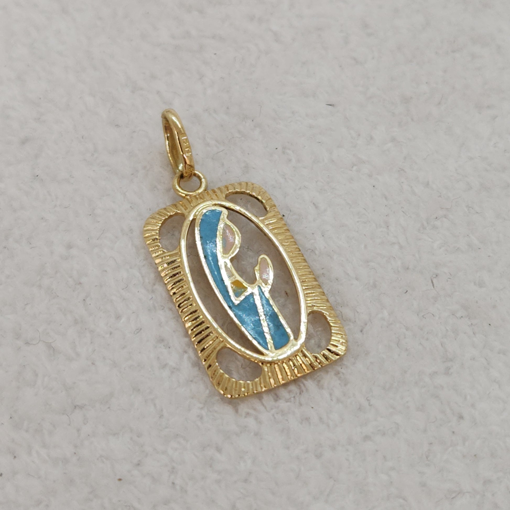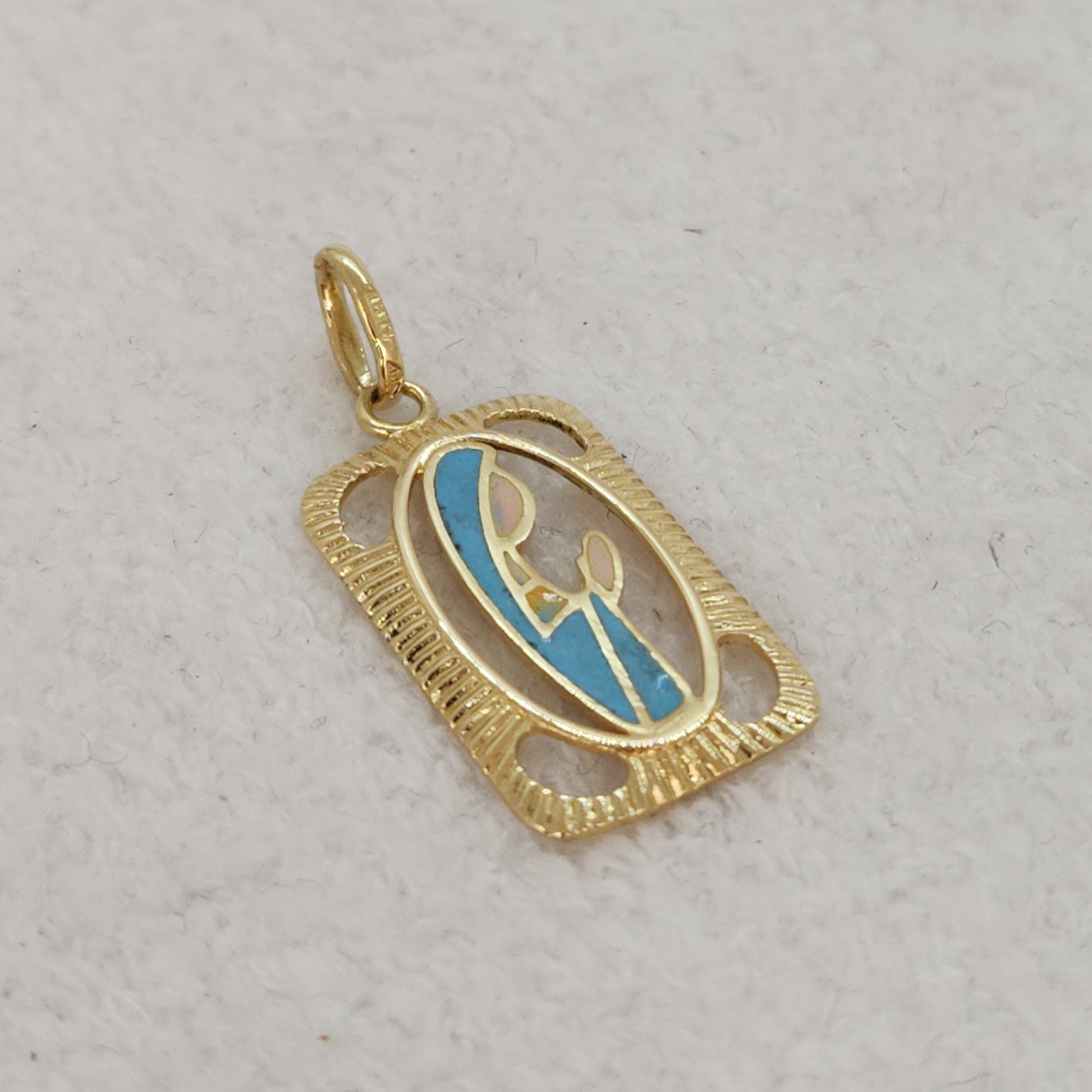 Such elegance...the curved lines so well designed. A beautiful Blessed Mother pendant in a buttery 18k paired with a robin's egg blue enamel. She embodies purity, grace, and maternal love.