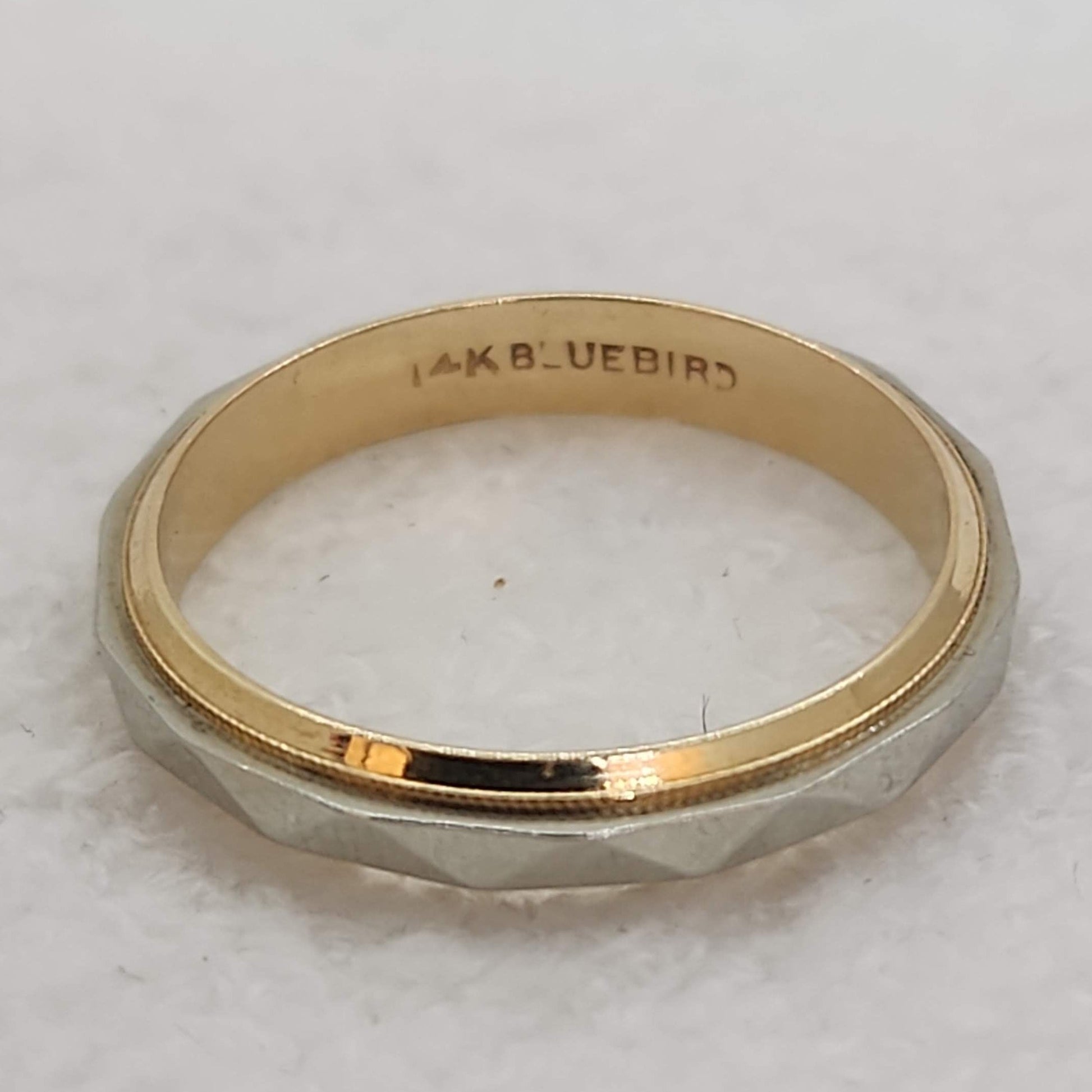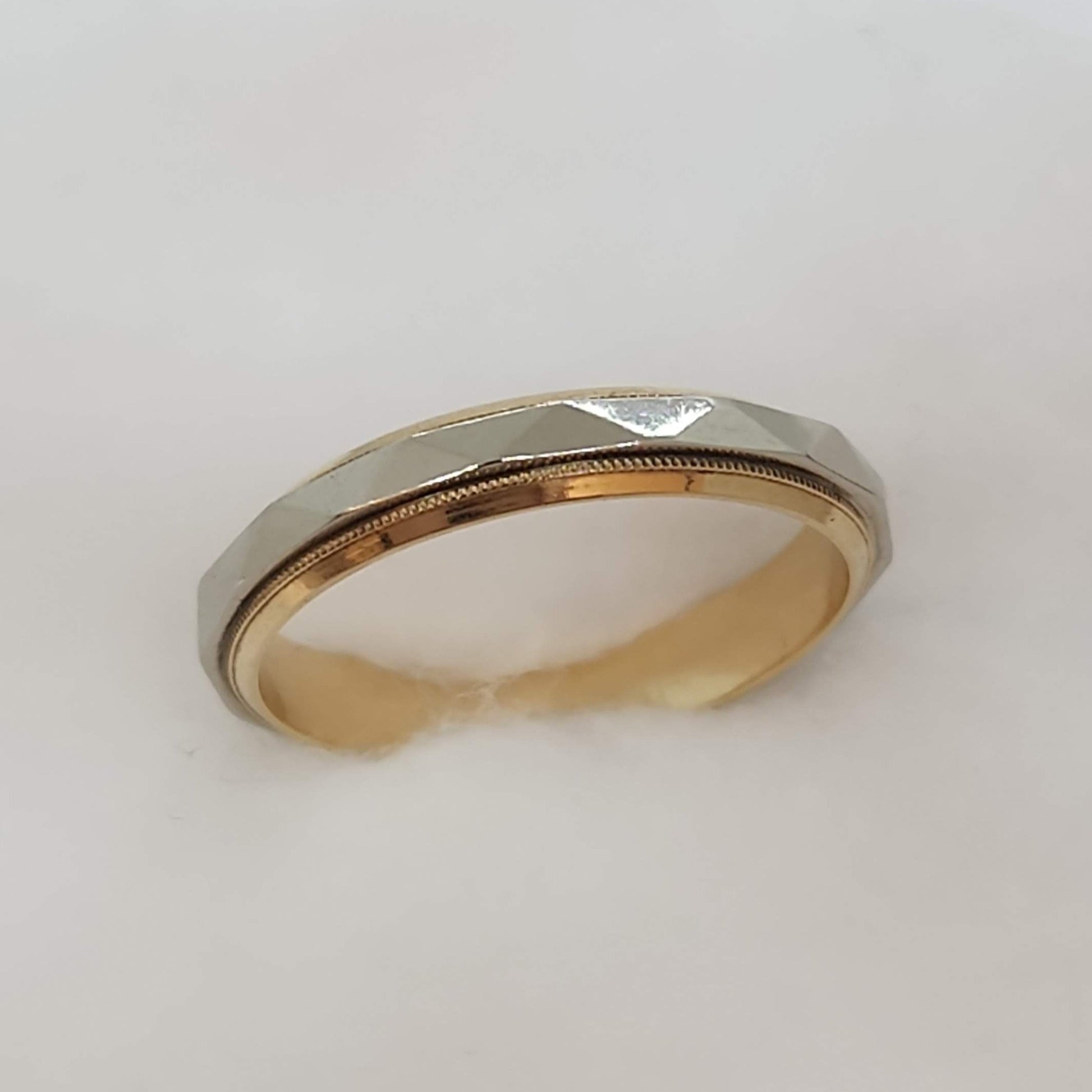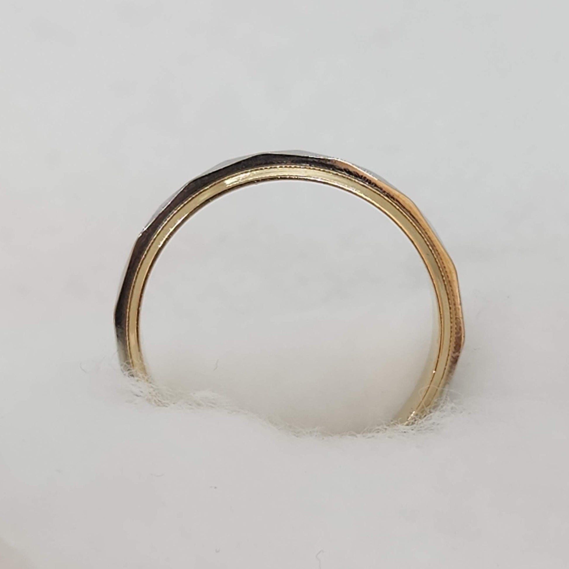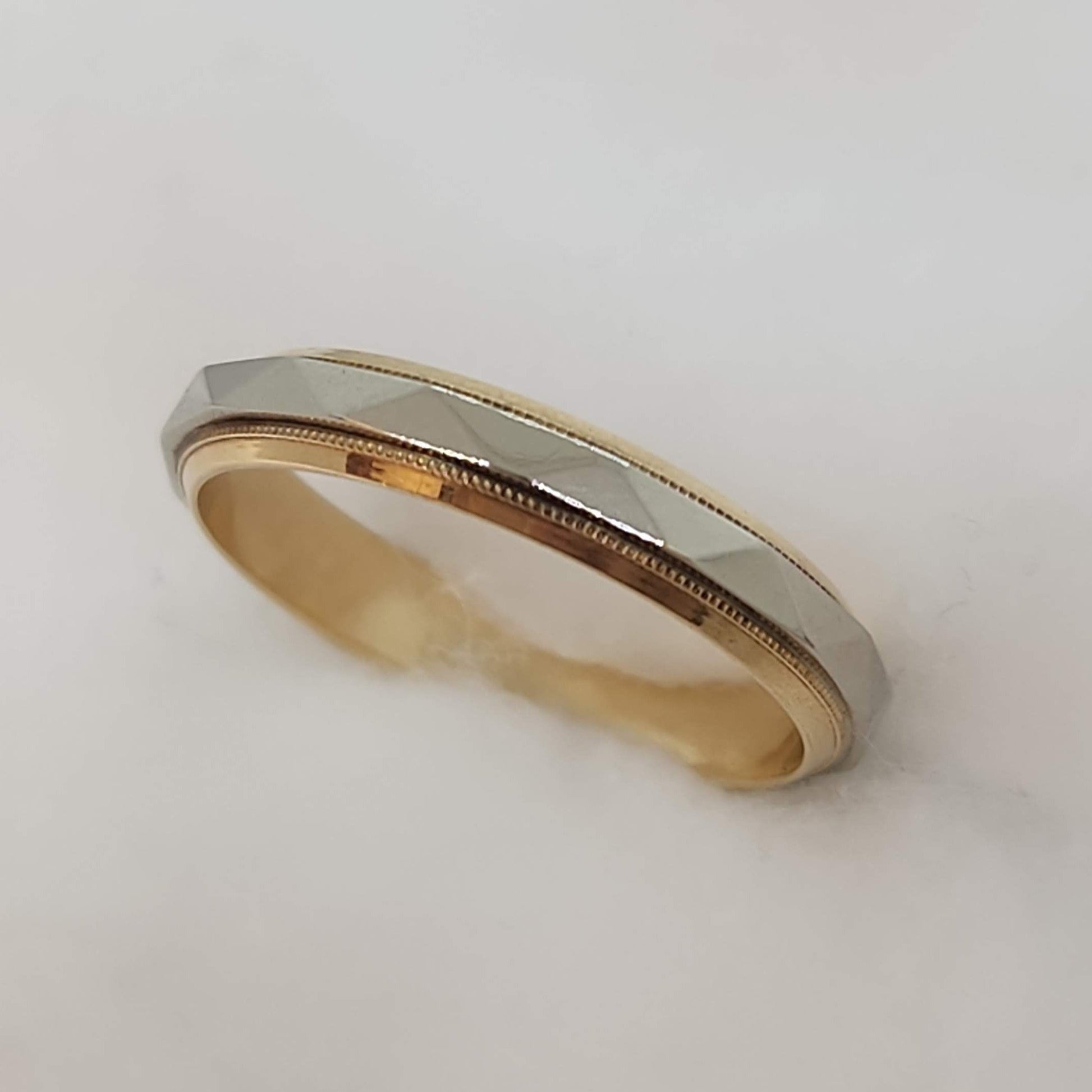 Facets can't help but catch the light in this beautiful two tone band. Each edge is framed with both a miligrain detail and a highly polished bevelled edge. A very eye catching band.