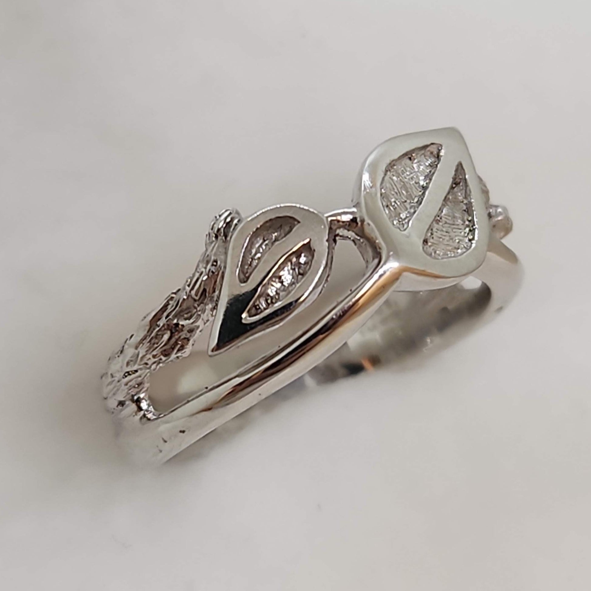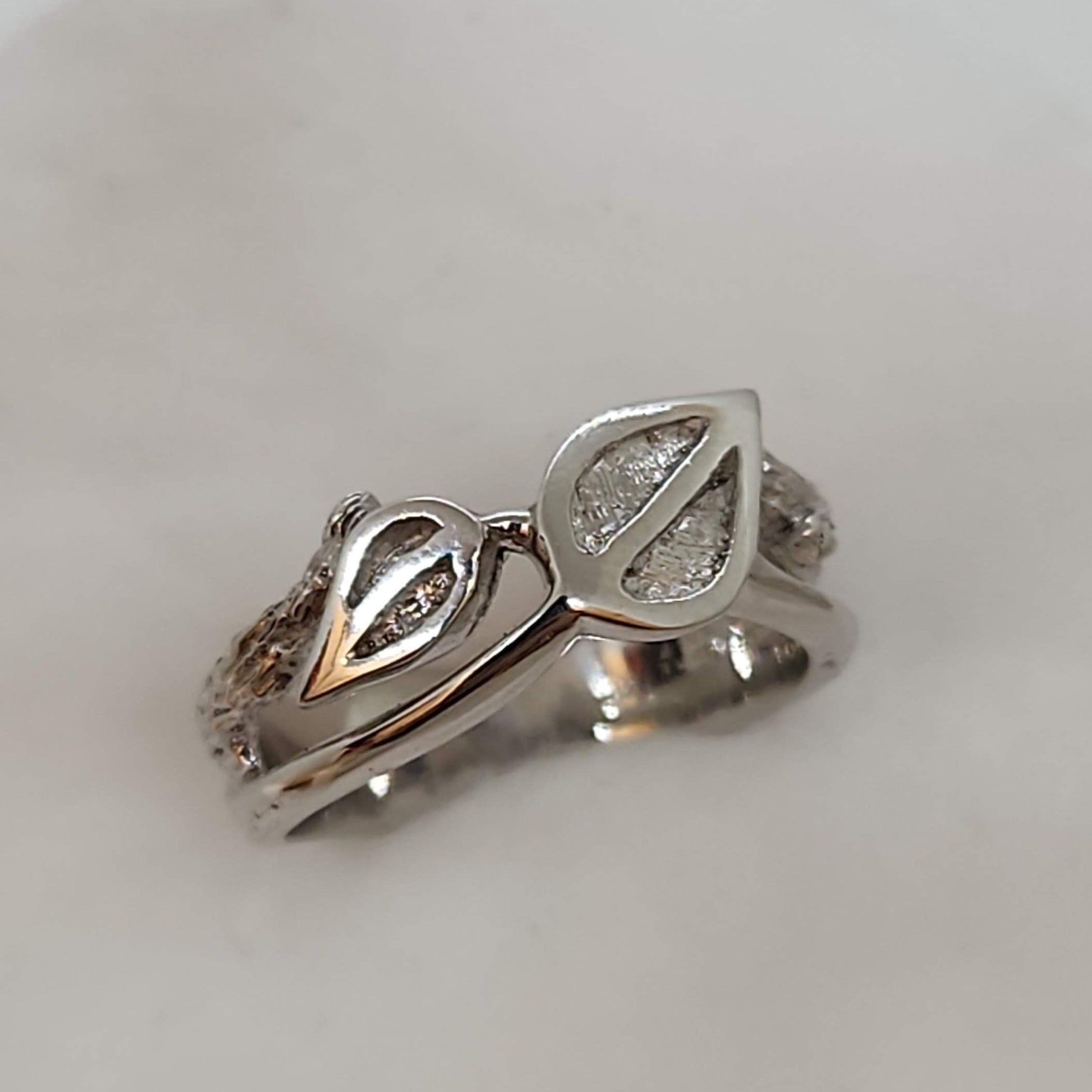 Designed and made by Marigold Design Studio, this is part of a small nature series. Beautiful on it's own or paired with an engagement ring. The space between the two leaves makes for a perfect spot for an engagement ring to settle into.