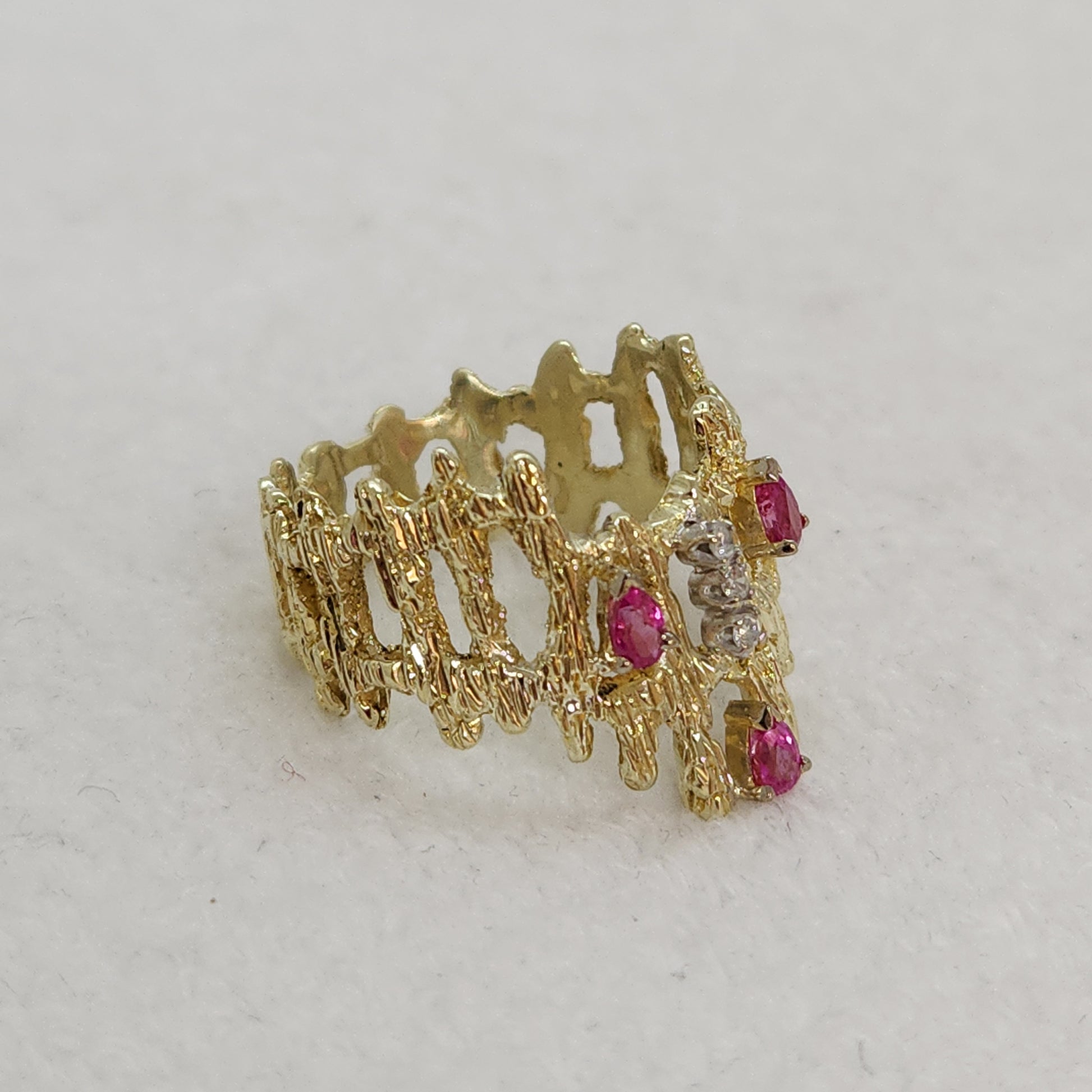A prime showcasing of the Brutalist style. This radical style of jewelry is typified by massive, jagged and highly abstract designs that are at once intriguing and perhaps slightly disquieting. The pink pear cut sapphires instantly pop against the highly textured bark-like surface.