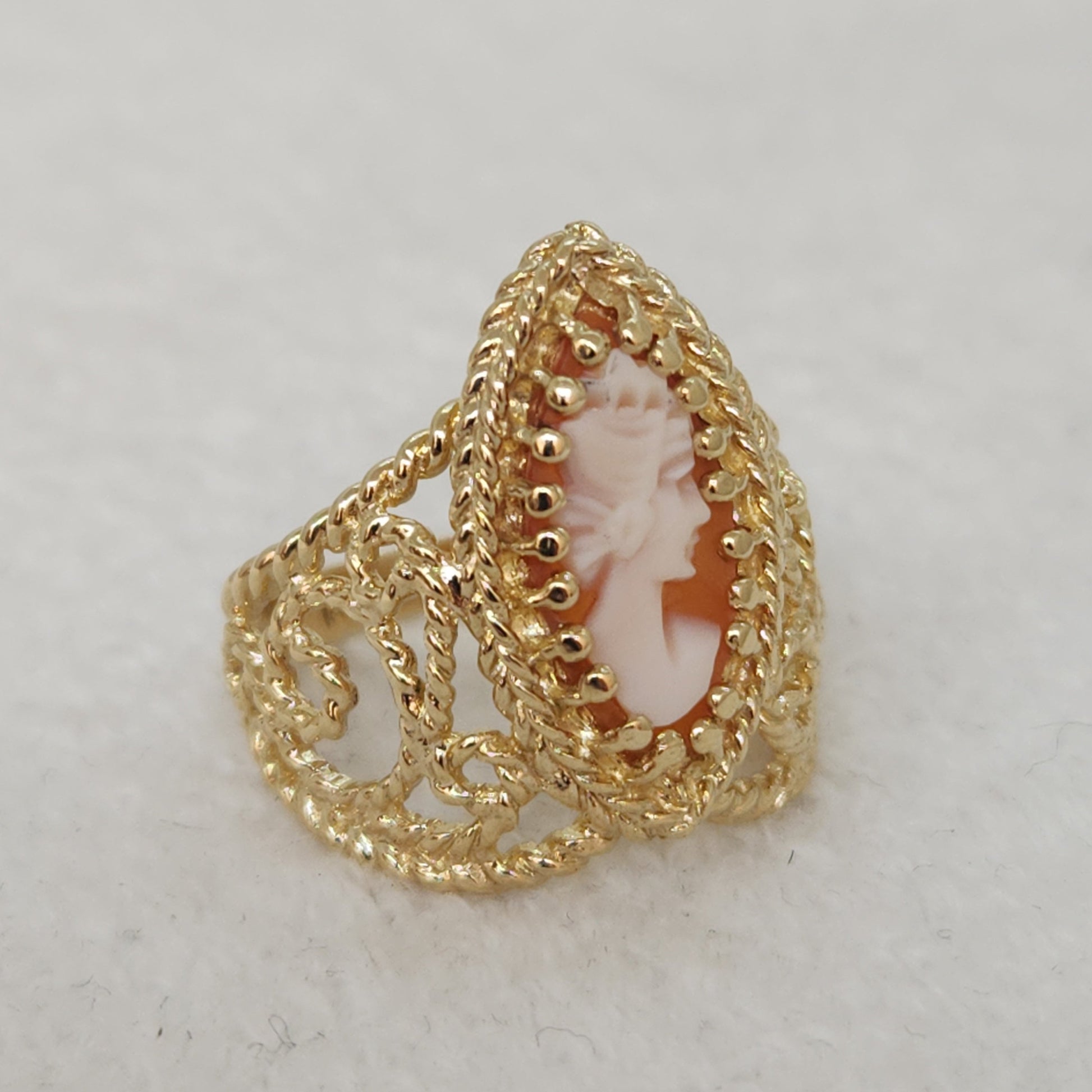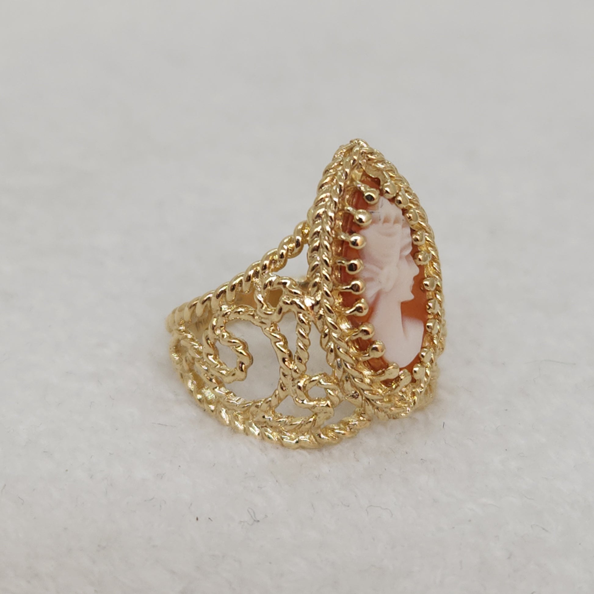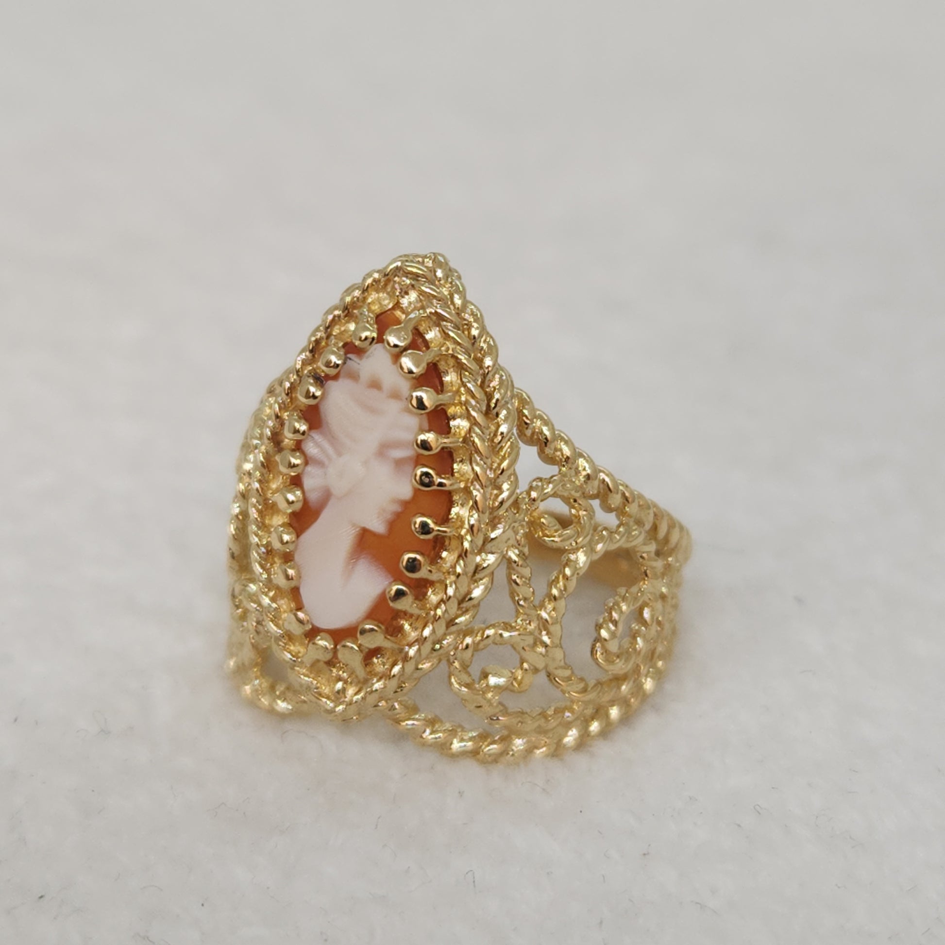 This carved shell cameo celebrates the "anonymous woman" a representation of woman's beauty and grace. Surrounded by a rope design, this ring has a strong presence. Wear it with pride!