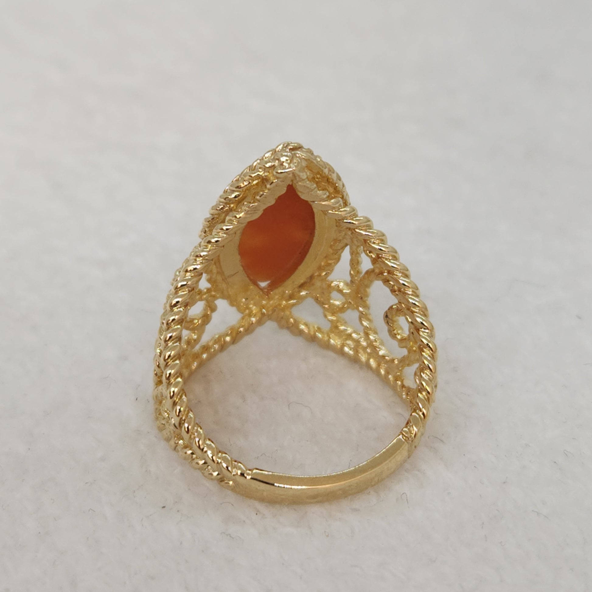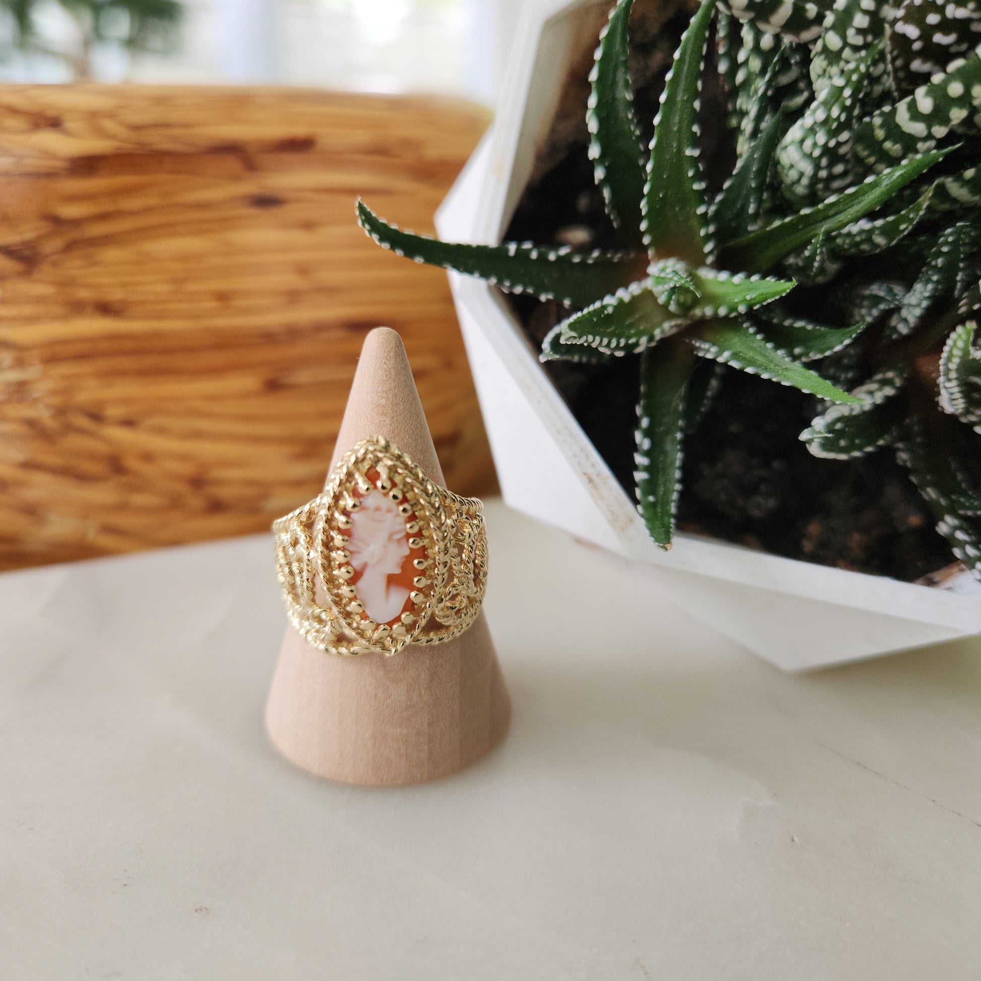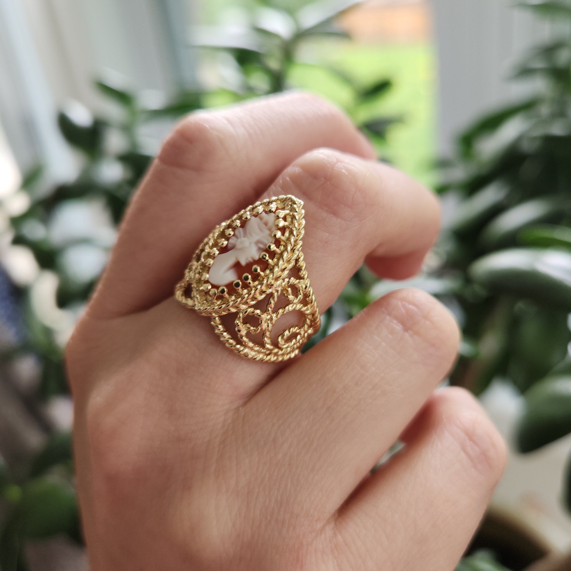 This carved shell cameo celebrates the "anonymous woman" a representation of woman's beauty and grace. Surrounded by a rope design, this ring has a strong presence. Wear it with pride!