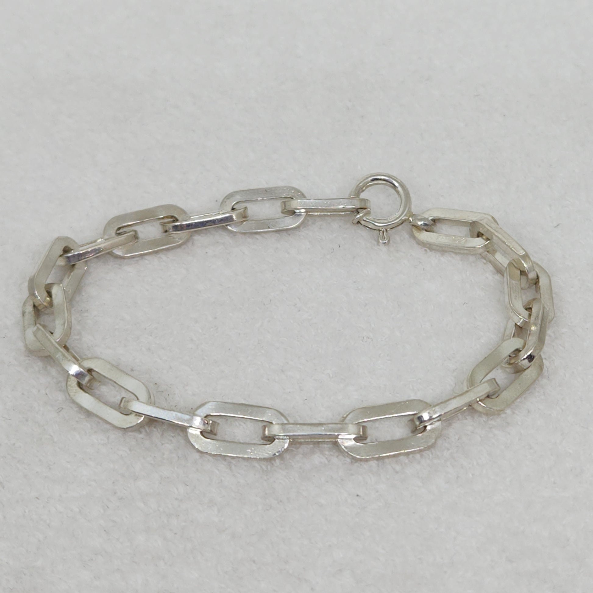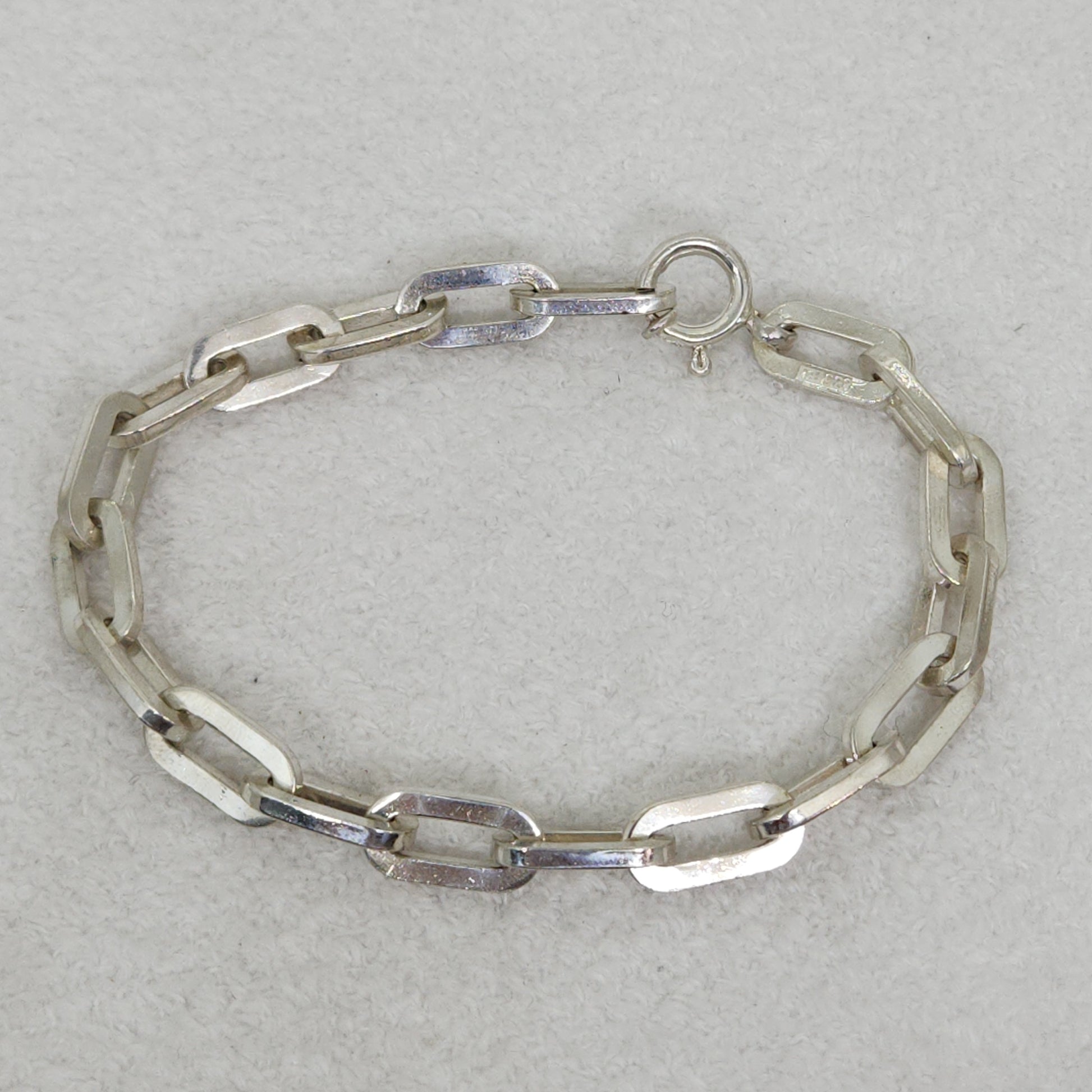 Bold and chunky! 18 squared off silver links comprise this simple, yet bold bracelet. It is German-made by renowned silversmith company Friedrich Binder Mönsheim, known for quality craftsmanship in chains, bracelets, and other pieces, often featuring modernist designs. The Friedrich Binder company was founded by the chain maker, Friedrich Binder, in Mönsheim in March 1910. The 835 mark indicates an older European silver standard. Entirely unisex, add this for a bit of fun to your outfit!