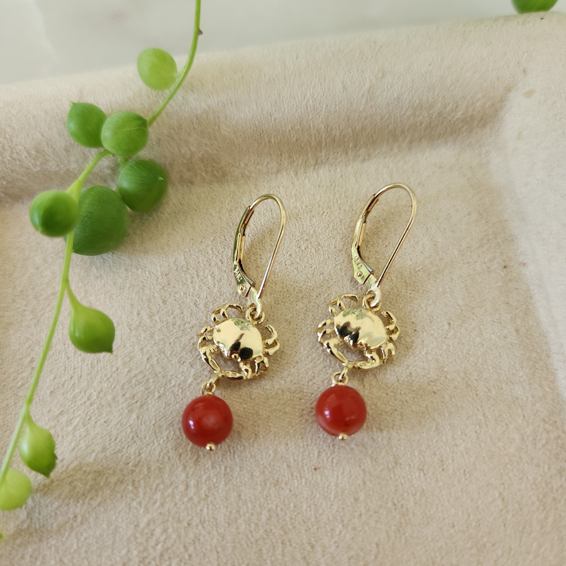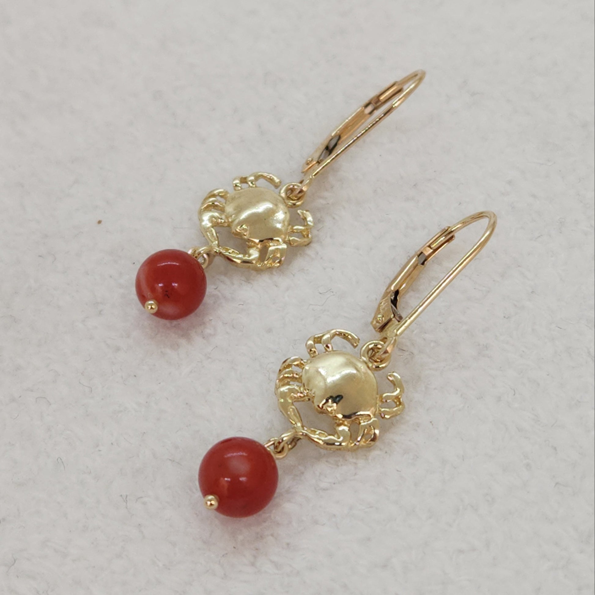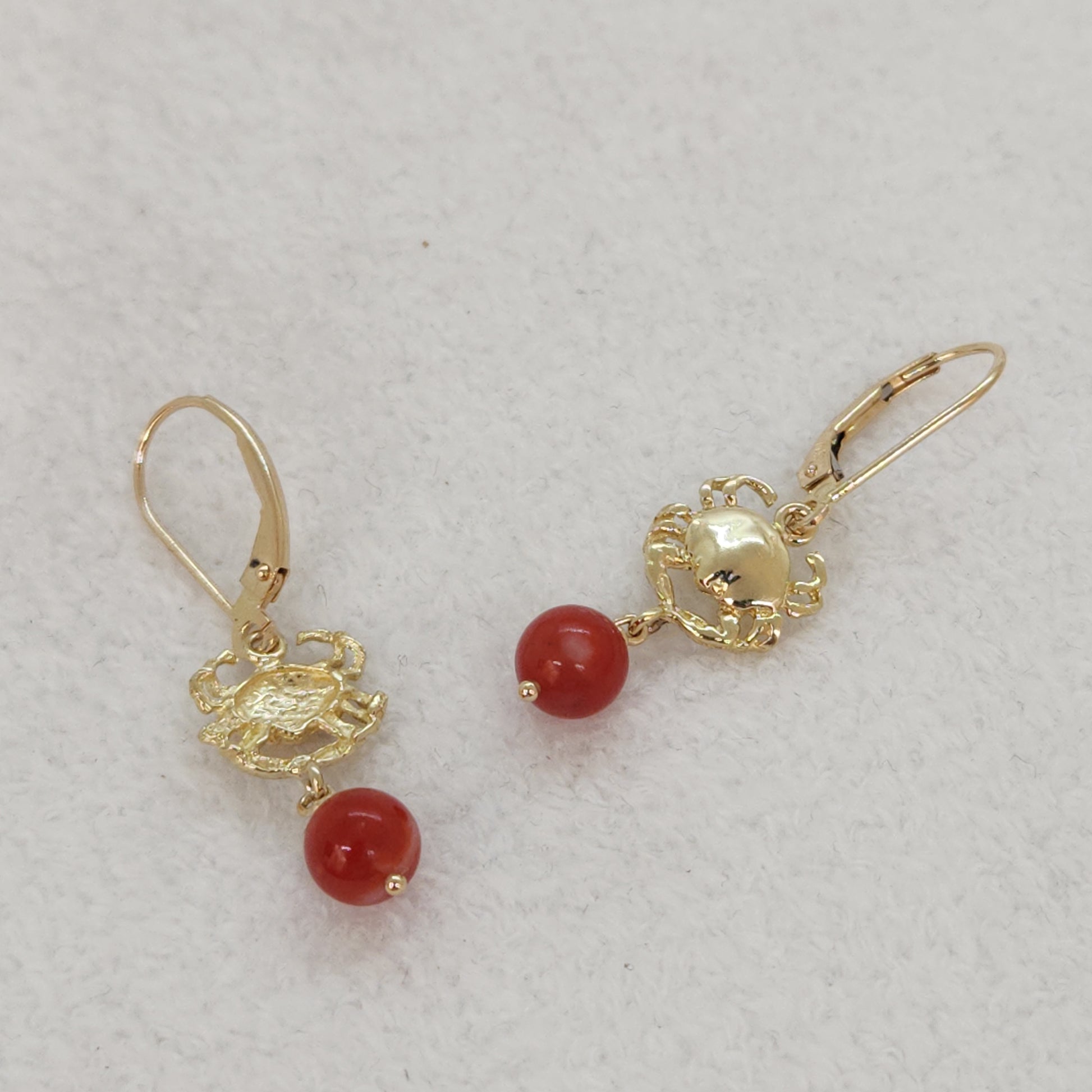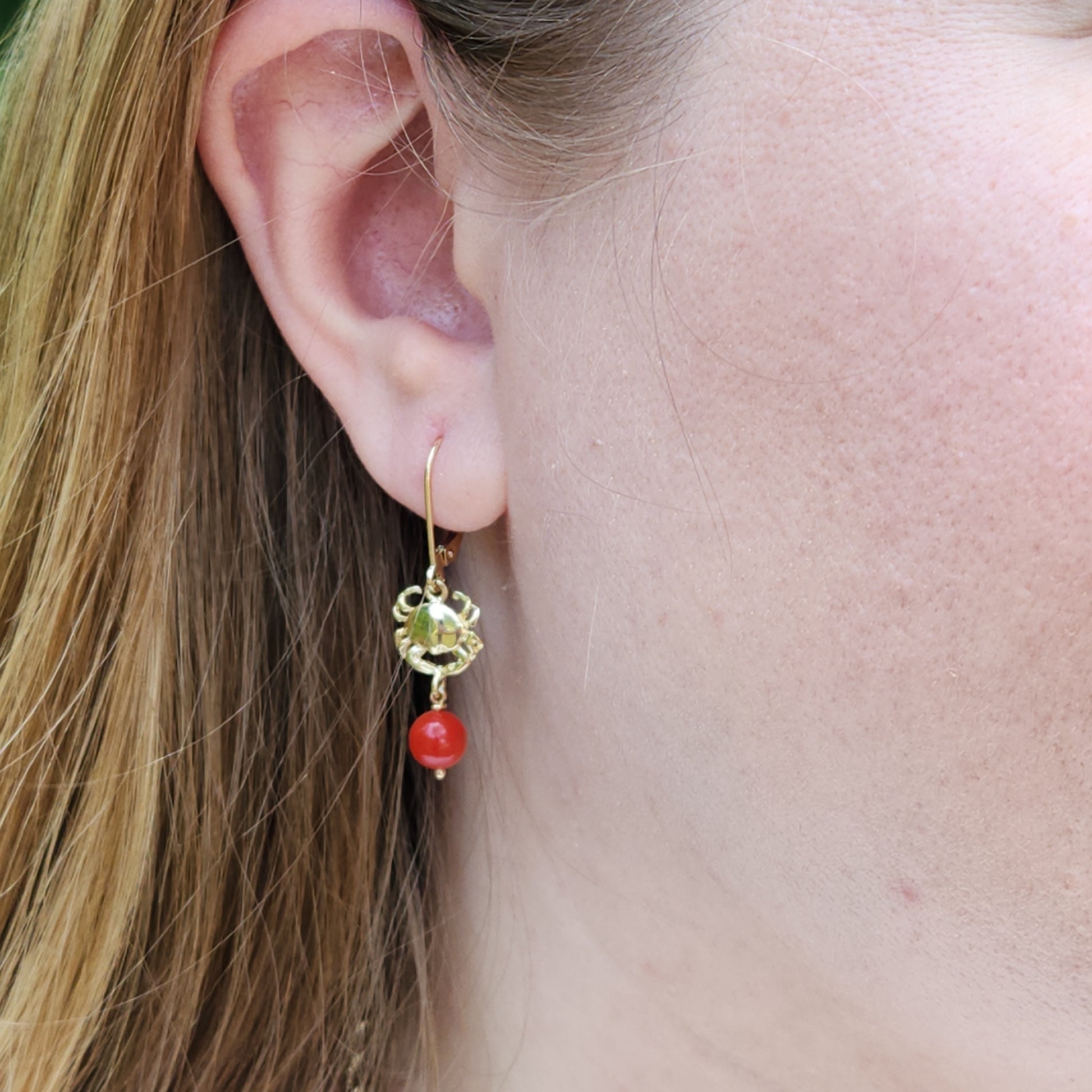 These earrings pair golden crabs with small red coral beads that dangle below, creating playful movement