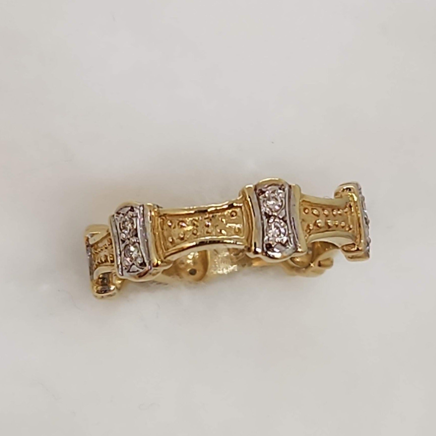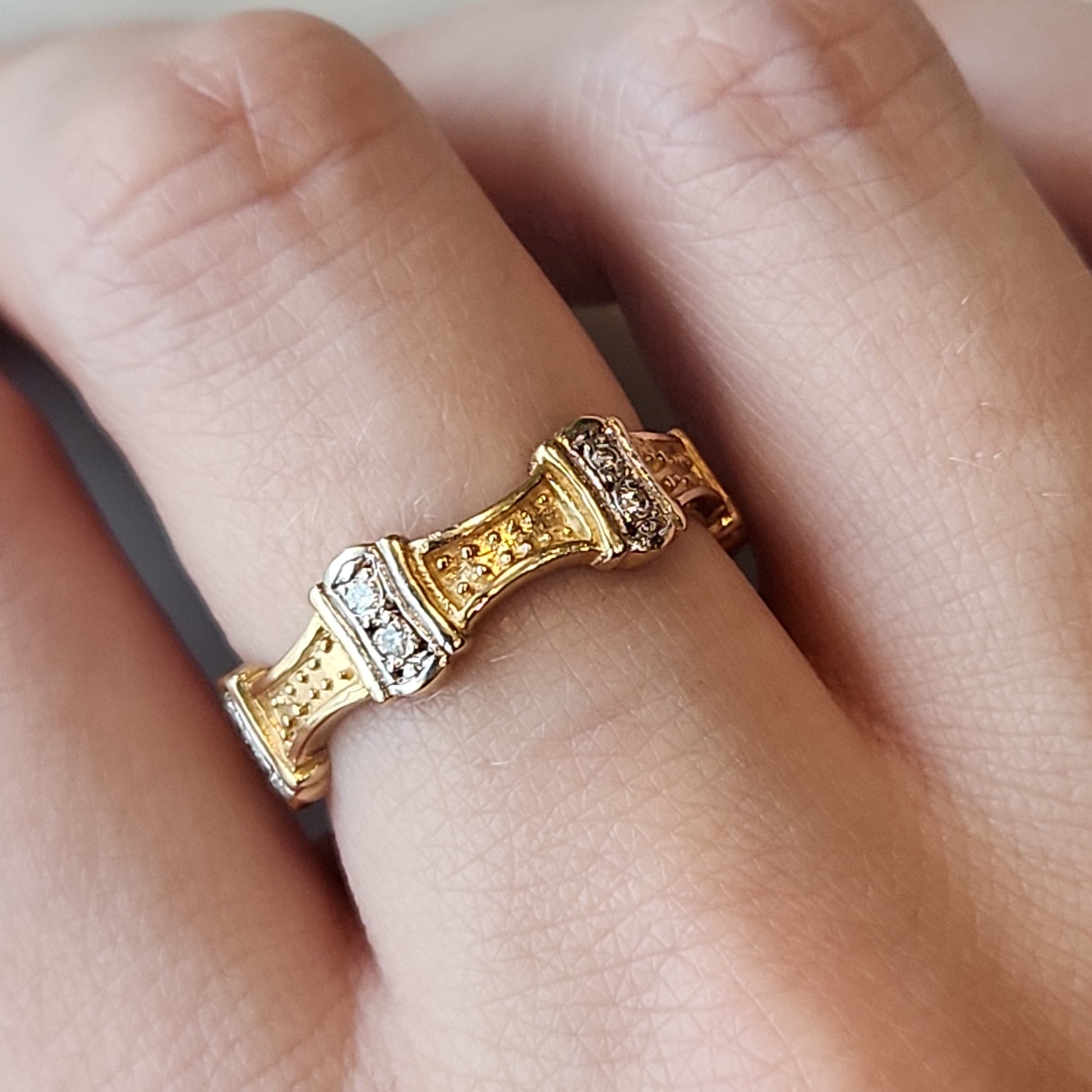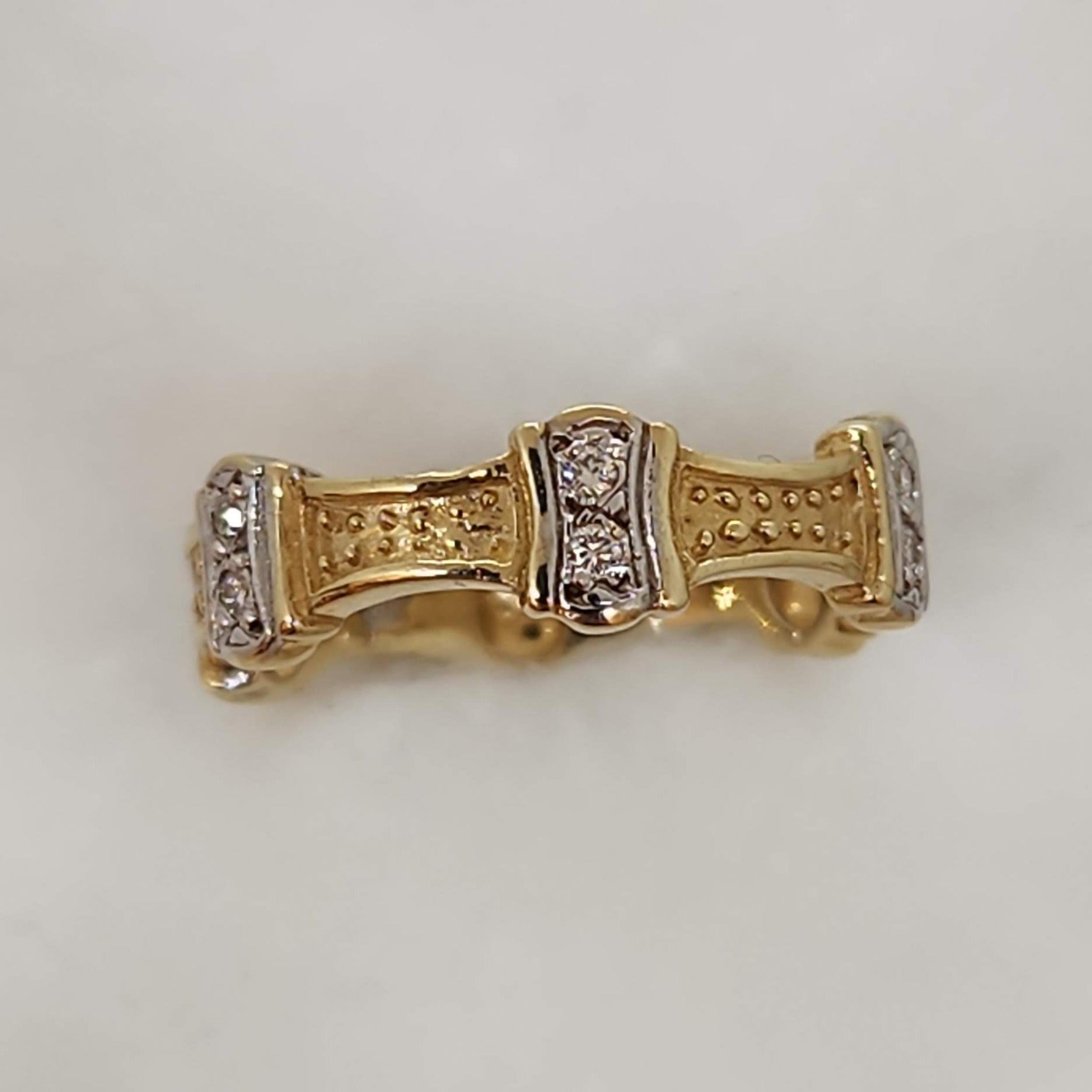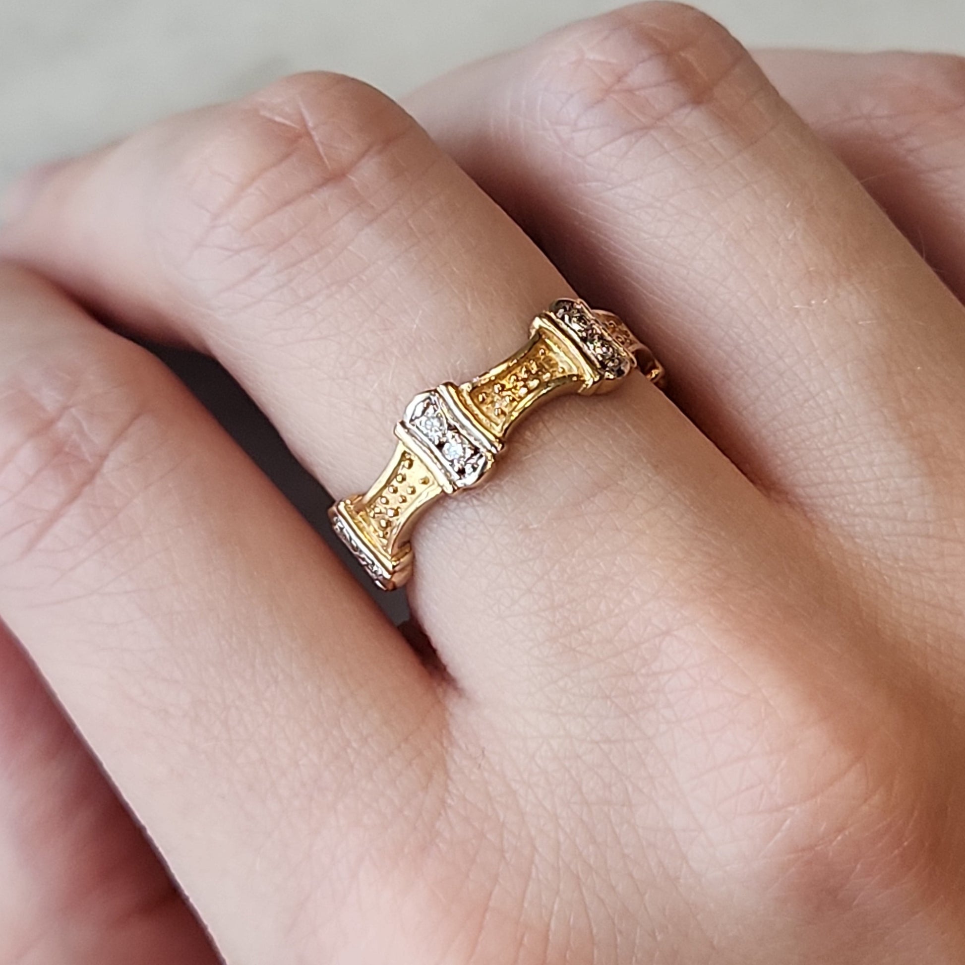 Do you see a crown...or perhaps the top of a castle wall... or maybe something else? We love this unique eternity ring. The nature of the curves means it would fit very well beside an engagement ring. Equally it works on it's own, the low profile makes it a great fit on any finger.