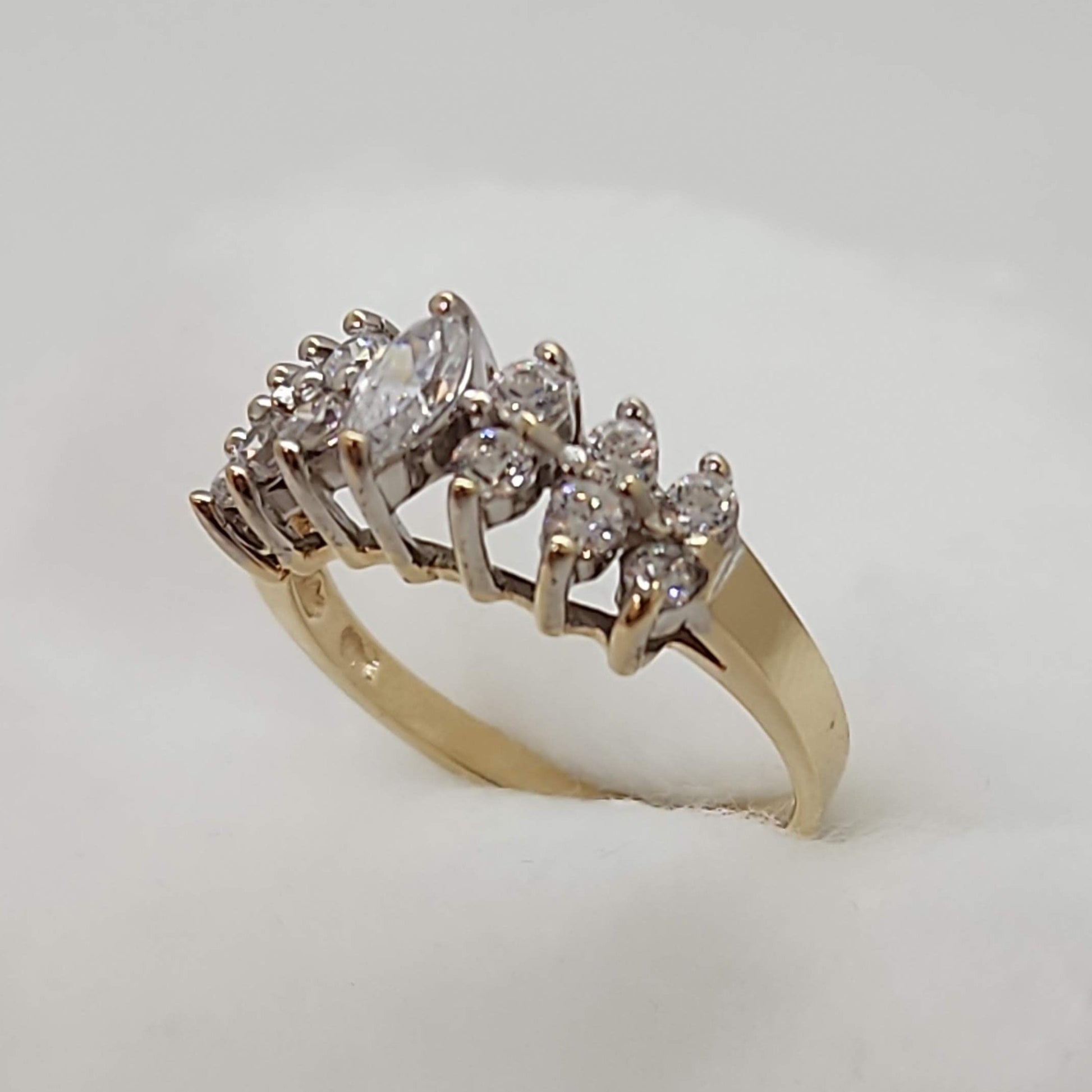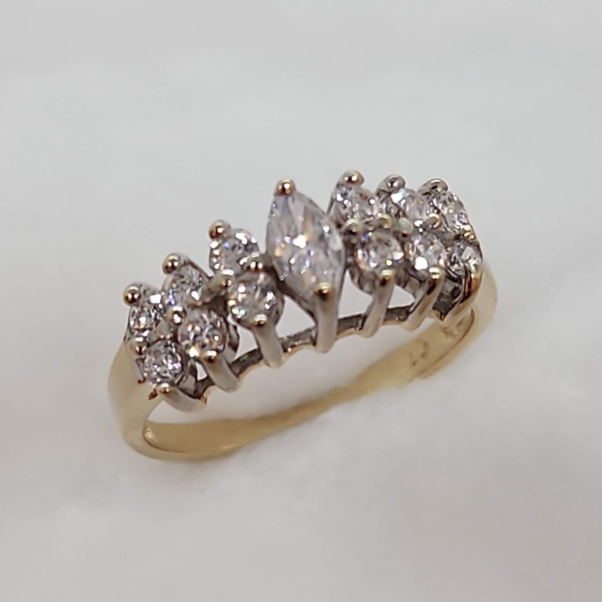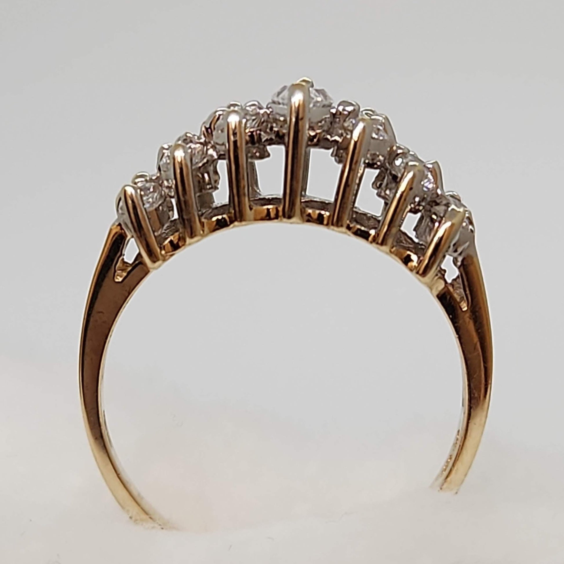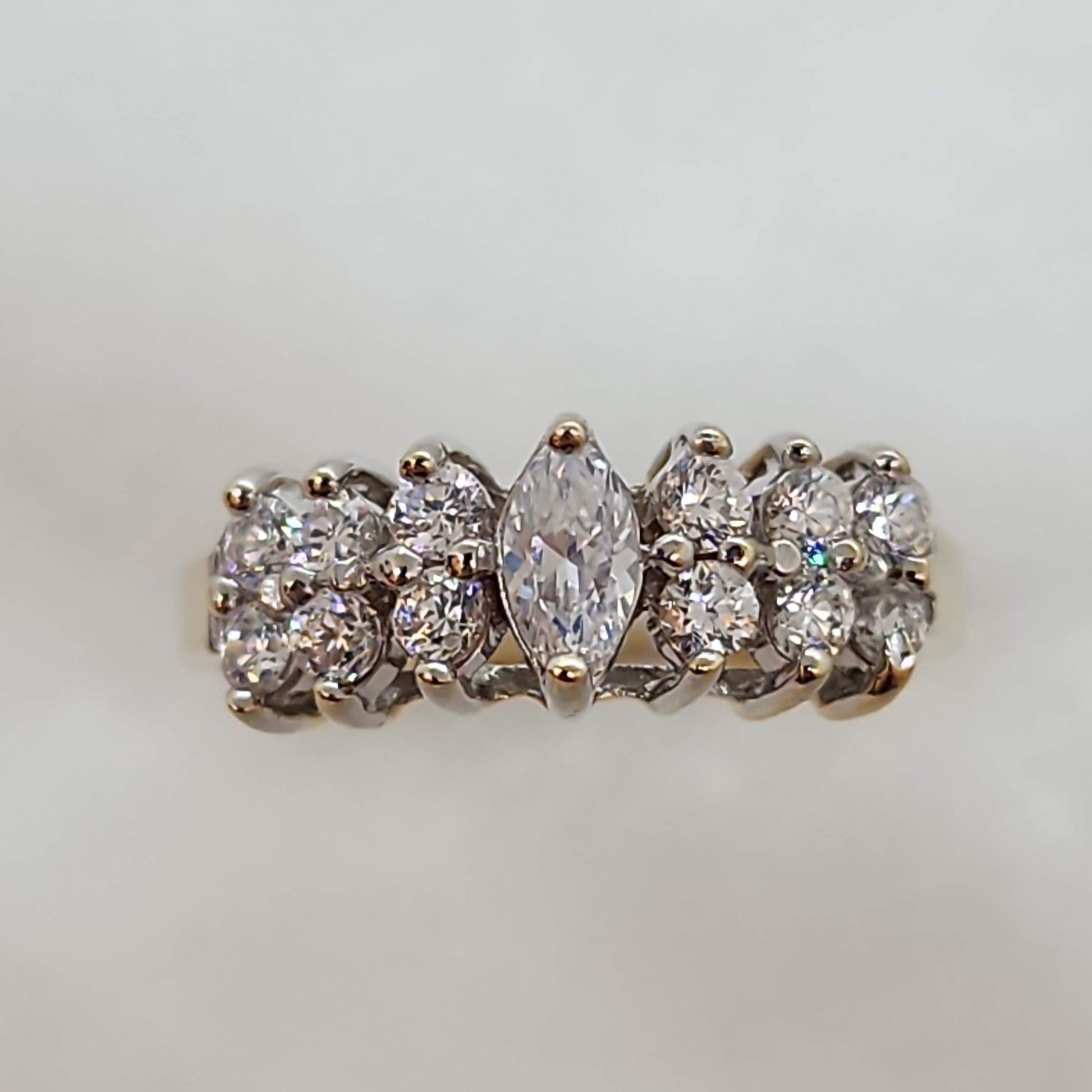 What a nice height this ring has on your finger - like a crown! A central marquise cut diamond accented with rows of round billiant cut diamonds.Try pairing it with another ring some days for a whole new look.