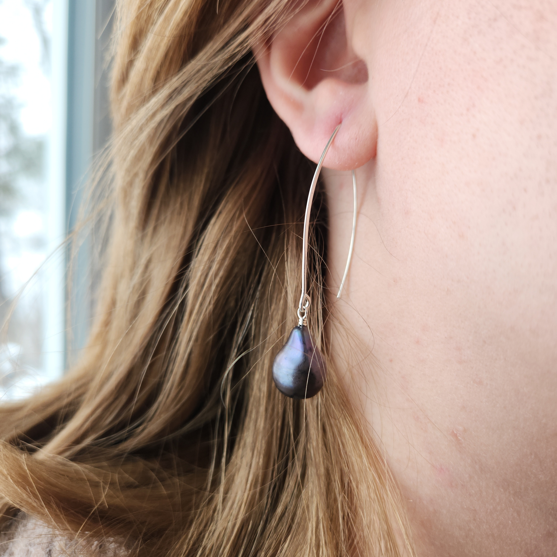 The beauty of form is present in these dangles. The earring hooks with the beautiful angled bend, with a dark purplish blue teardrop shaped freshwater pearl that shimmers with muted iridescence.