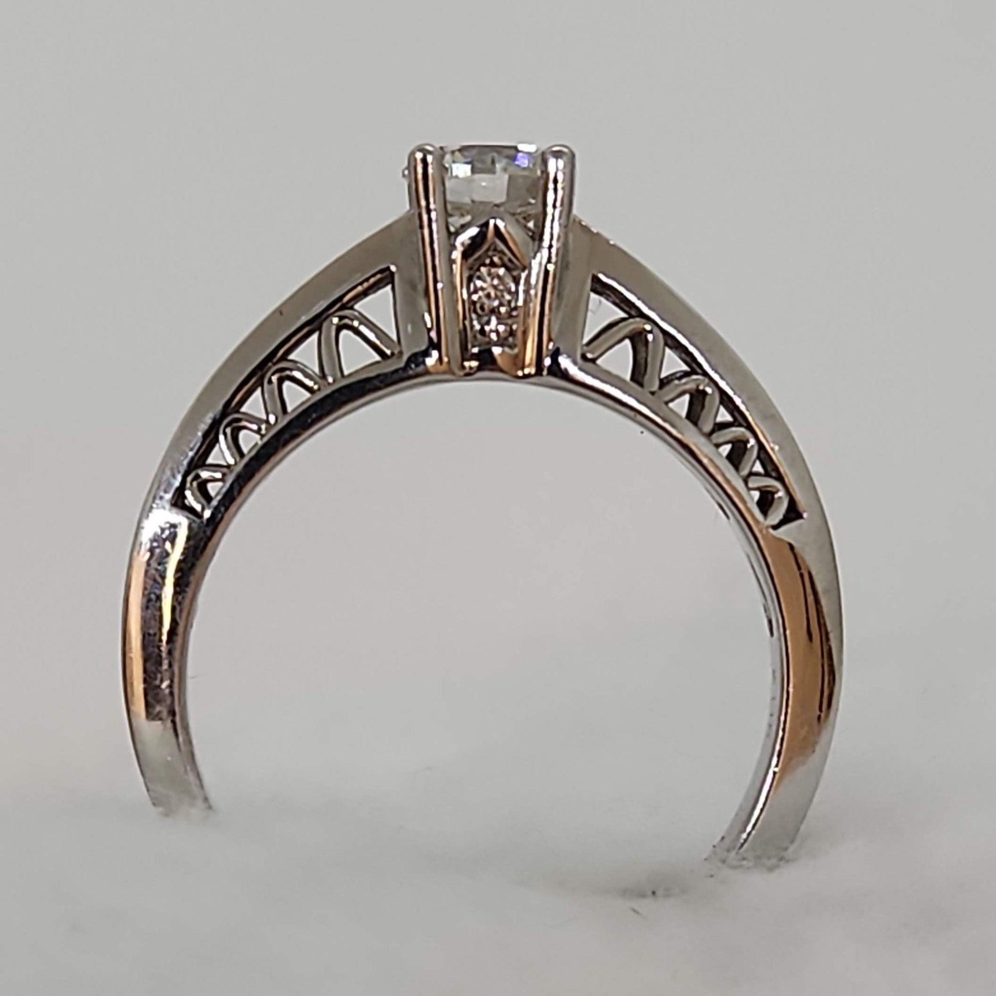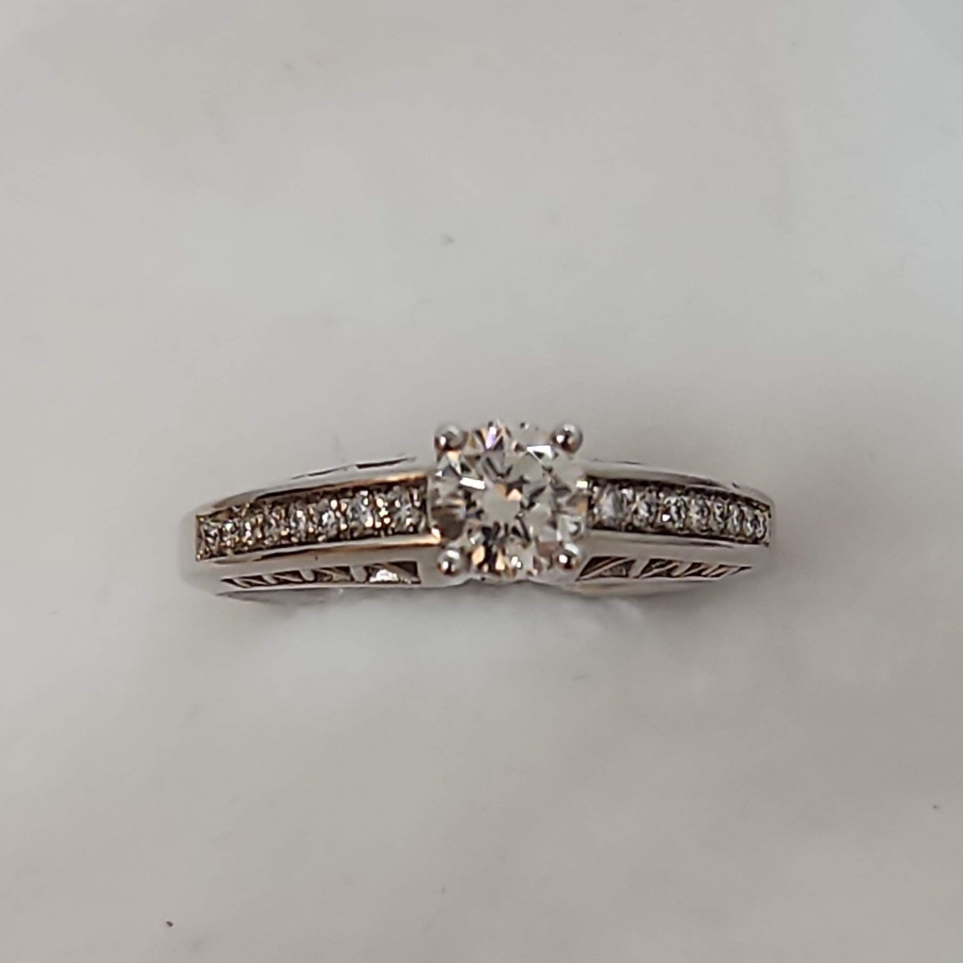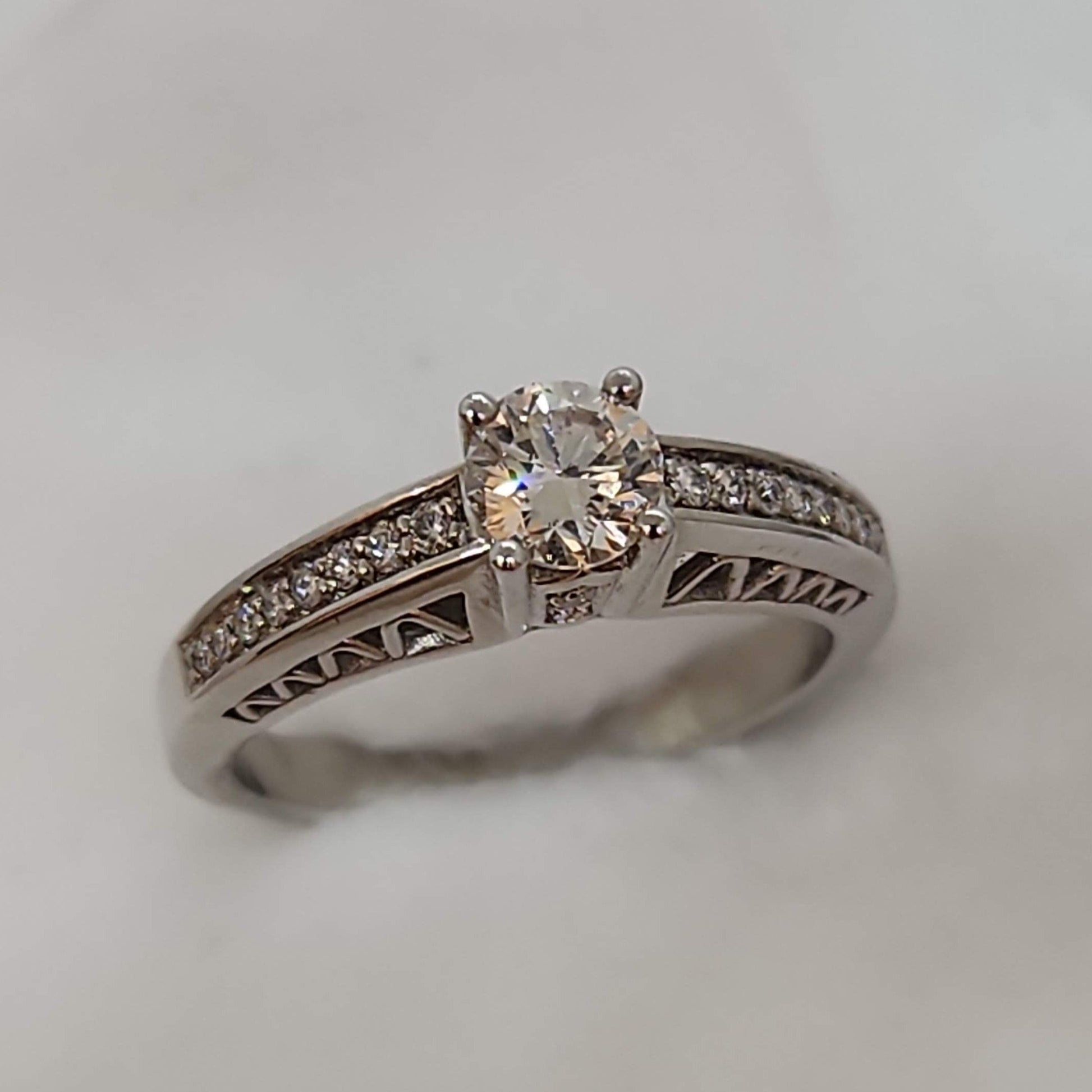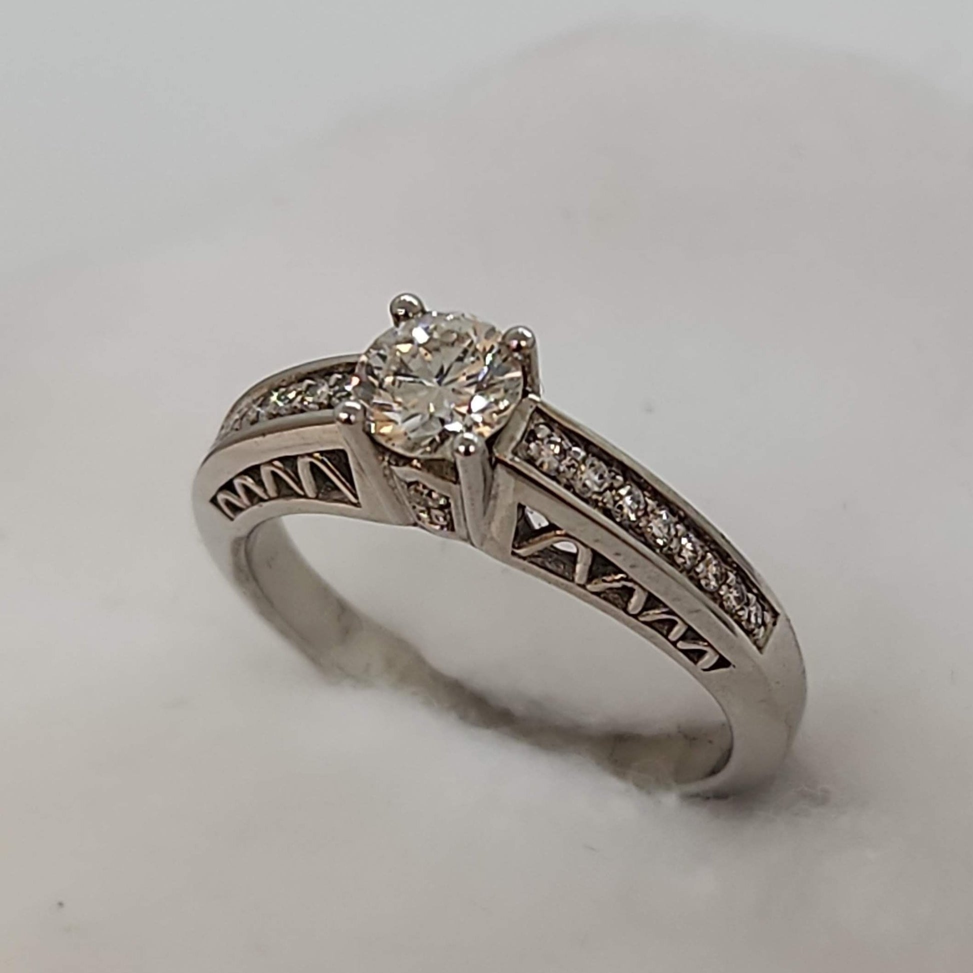The tradition of exchanging rings is a long-standing one as this tradition dates far back as 3,000 years ago. A beautiful diamond ring, having details on it's shoulders that remind us of a trestle bridge. They build up in height, leading to the central stone. Not to mention the sparkling diamonds nestled underneath the main stone in what we call the "bridge" of the ring. A very flattering ring.