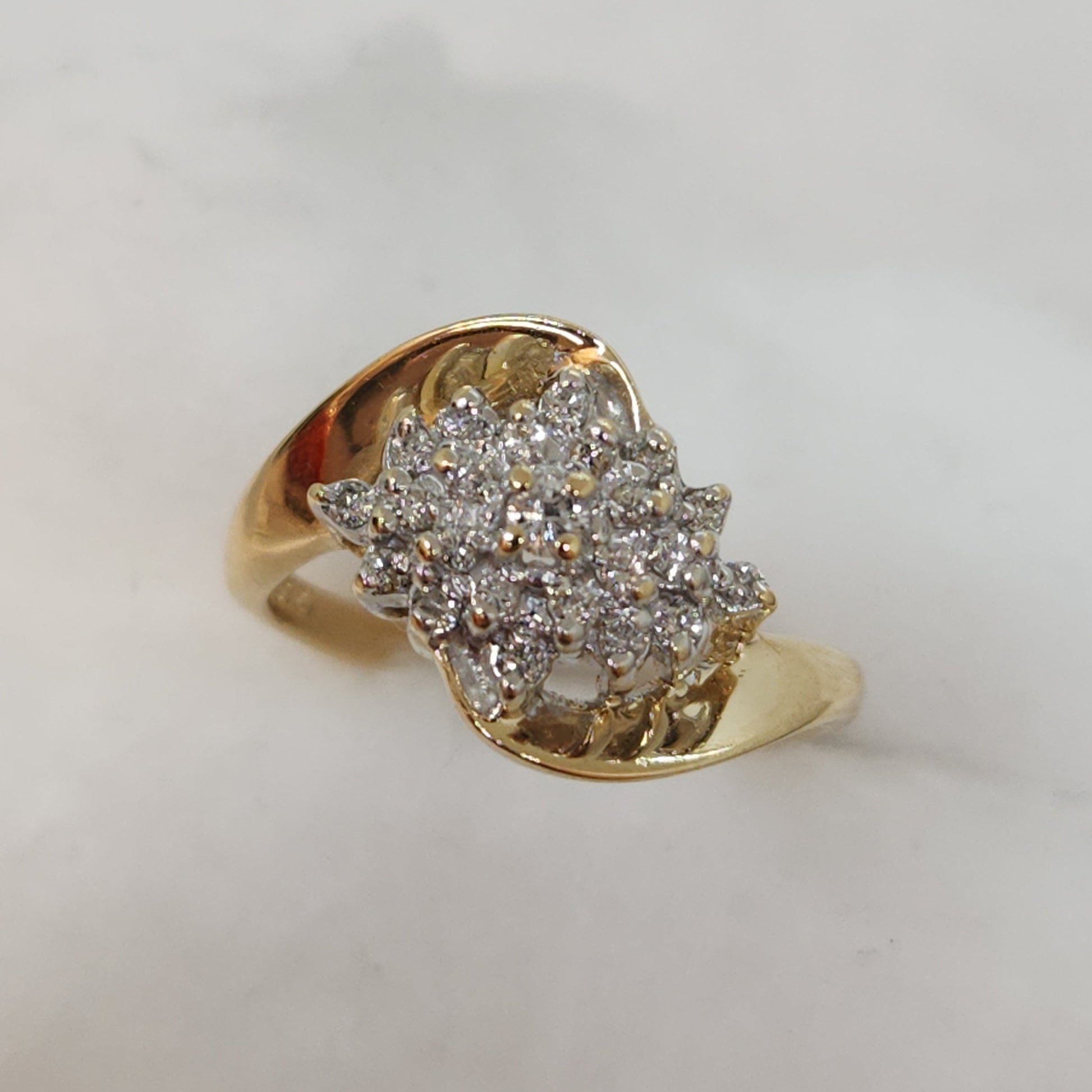 A different take on the traditional diamond cluster design. The gorgeous design seamlessly lays across the finger with warm glowing gold ribbons wrapping around the diamond cluster. A timeless and bold vintage find.