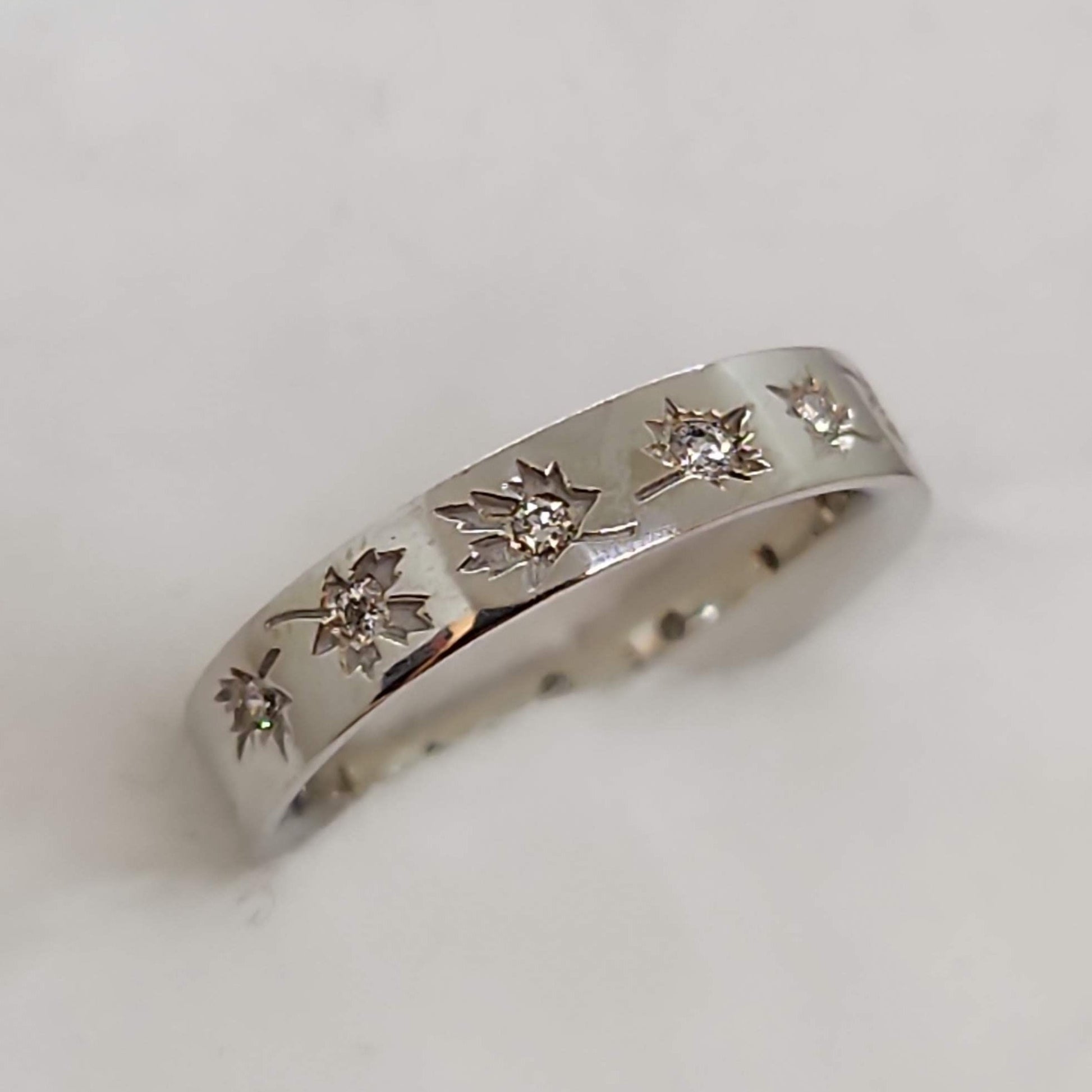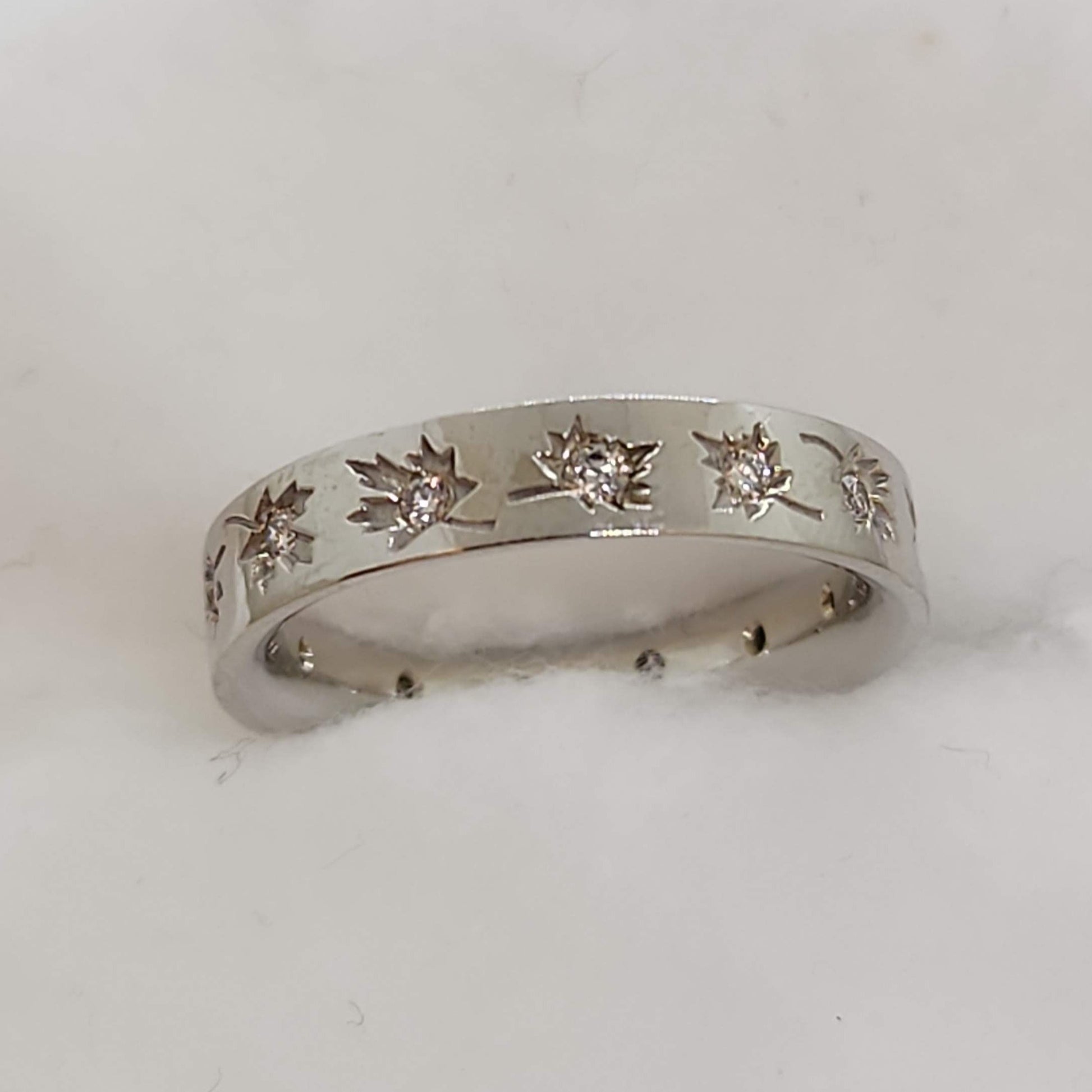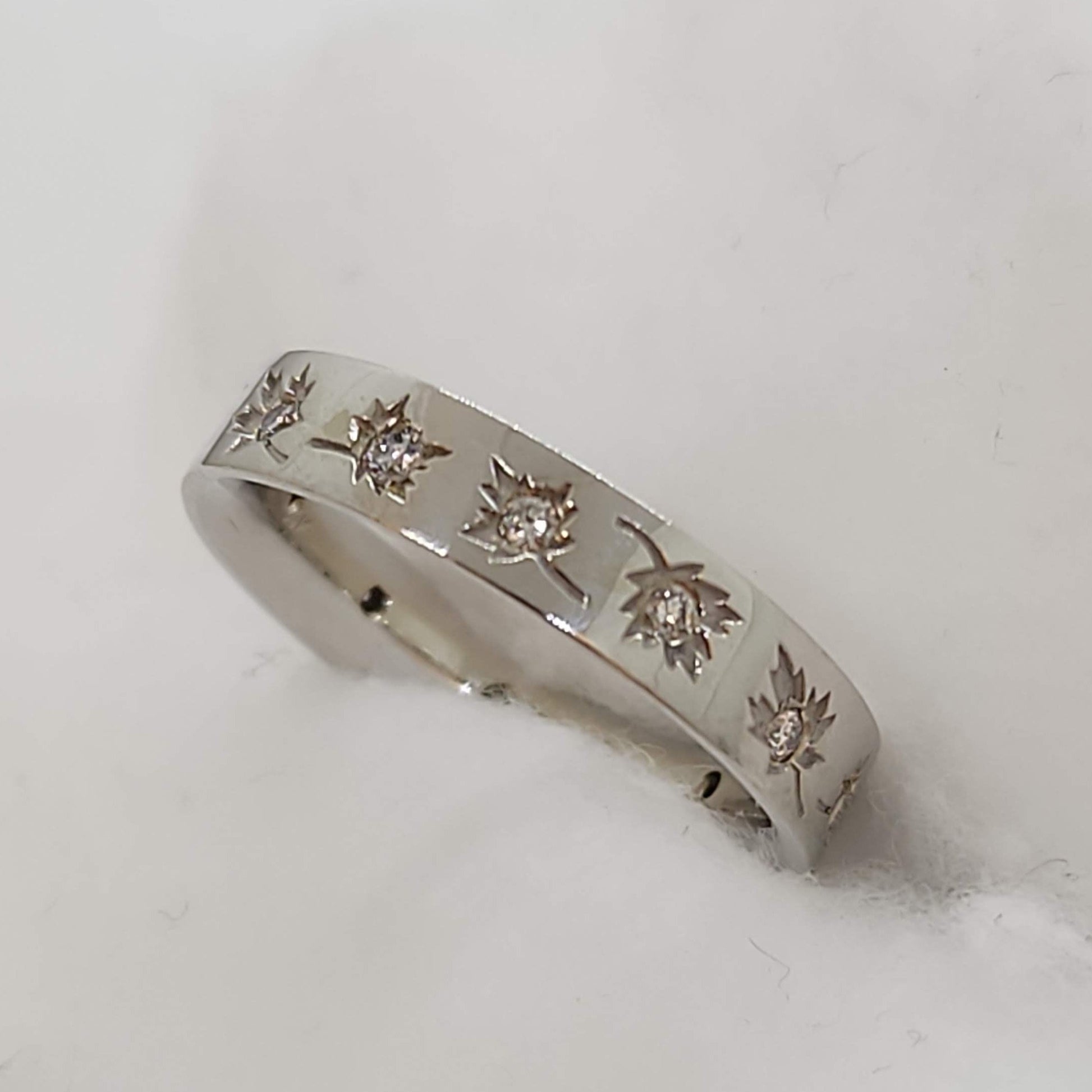 There is a reason spending time in nature is important to so many of us. Watching the leaves dance in the breeze can be calming and rejuvenating. Designed and handcrafted by Marigold Design Studio as part of our Canadiana Collection, this ring features engraved maple leaves sprinkled around the band, each with a glittering diamond.