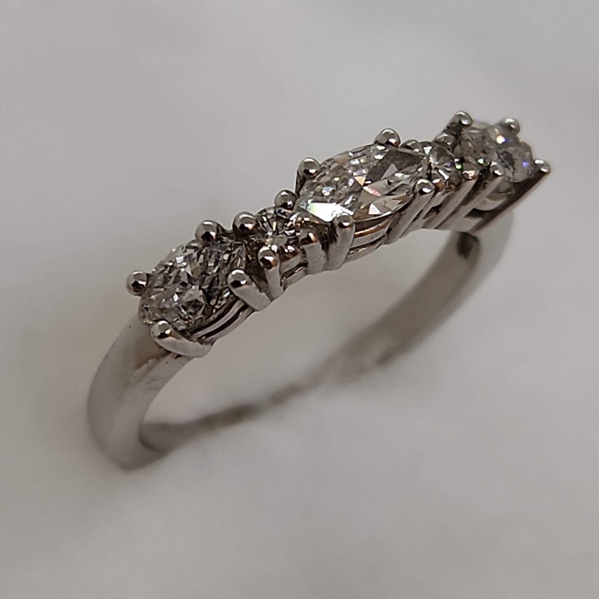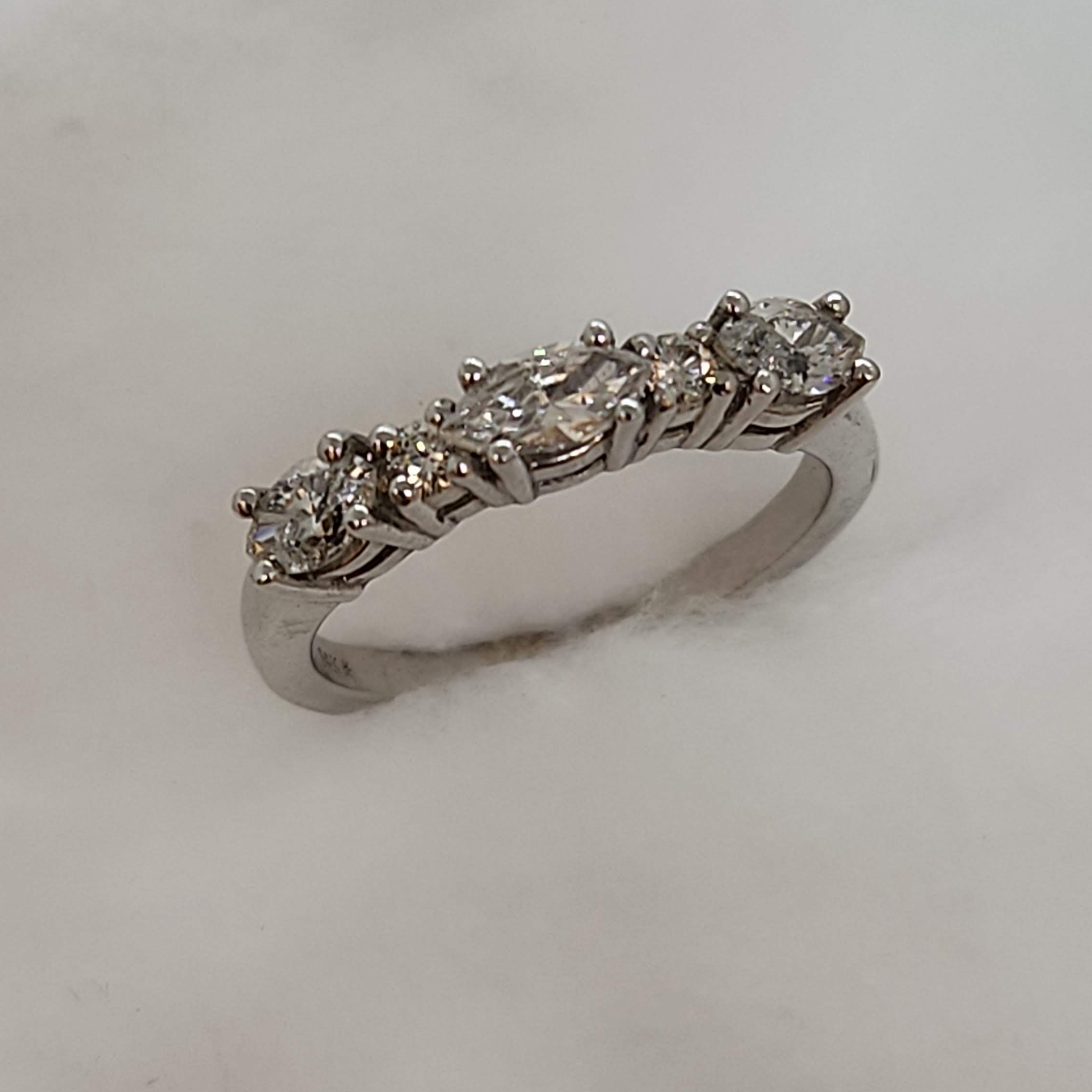 Fancy shaped diamonds for the gal who wants something just a little different! This band is flattering on it's own or paired with an enagement ring. The marquise diamonds sit slightly higher than the round diamonds in between, giving a nice flow to this design.