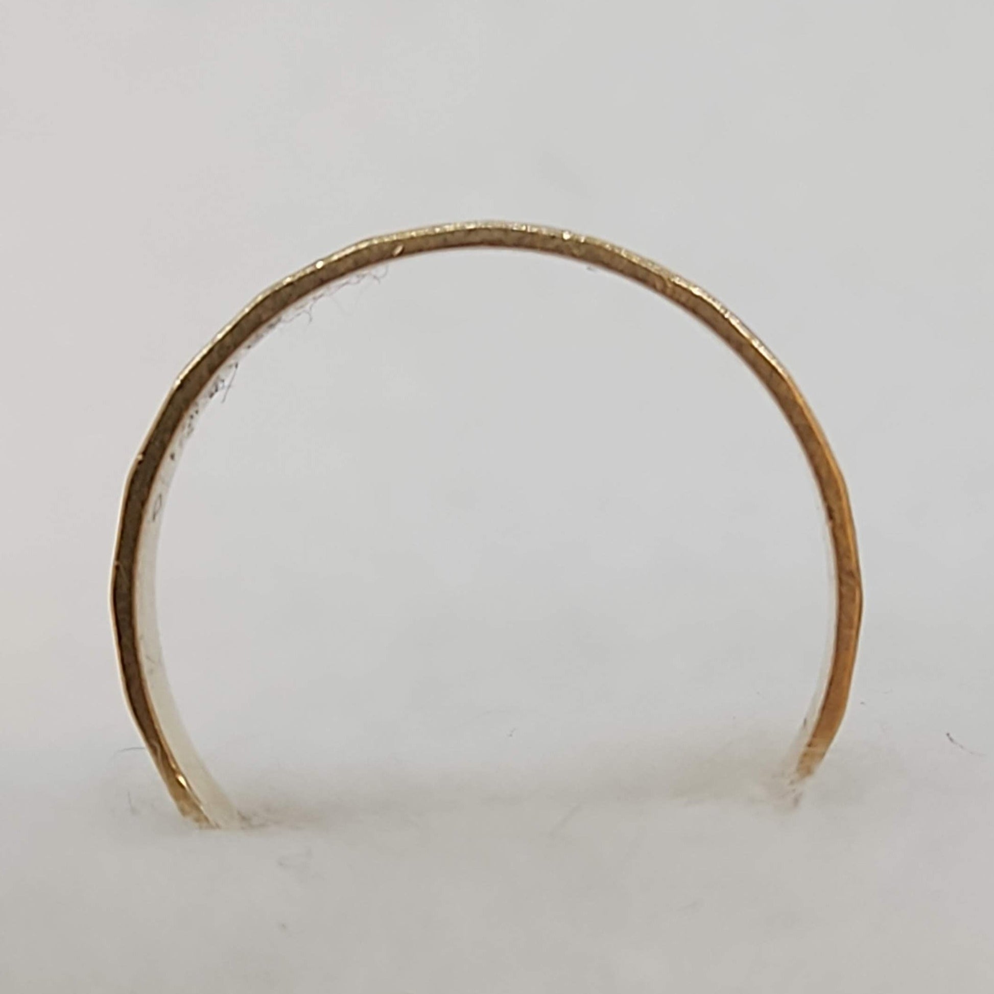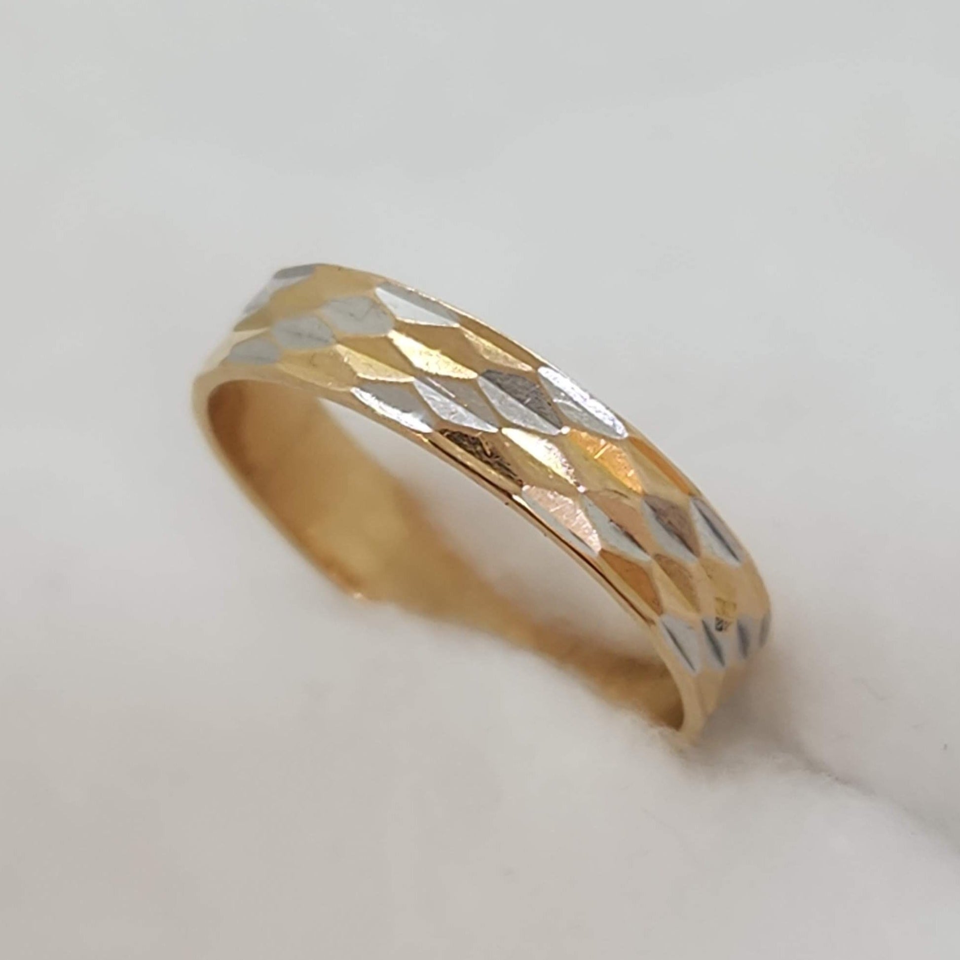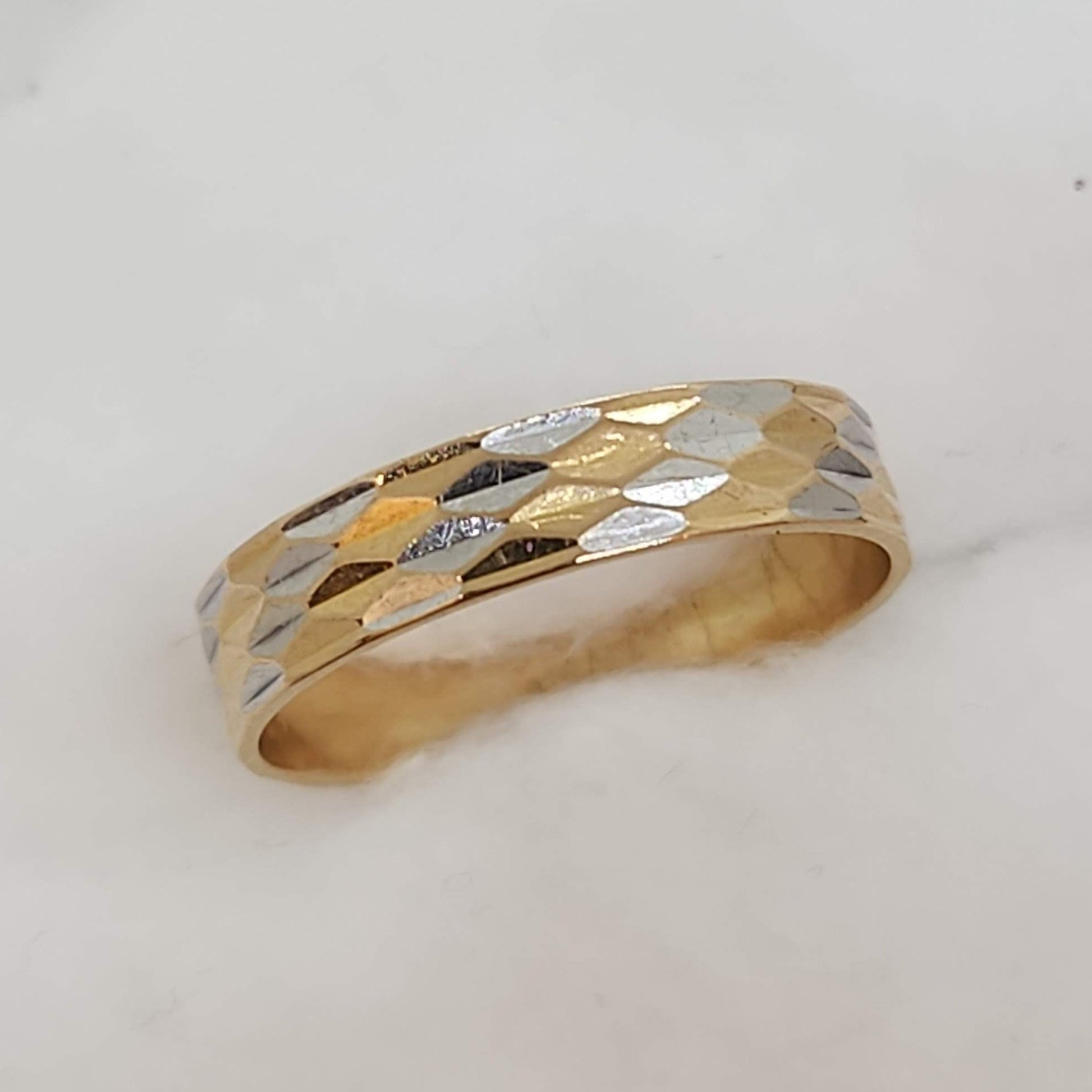 Tactile, and reflective, this band is perfect for someone looking for something a little different. The combination of white and yellow gold is highlighted with all the "facets" . Perfect on it's own, a uniqe wedding band or paired with another ring.