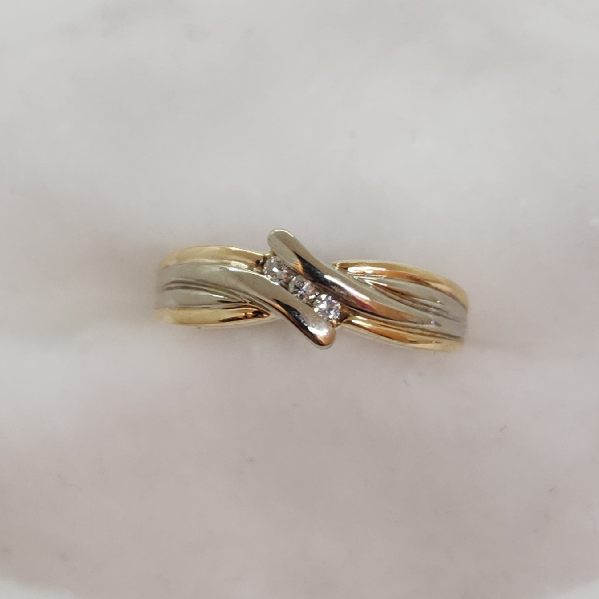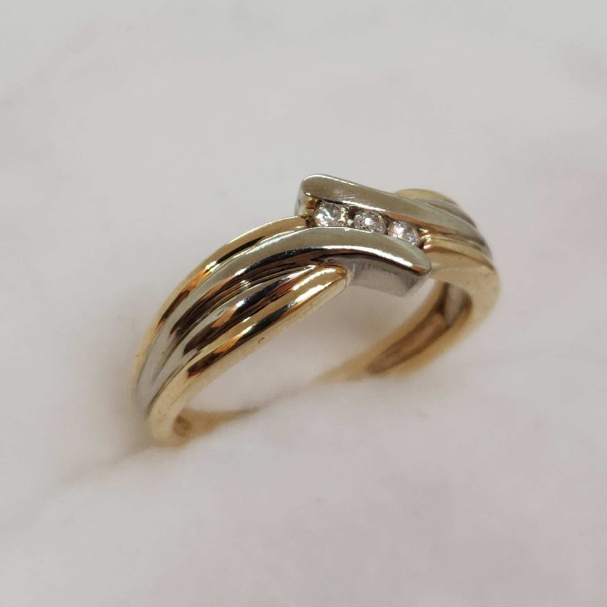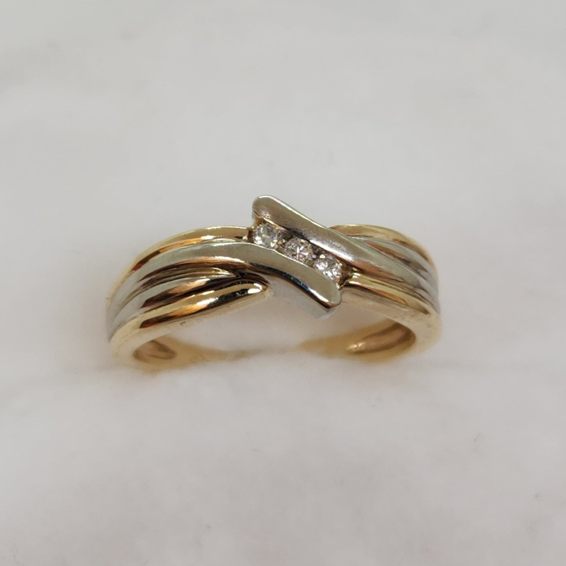 These ribbons of yellow and white gold appear to twist to reveal a trio of sparkly diamonds. Would also work well stacked with another ring.