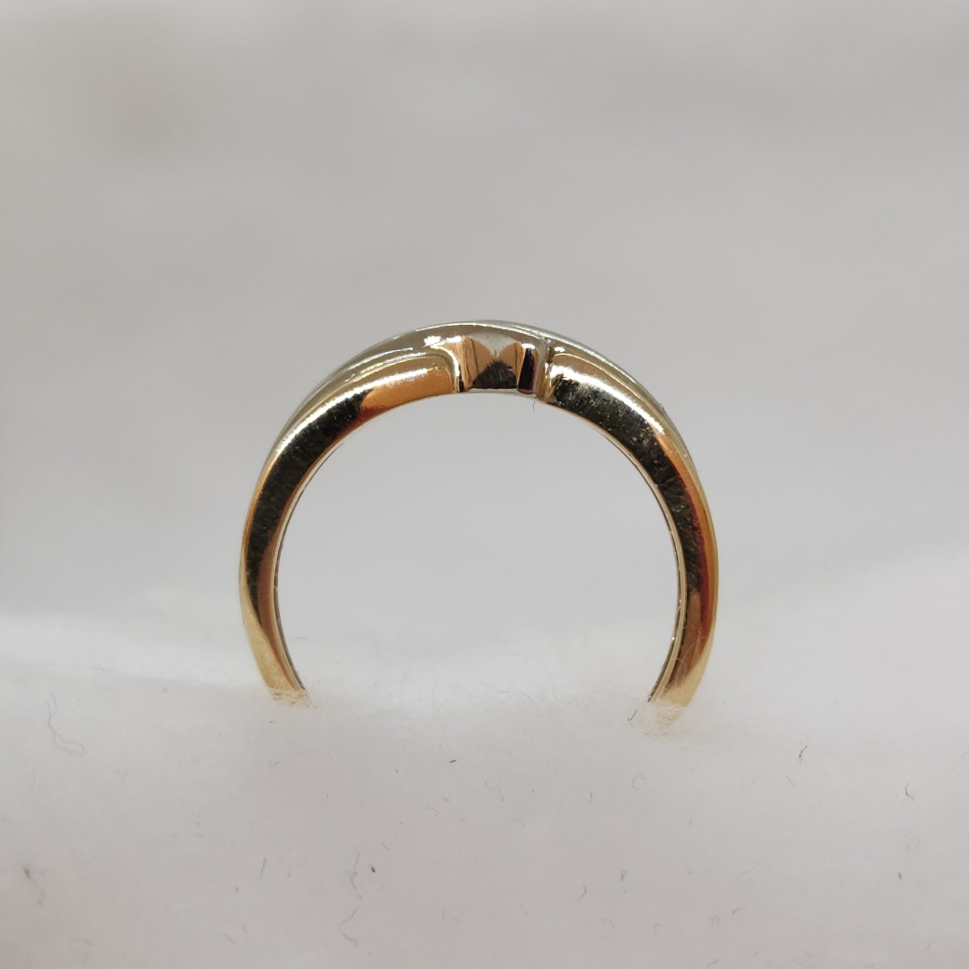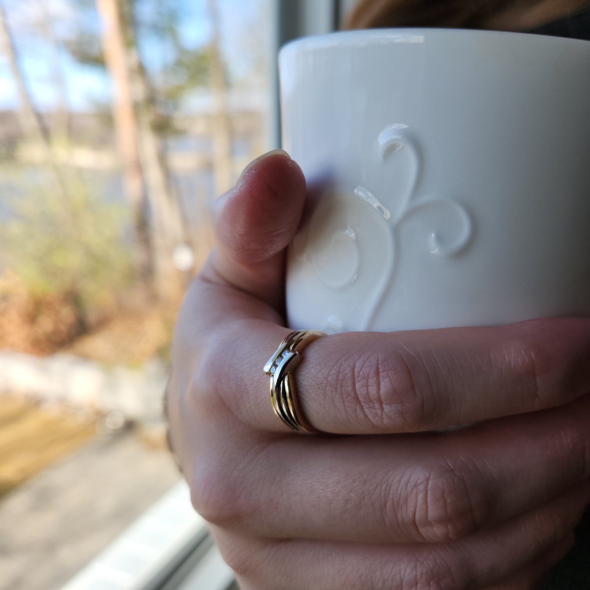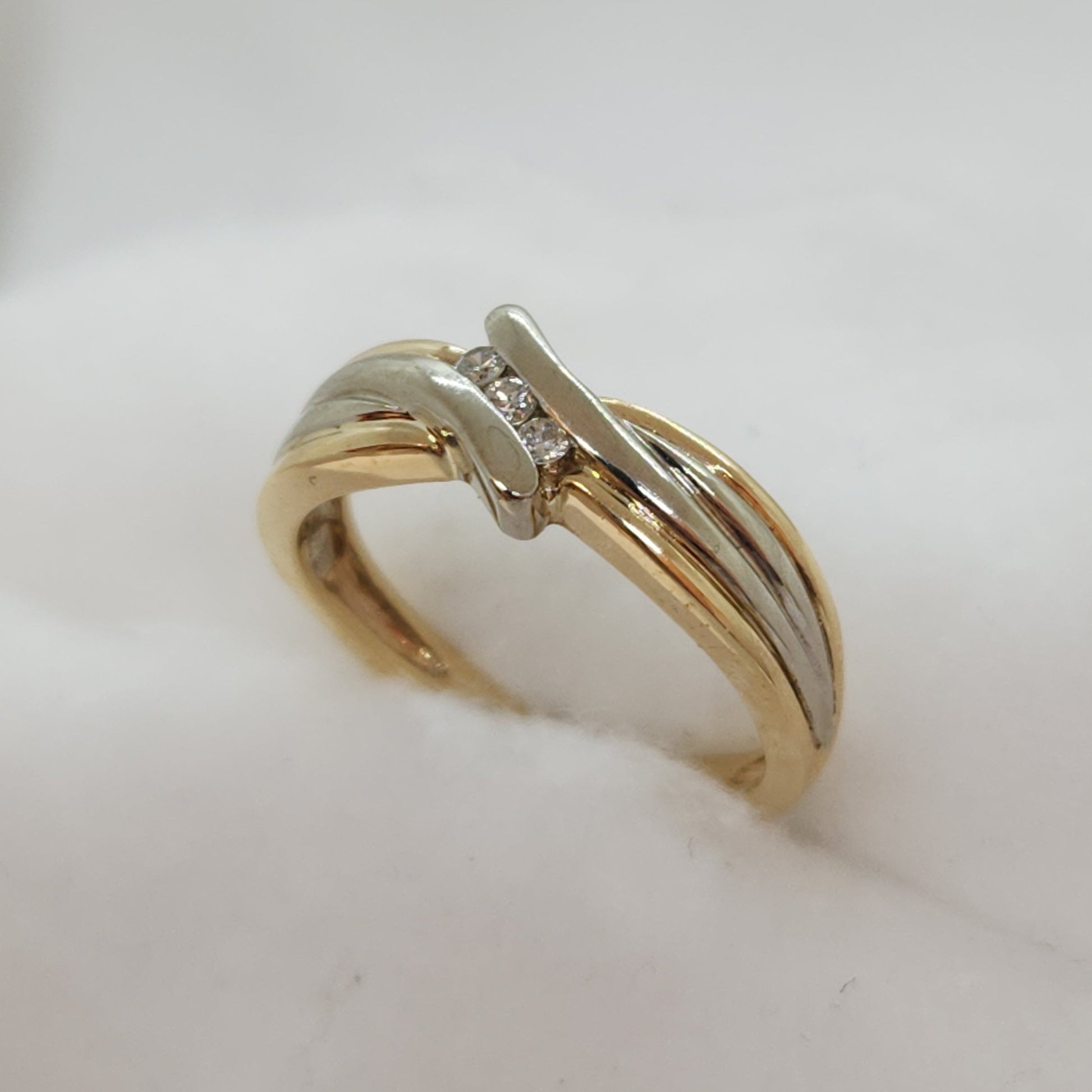 These ribbons of yellow and white gold appear to twist to reveal a trio of sparkly diamonds. Would also work well stacked with another ring.