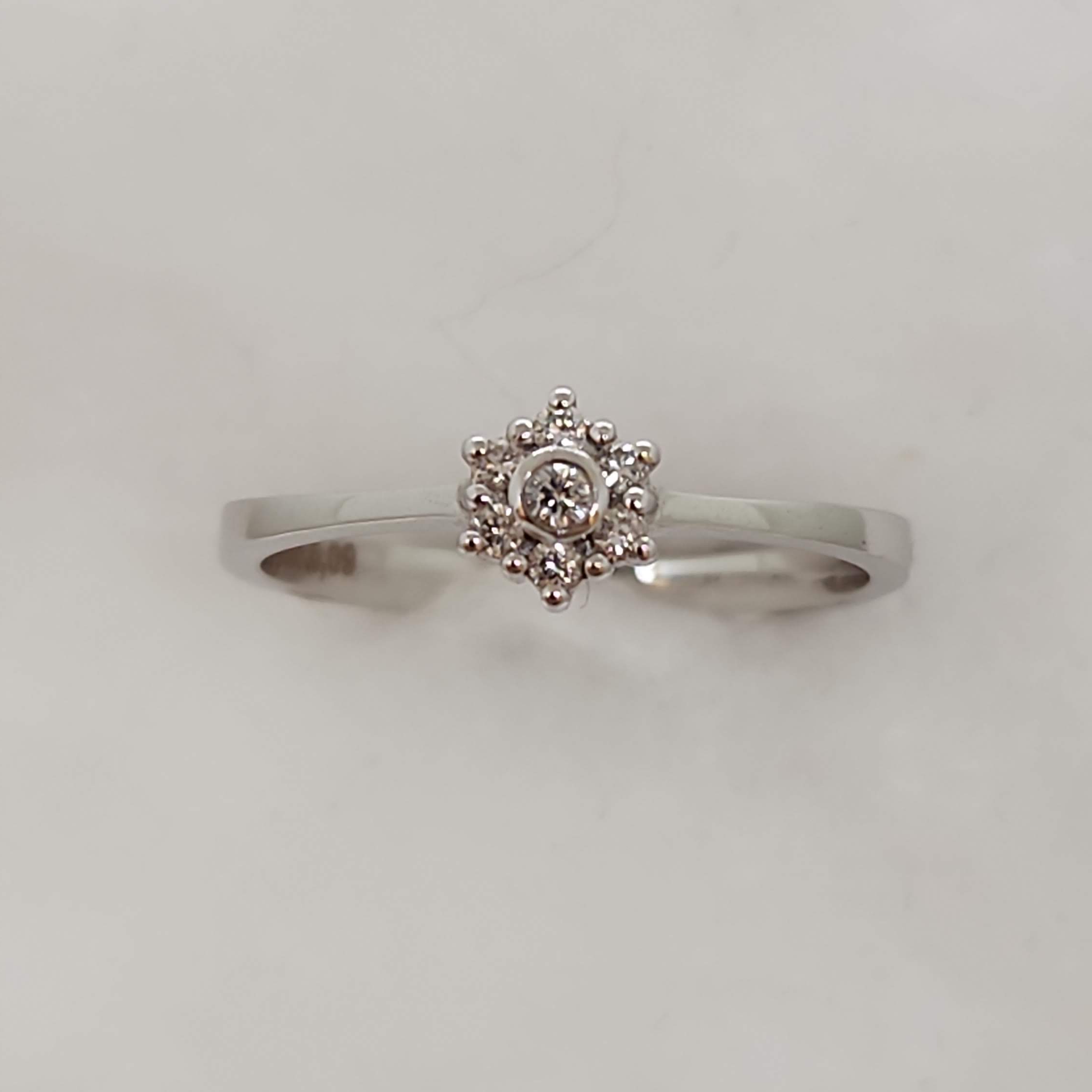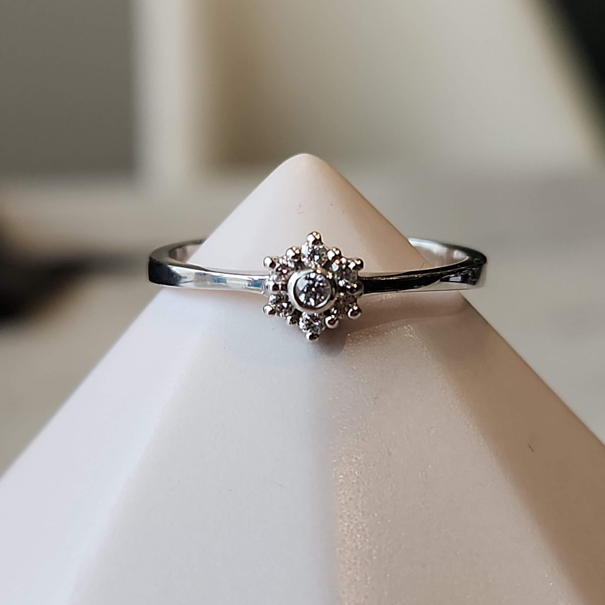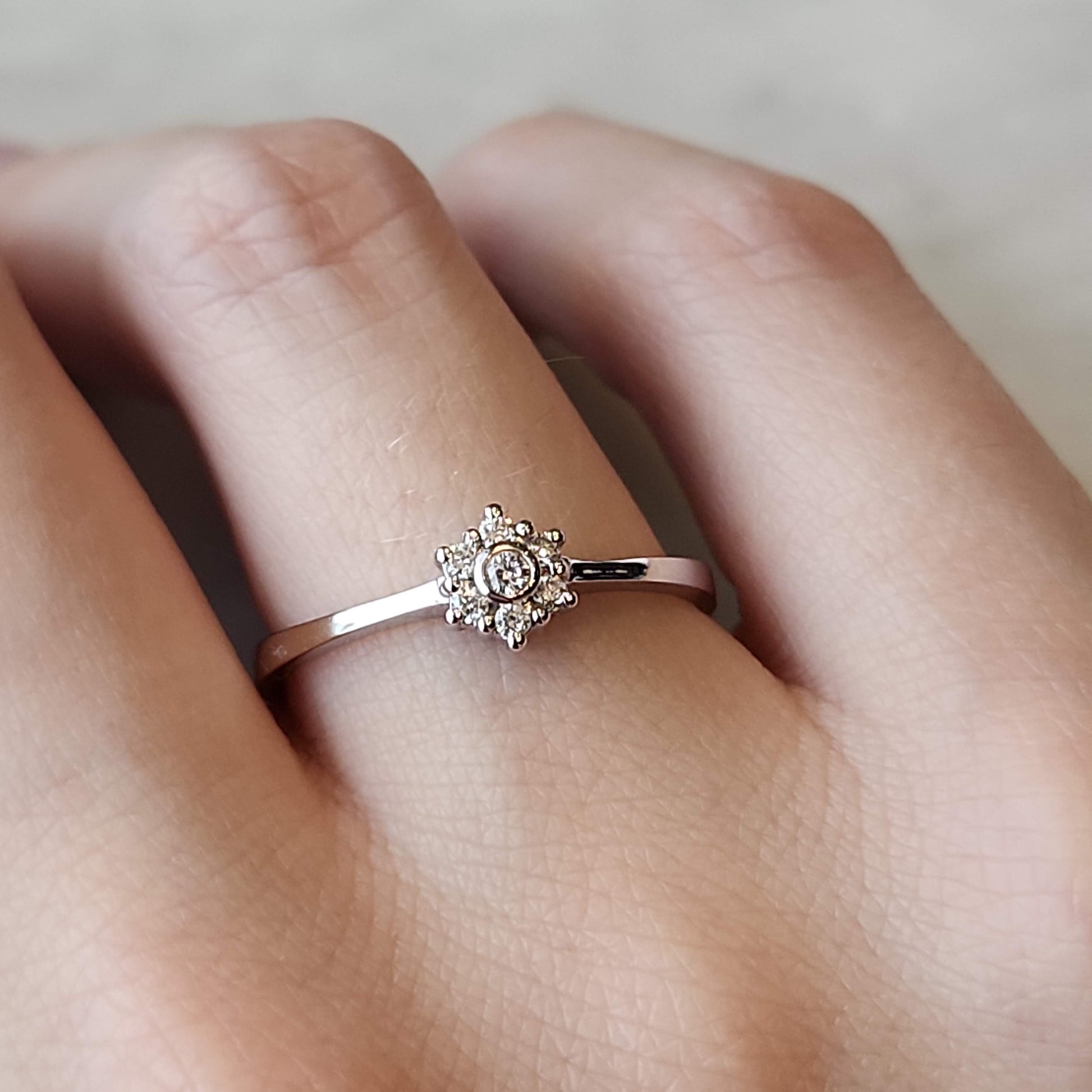 This beautiful ring sports a snowflake motif, with a central diamond encircled by 6 smaller diamonds in a halo pattern. Suitable as a minimal engagement ring, promise ring or stacked with other rings to create an accent.