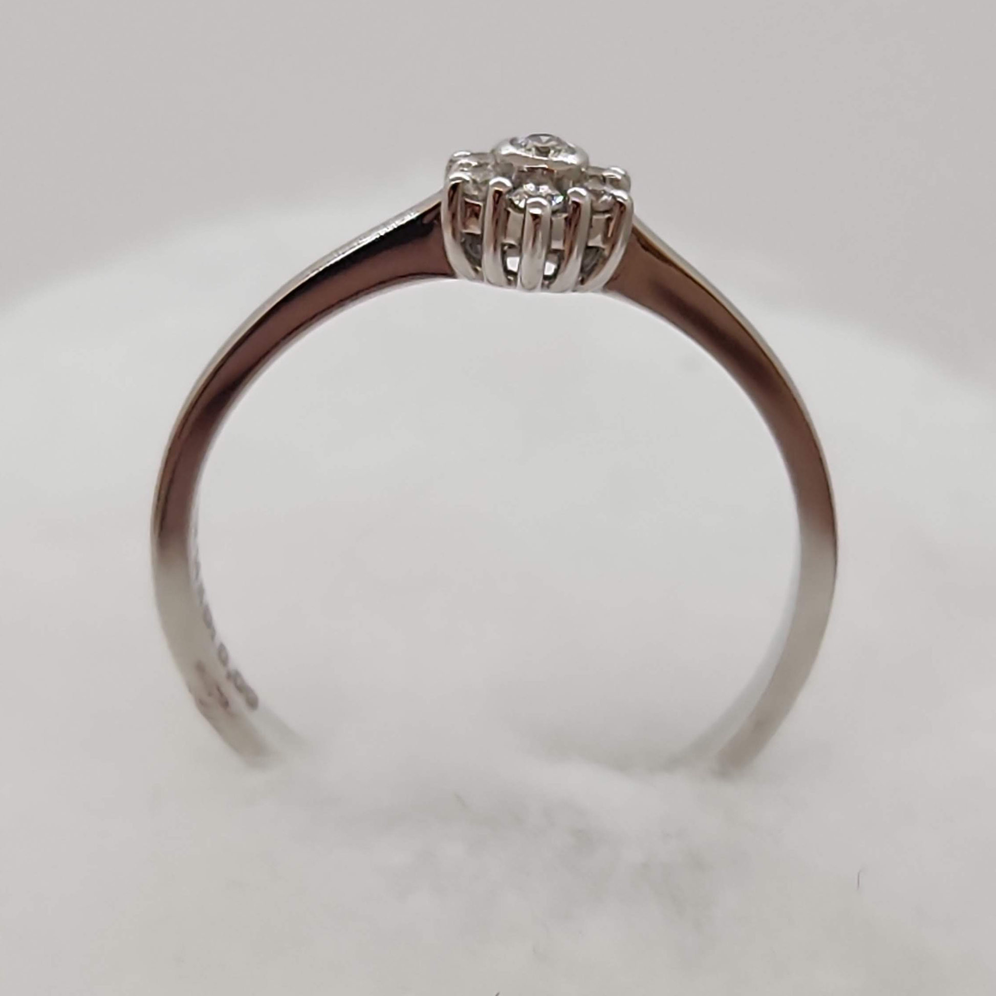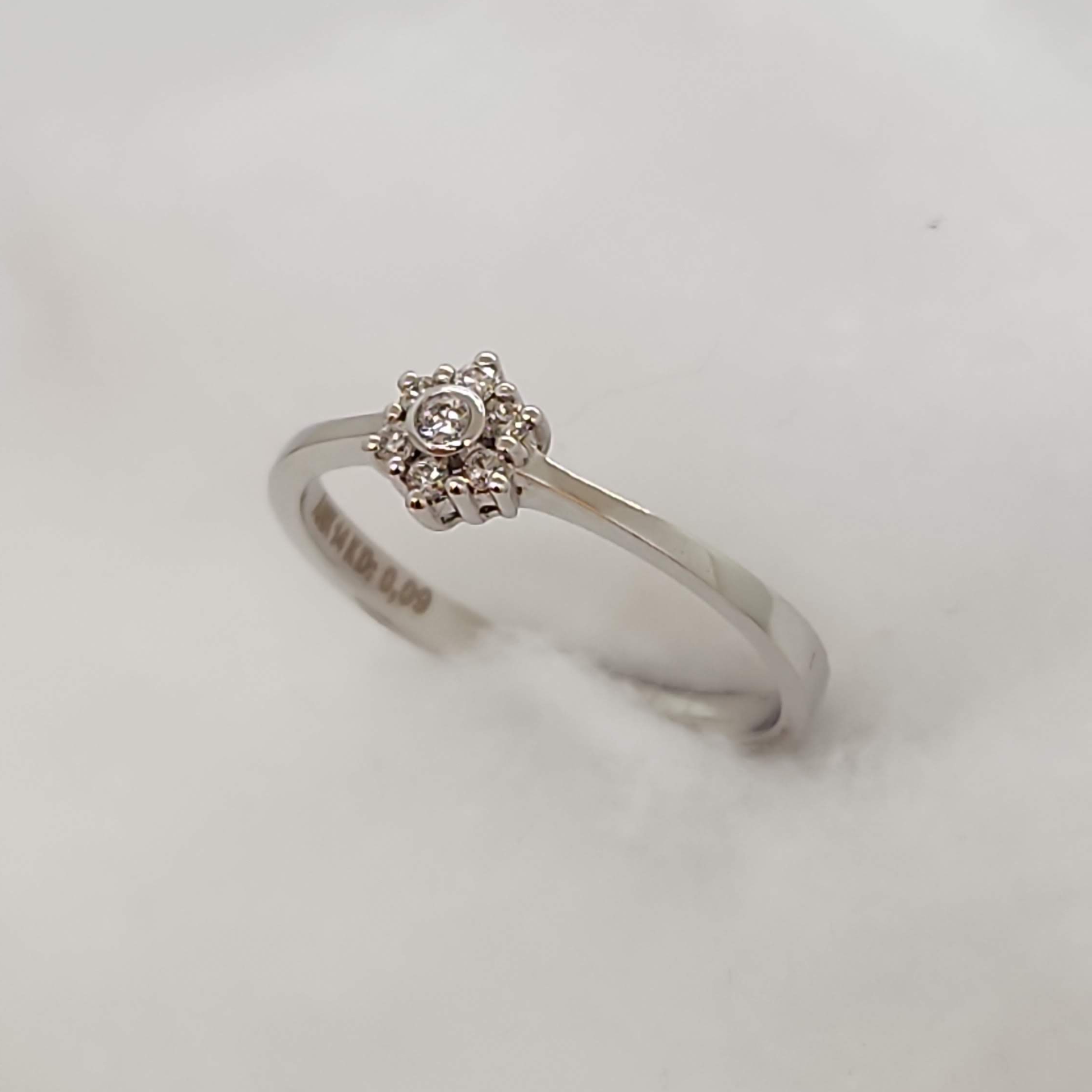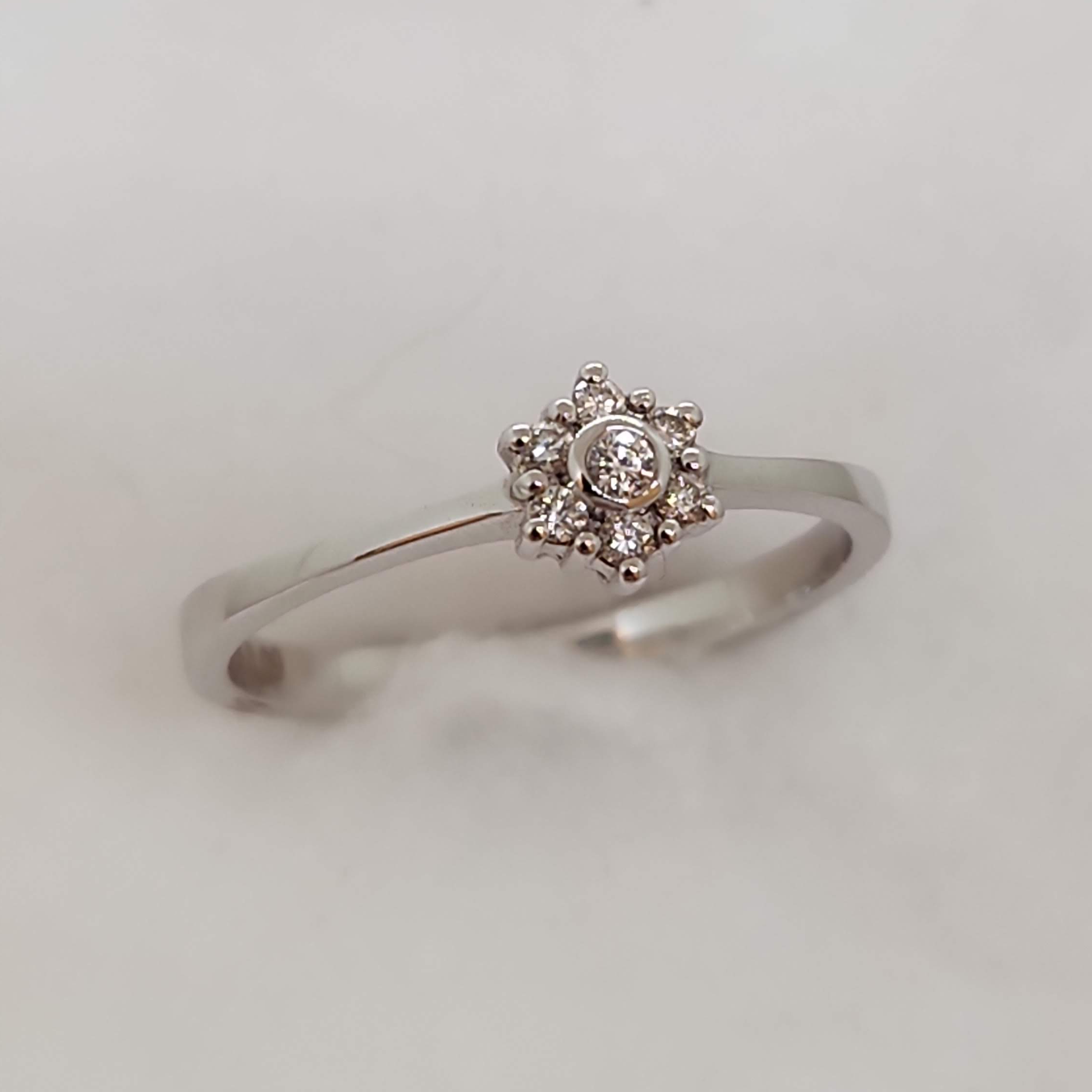 This beautiful ring sports a snowflake motif, with a central diamond encircled by 6 smaller diamonds in a halo pattern. Suitable as a minimal engagement ring, promise ring or stacked with other rings to create an accent.