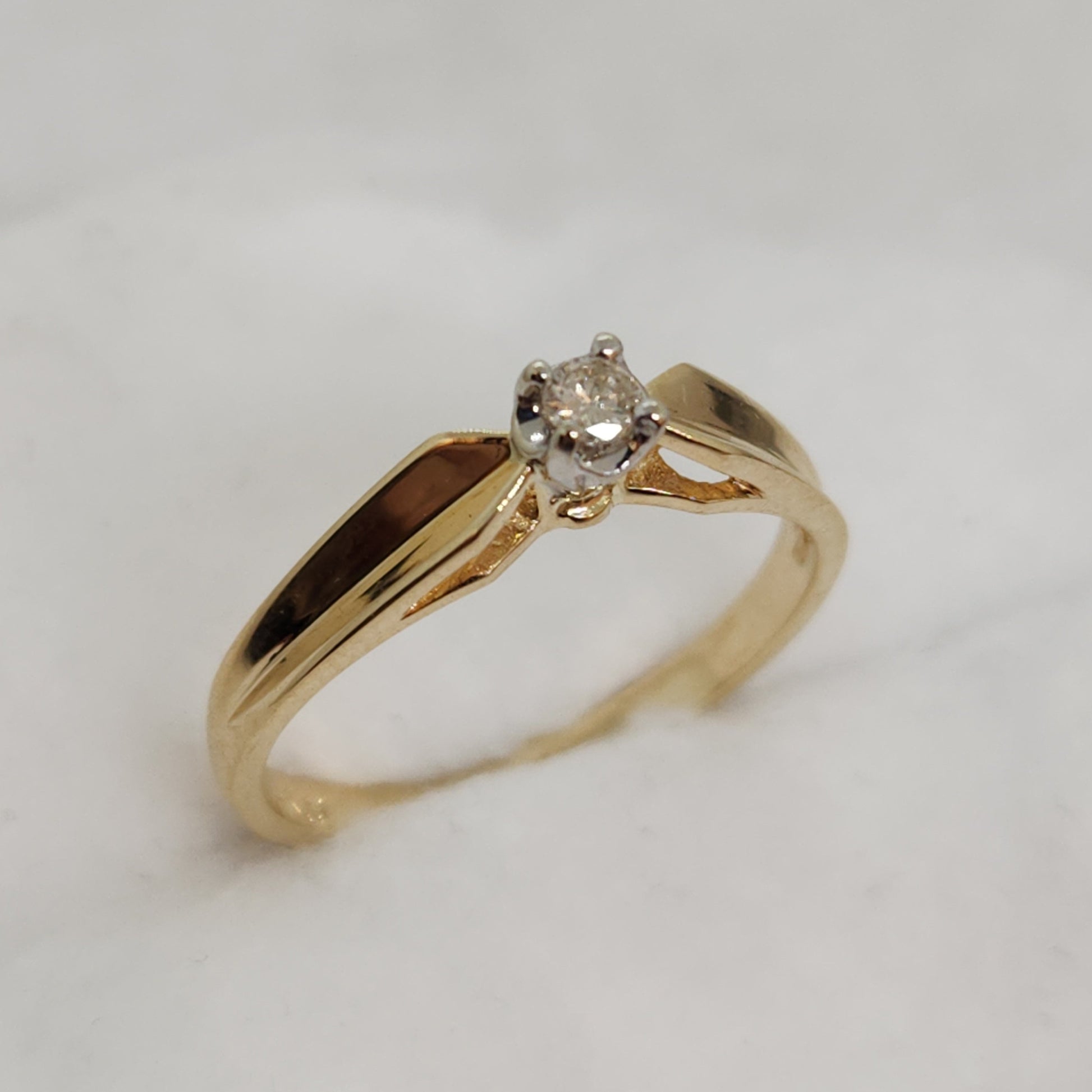 Love these golden fluted sides...gives this ring a bow look with the diamond in the center. Dainty and feminine, at a size small 8 with a high set stone, is flattering on a larger finger.
