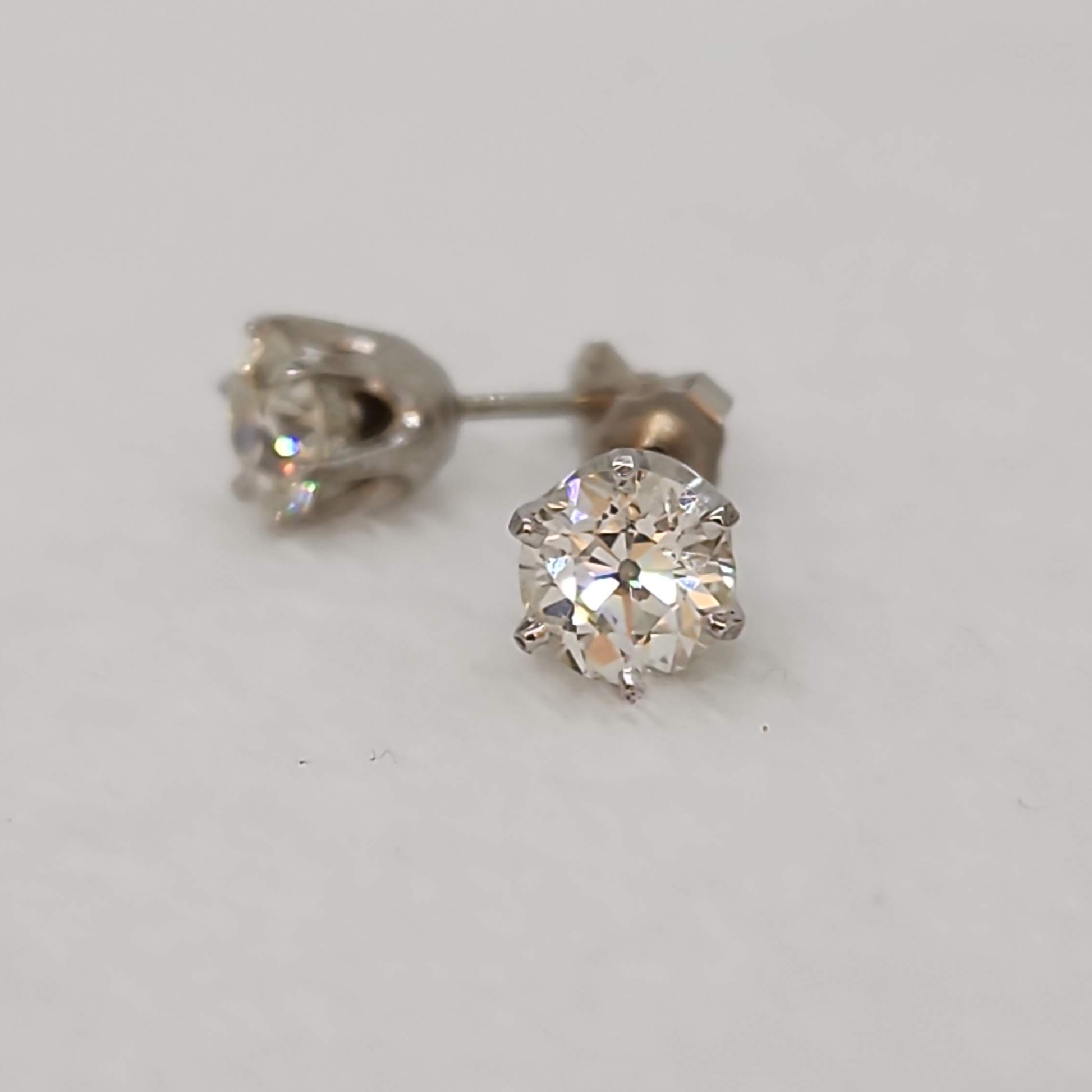 If you are looking for a pair of natural diamond studs, these are for you. This pair of Old European cut lovelies are a beautiful matched pair. Fashioned sometime between 1890-1930, these stones are 100 years old. Set in a modern six claw high setting, they float on the earlobe giving off a unique sparkle that only an Old European cut can do.