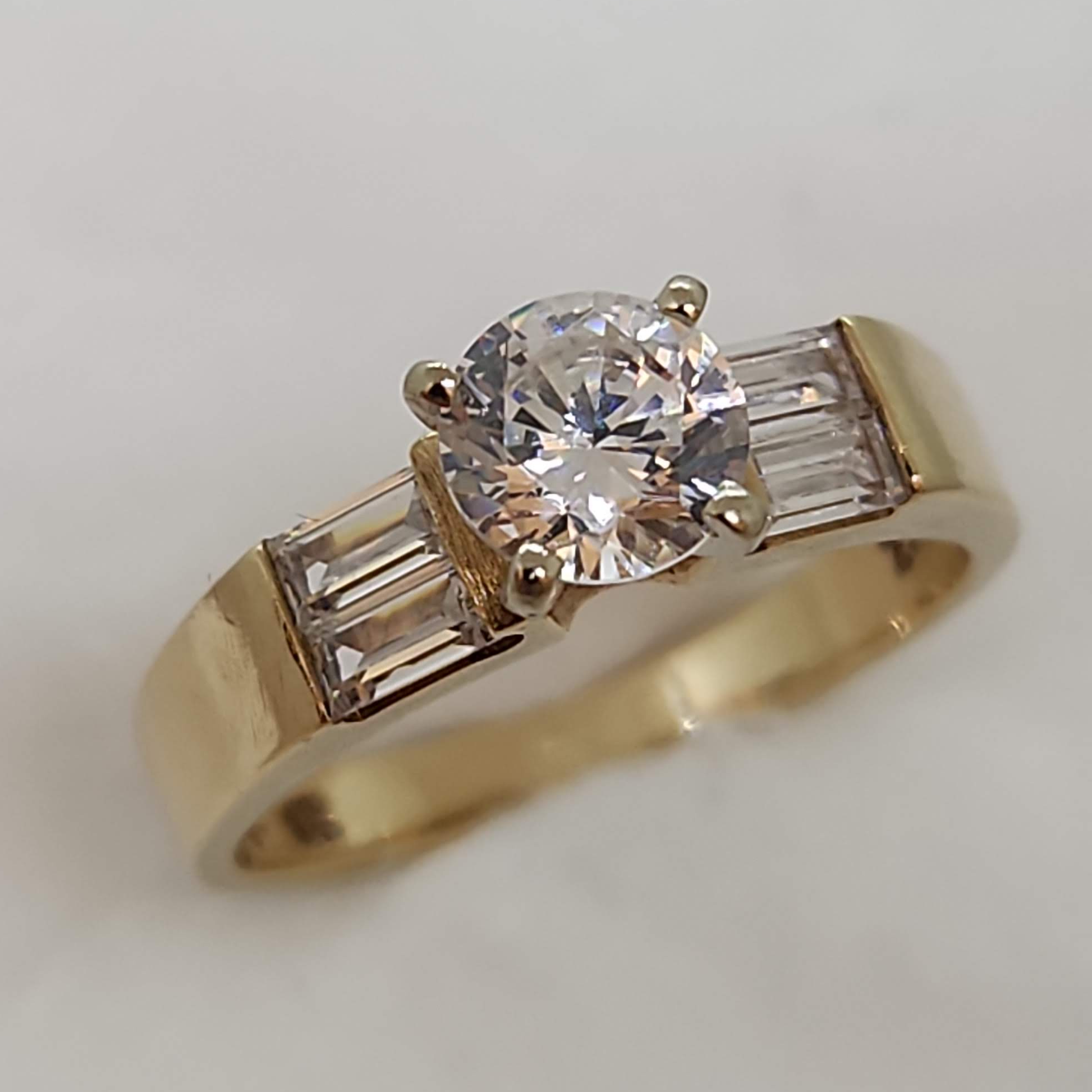 A vintage diamond alternative engagement ring from the 80s. The central Cubic Zirconia sits at a very flattering height against the side baguettes. Very budget conscious, flattering ring.