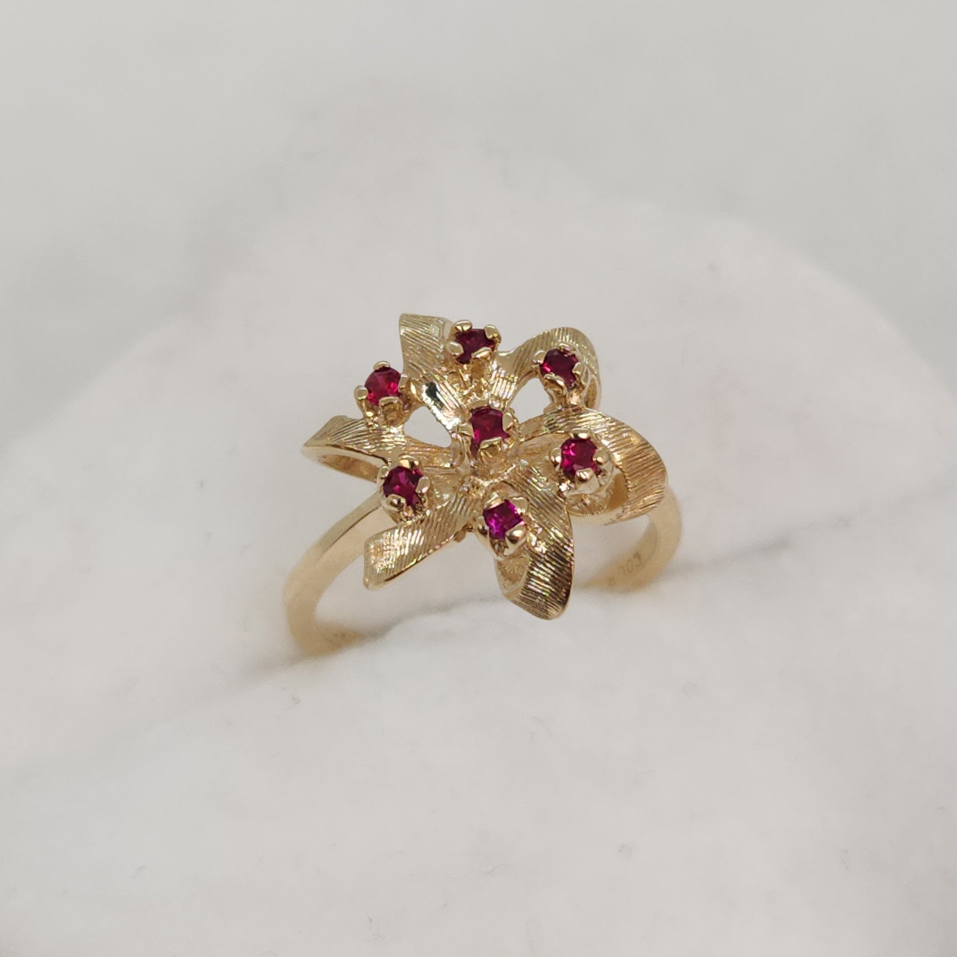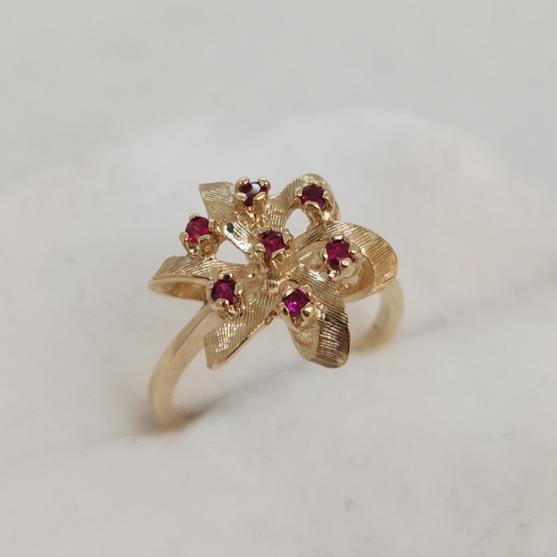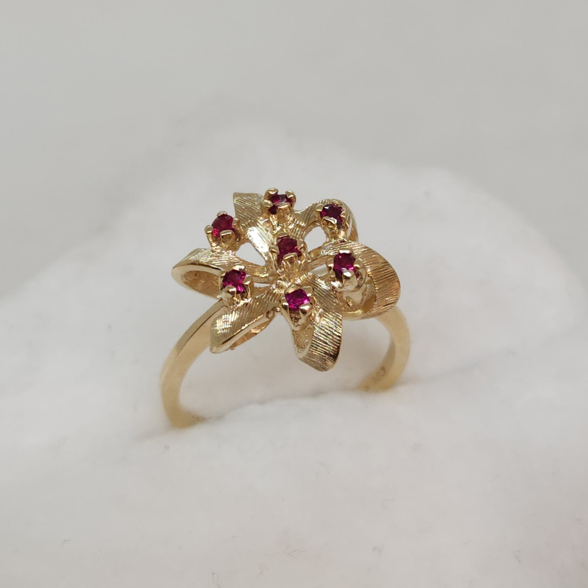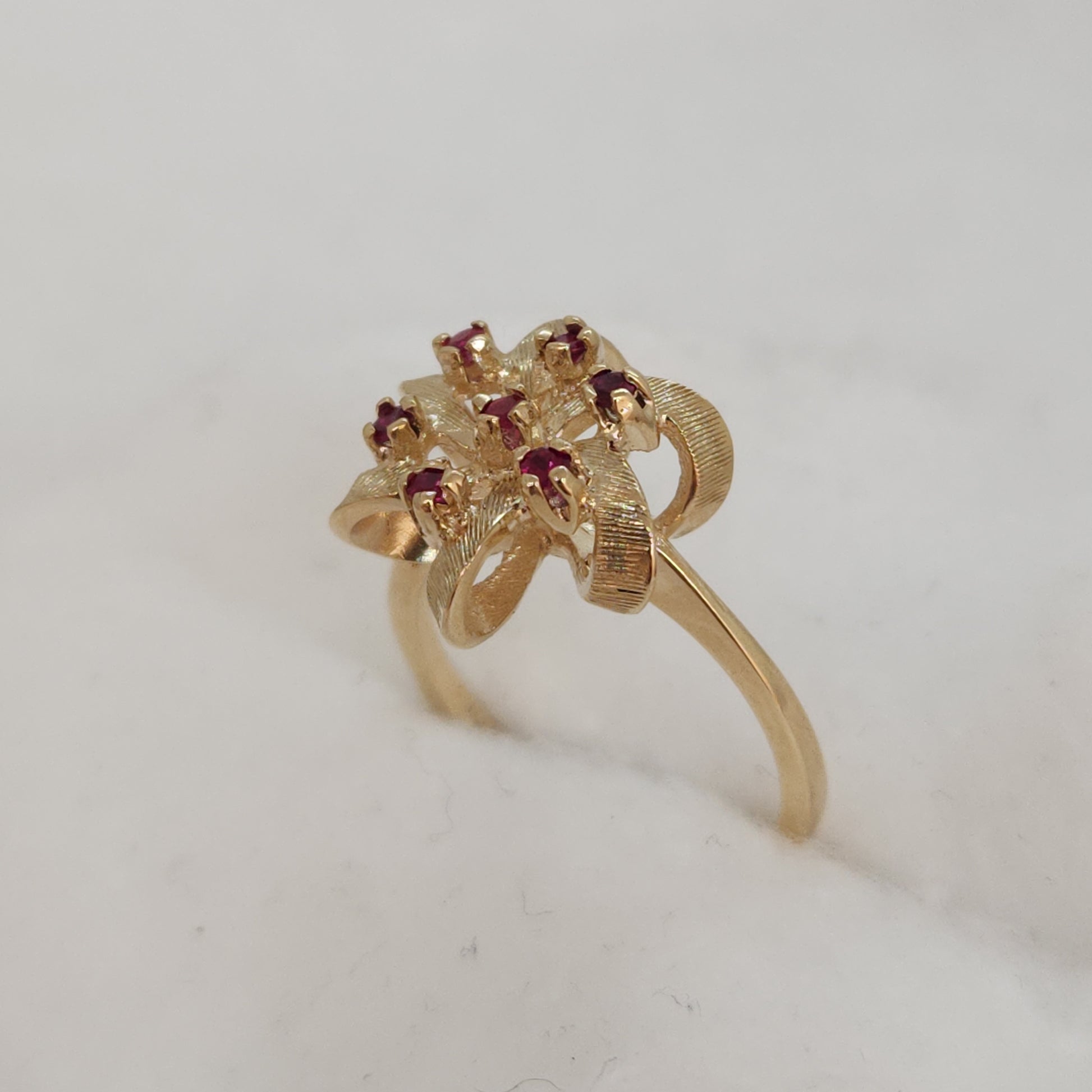 A popular design of the 80's, everything comes back around! This balances a light and airy design with height and presence on your finger. These raspberry coloured spinels are vibrant and sparkly.