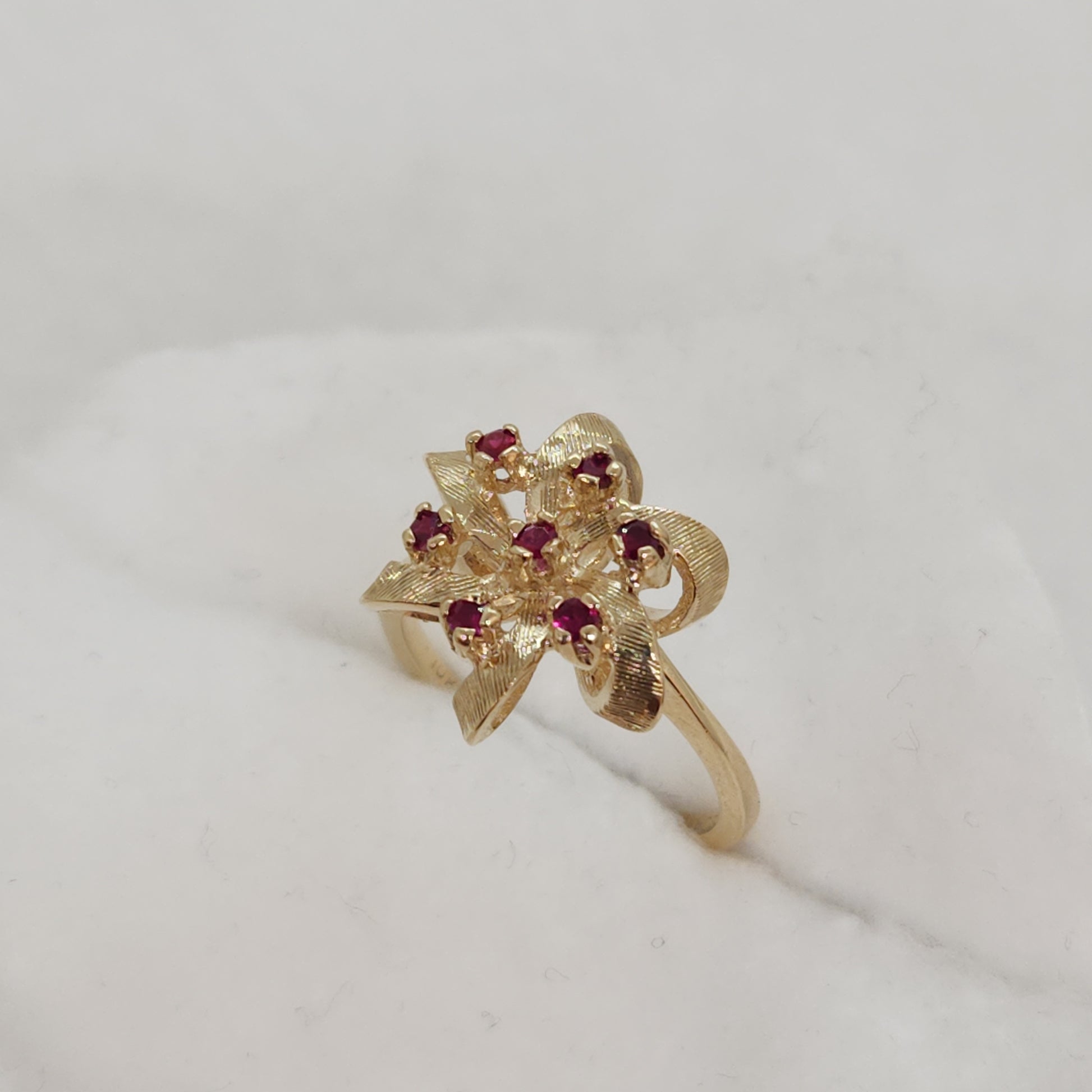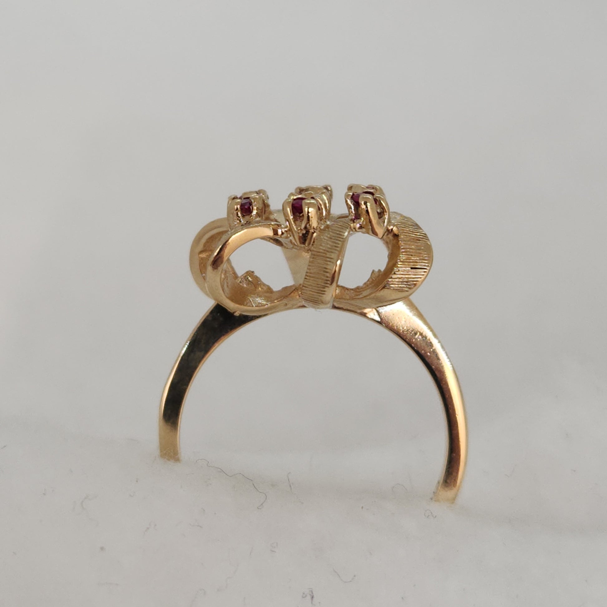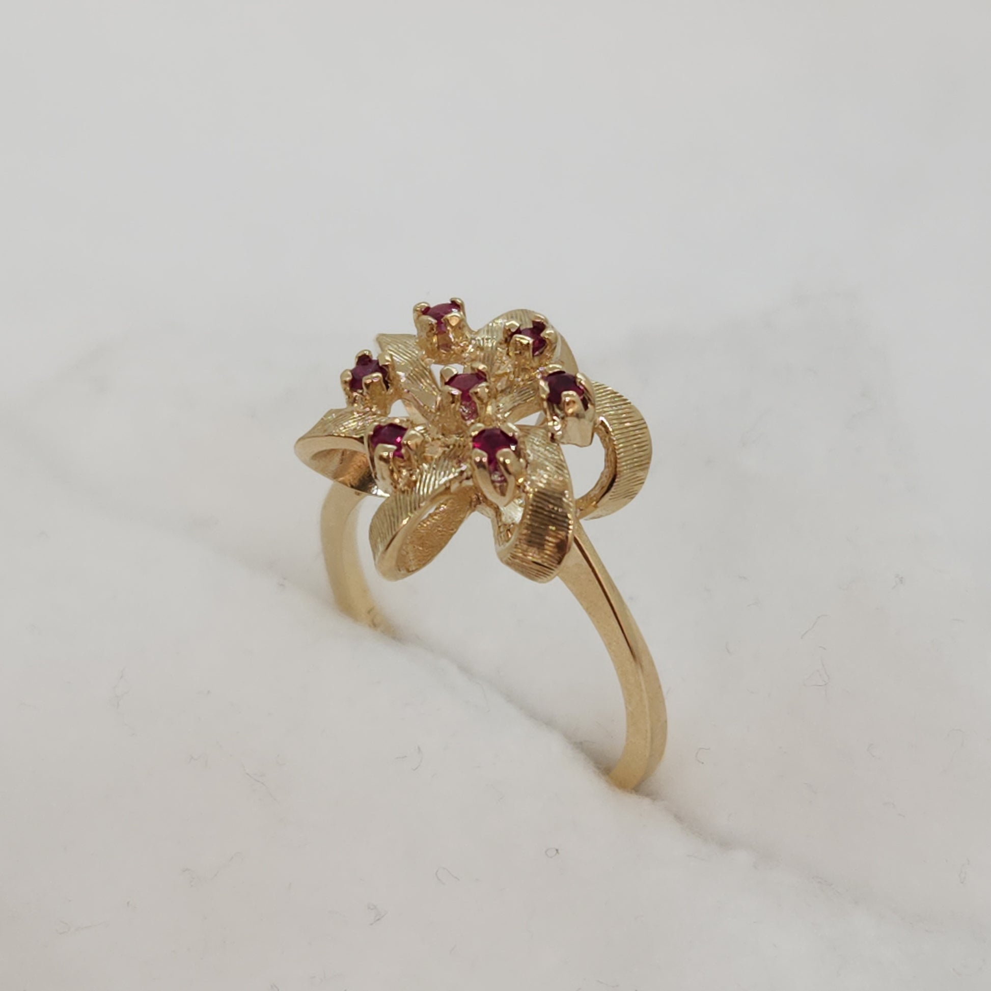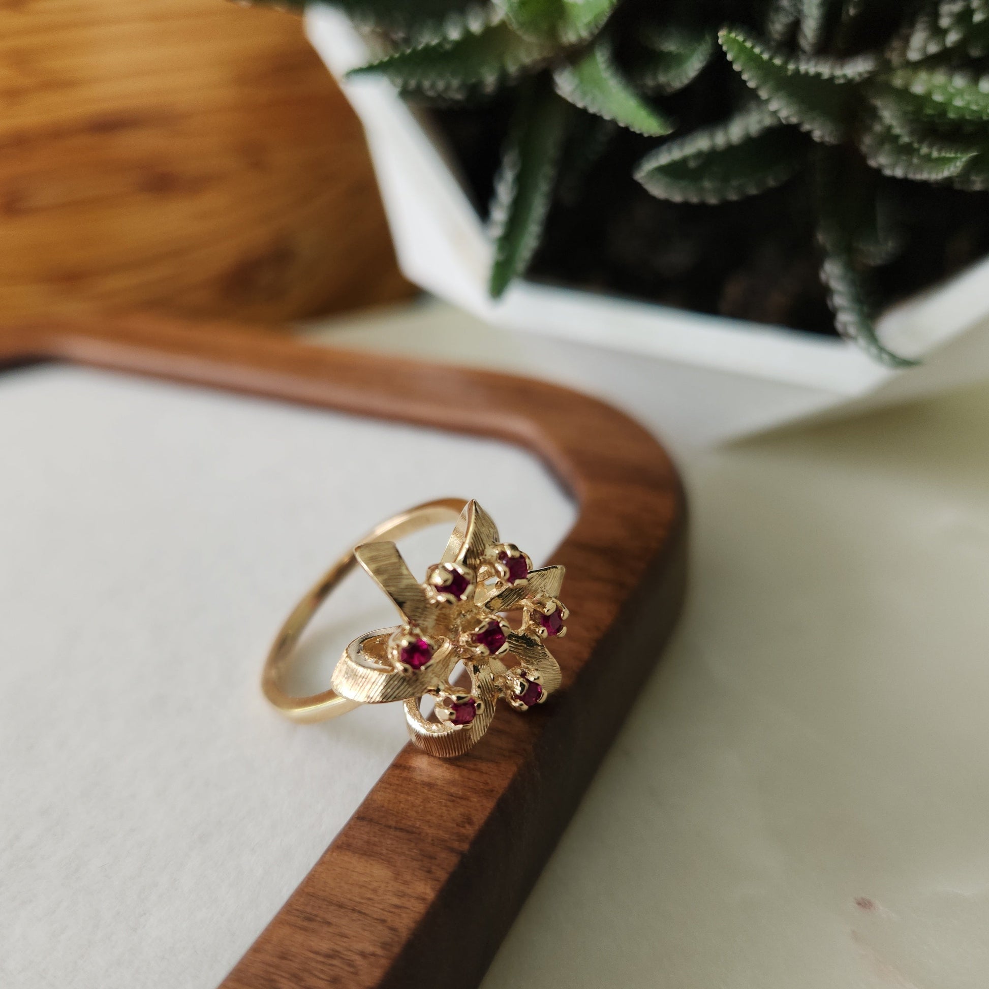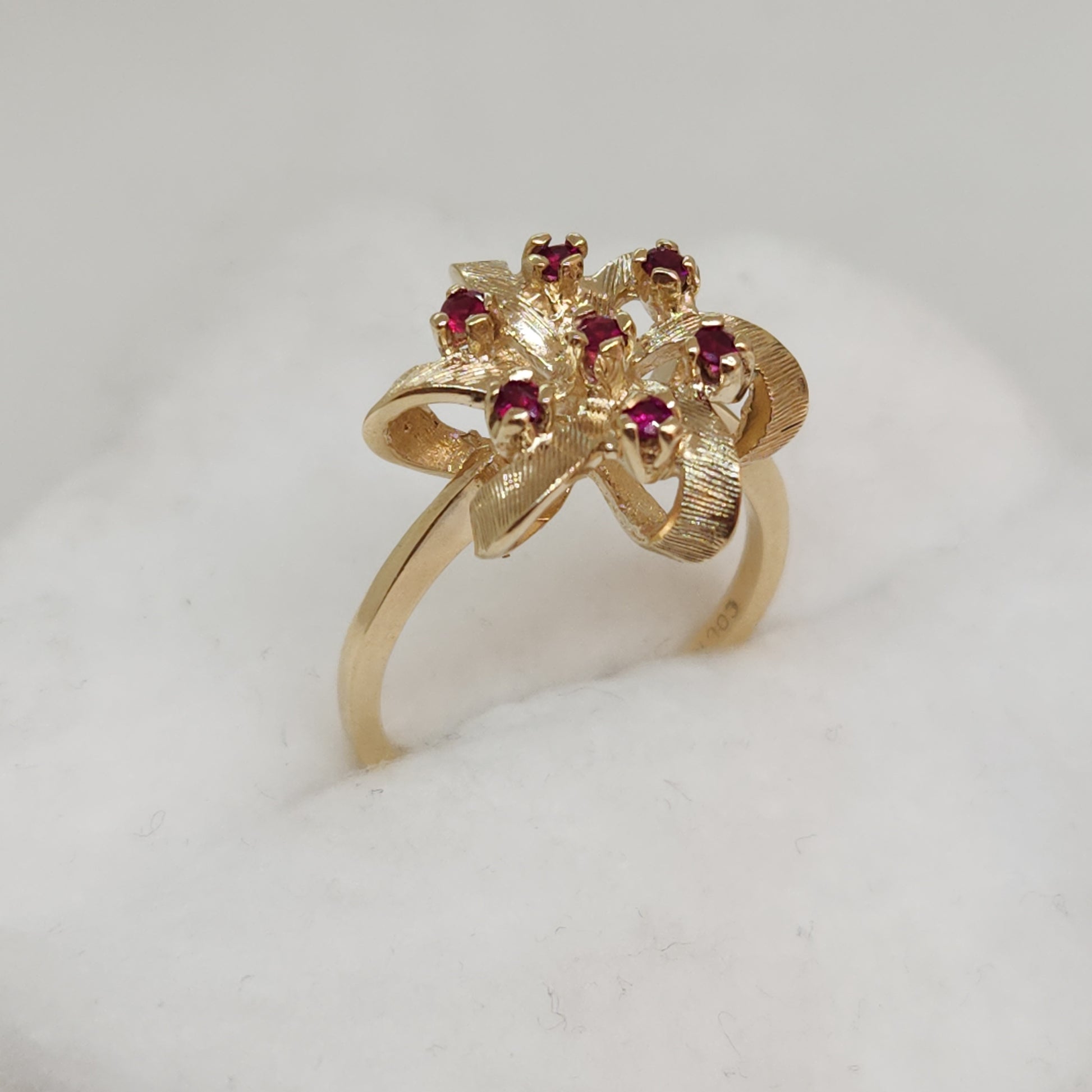 A popular design of the 80's, everything comes back around! This balances a light and airy design with height and presence on your finger. These raspberry coloured spinels are vibrant and sparkly.