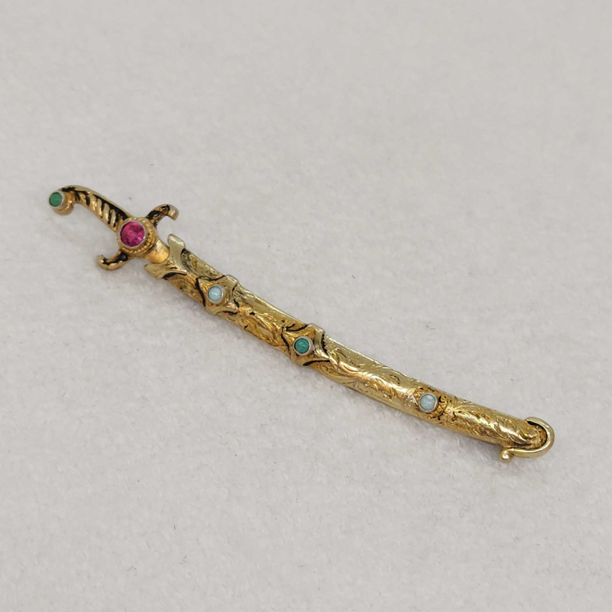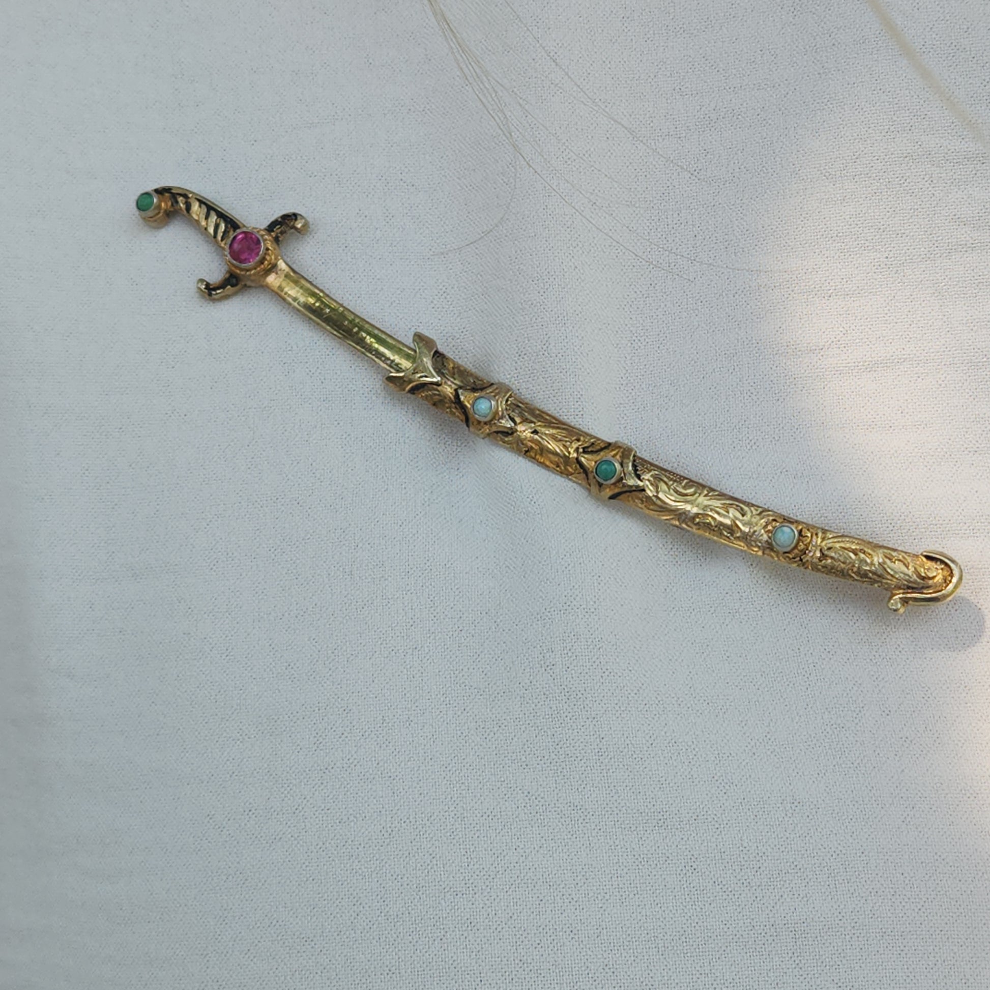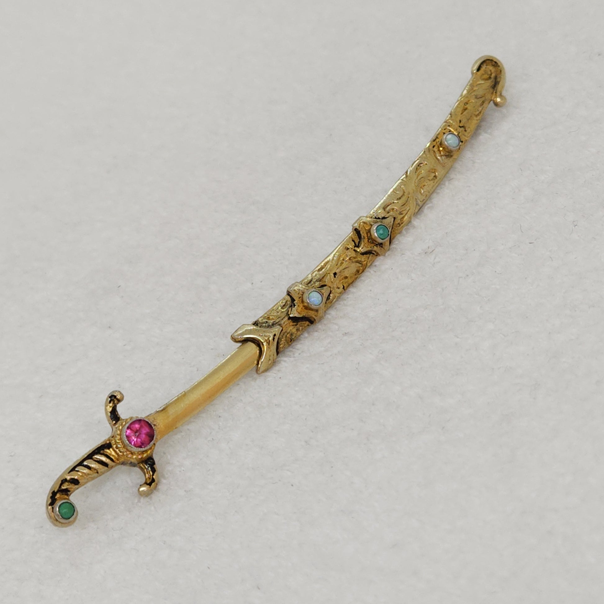 This interactive vermail brooch features an actual removable scimitar sword (don't worry, it's not sharp!), and hails from the Austro-Hungarian Empire, also known as the Dual Monarchy or the Habsburg Monarchy from the late 18th century. The scabbard sports enamel decorations inset with turquoise and other semi-precious stones, measuring approximately 3.5 inches in length. Show off your wicked side with this conversation starter - plus you'll always have a letter opener on hand whenever you choose to wear this piece!