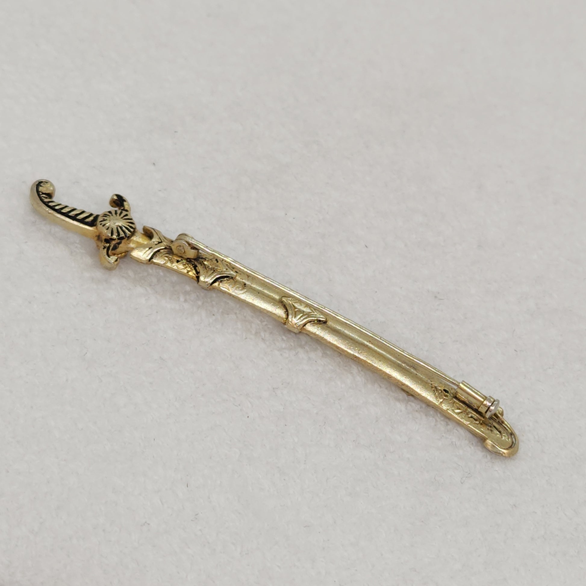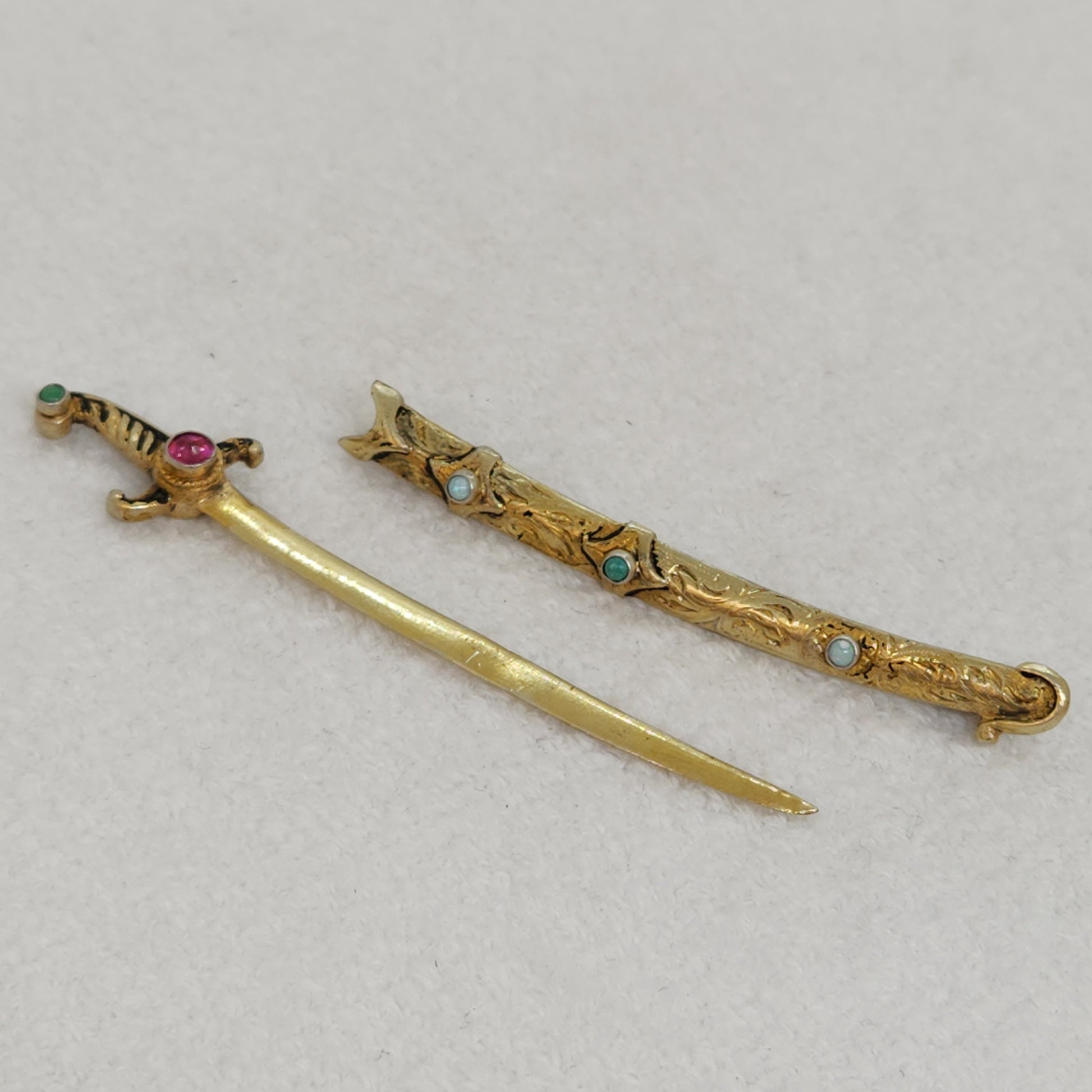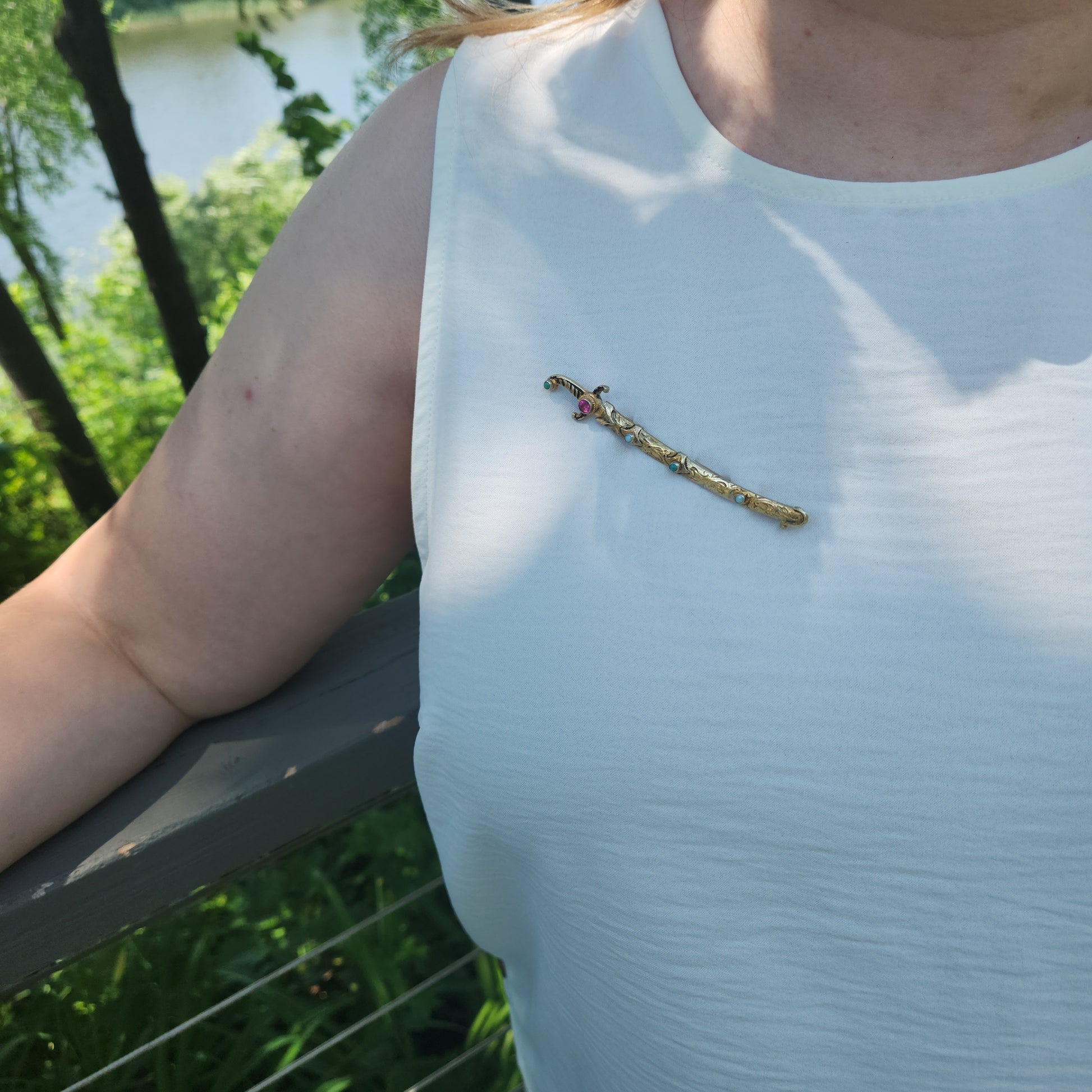 This interactive vermail brooch features an actual removable scimitar sword (don't worry, it's not sharp!), and hails from the Austro-Hungarian Empire, also known as the Dual Monarchy or the Habsburg Monarchy from the late 18th century. The scabbard sports enamel decorations inset with turquoise and other semi-precious stones, measuring approximately 3.5 inches in length. Show off your wicked side with this conversation starter - plus you'll always have a letter opener on hand whenever you choose to wear this piece!