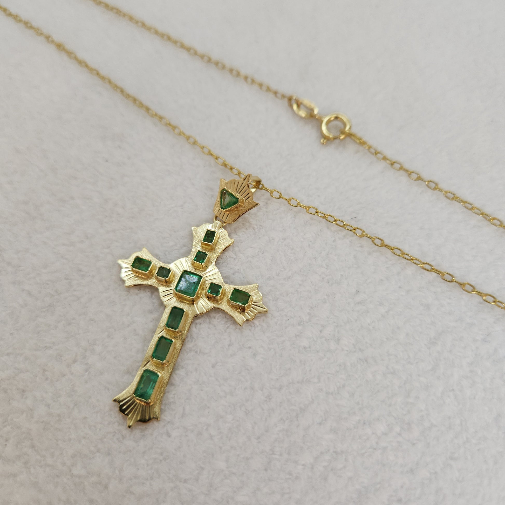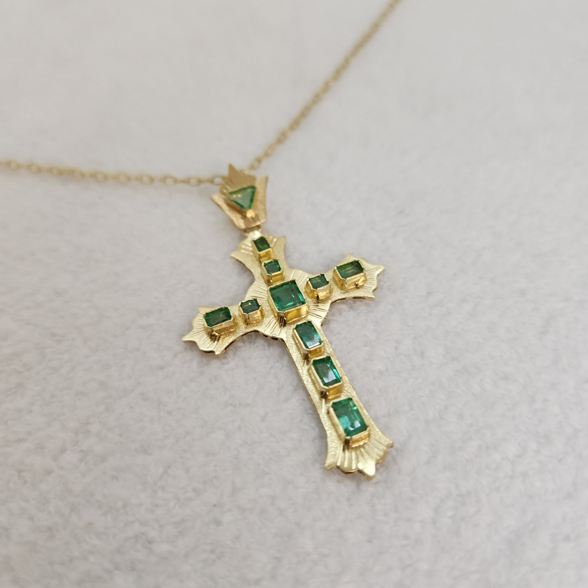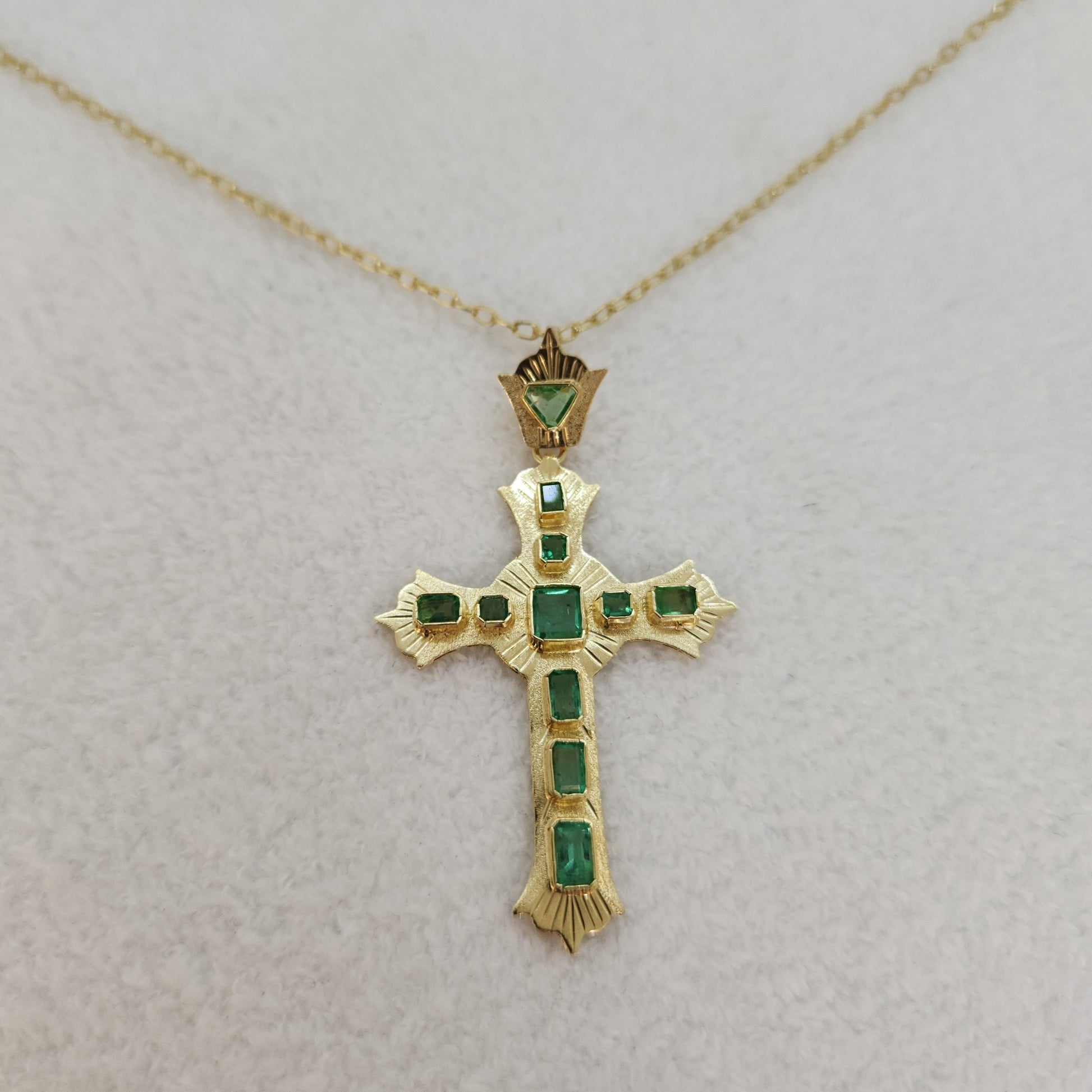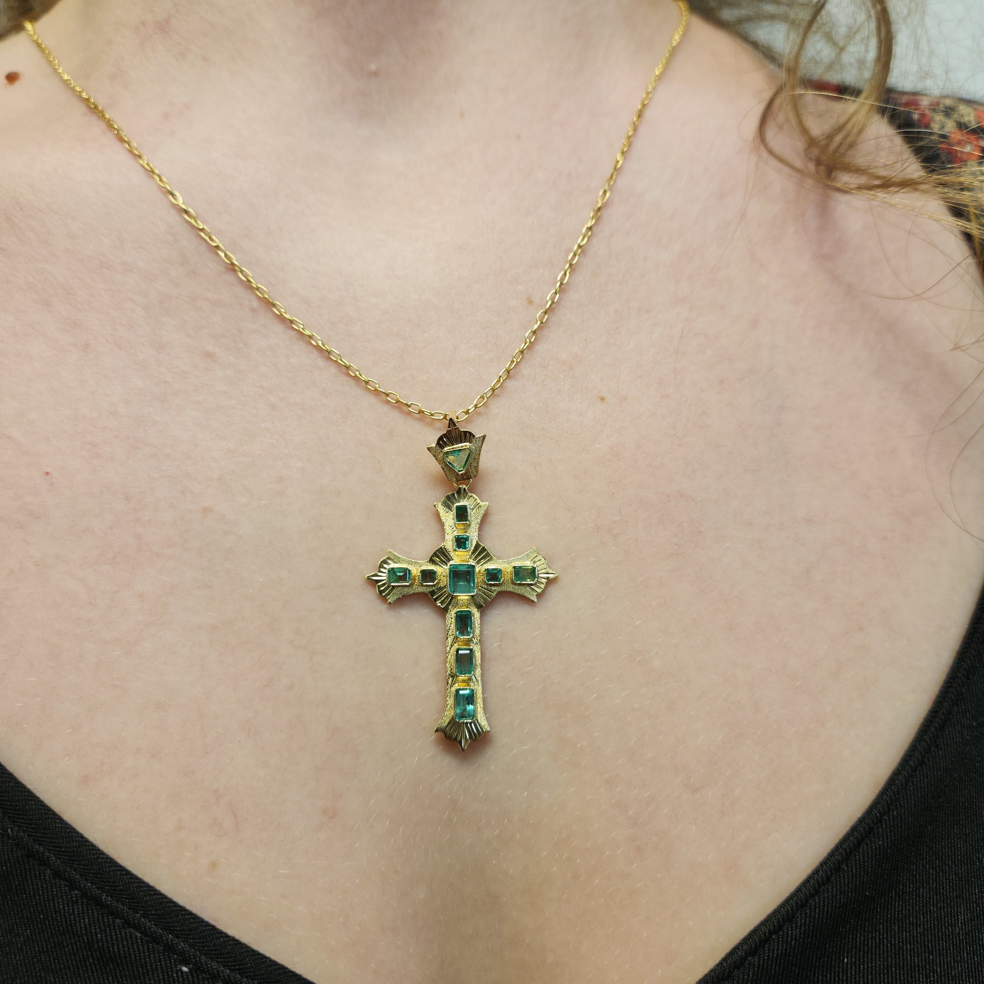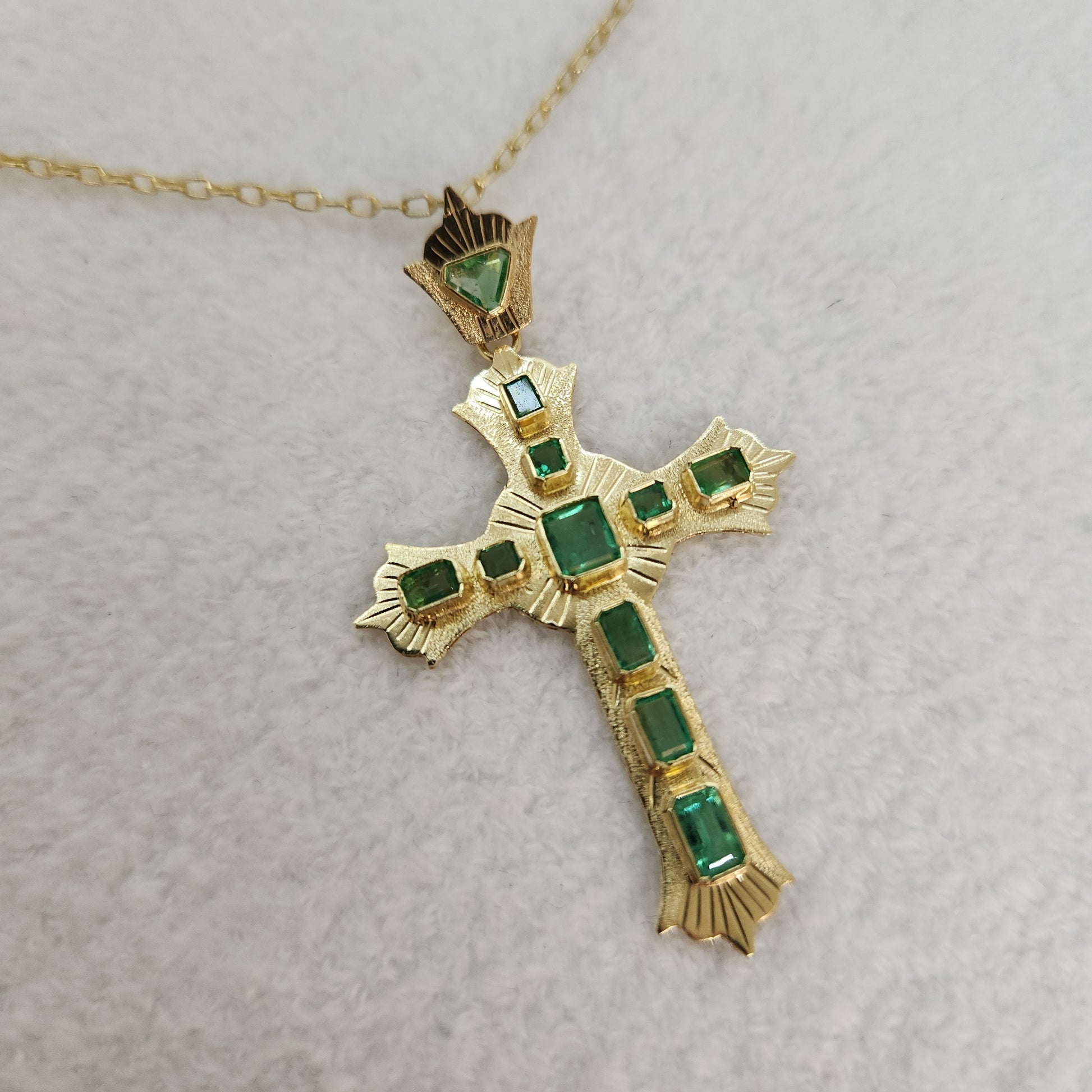 Columbian made, this is an artisanal piece that exudes character. The emeralds are a light minty green, they are quite clean and the light reflects beautifully within each stone. We can almost imagine the goldsmith that would have sorted the stones to arrange them "just so" and solder each of the settings made specifically to each individual emerald.