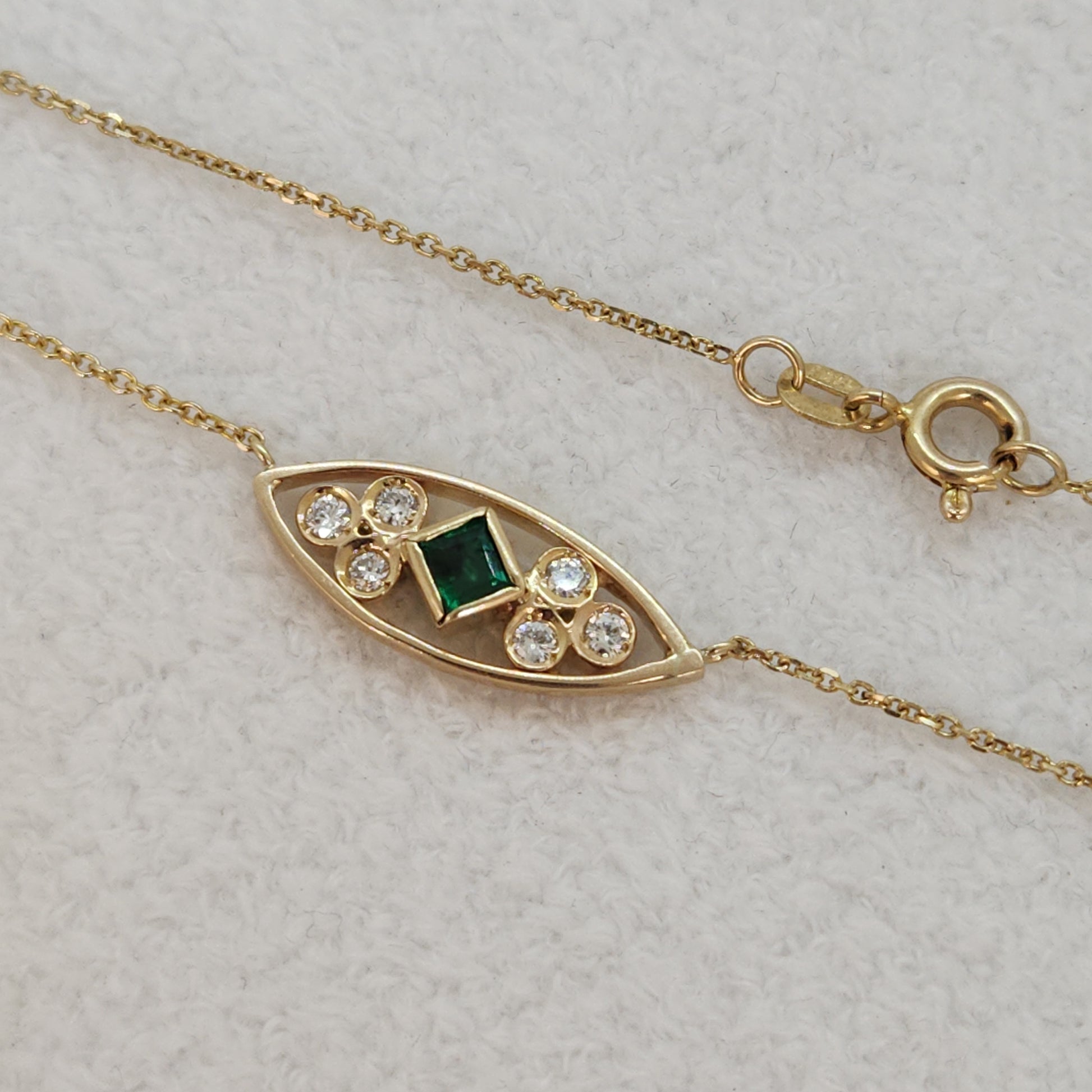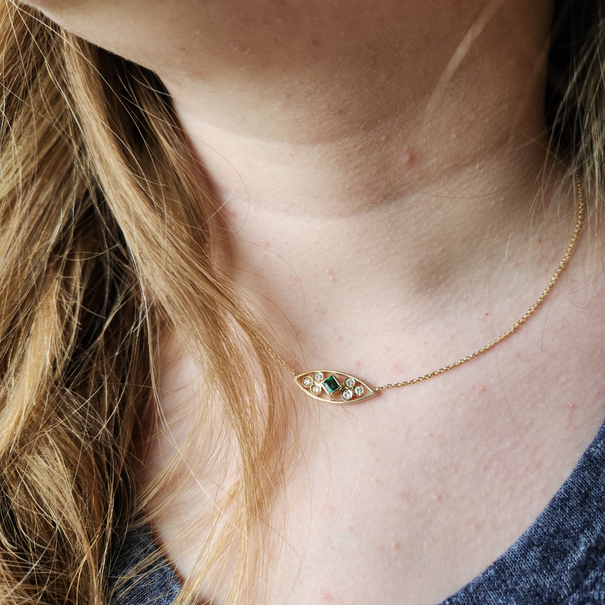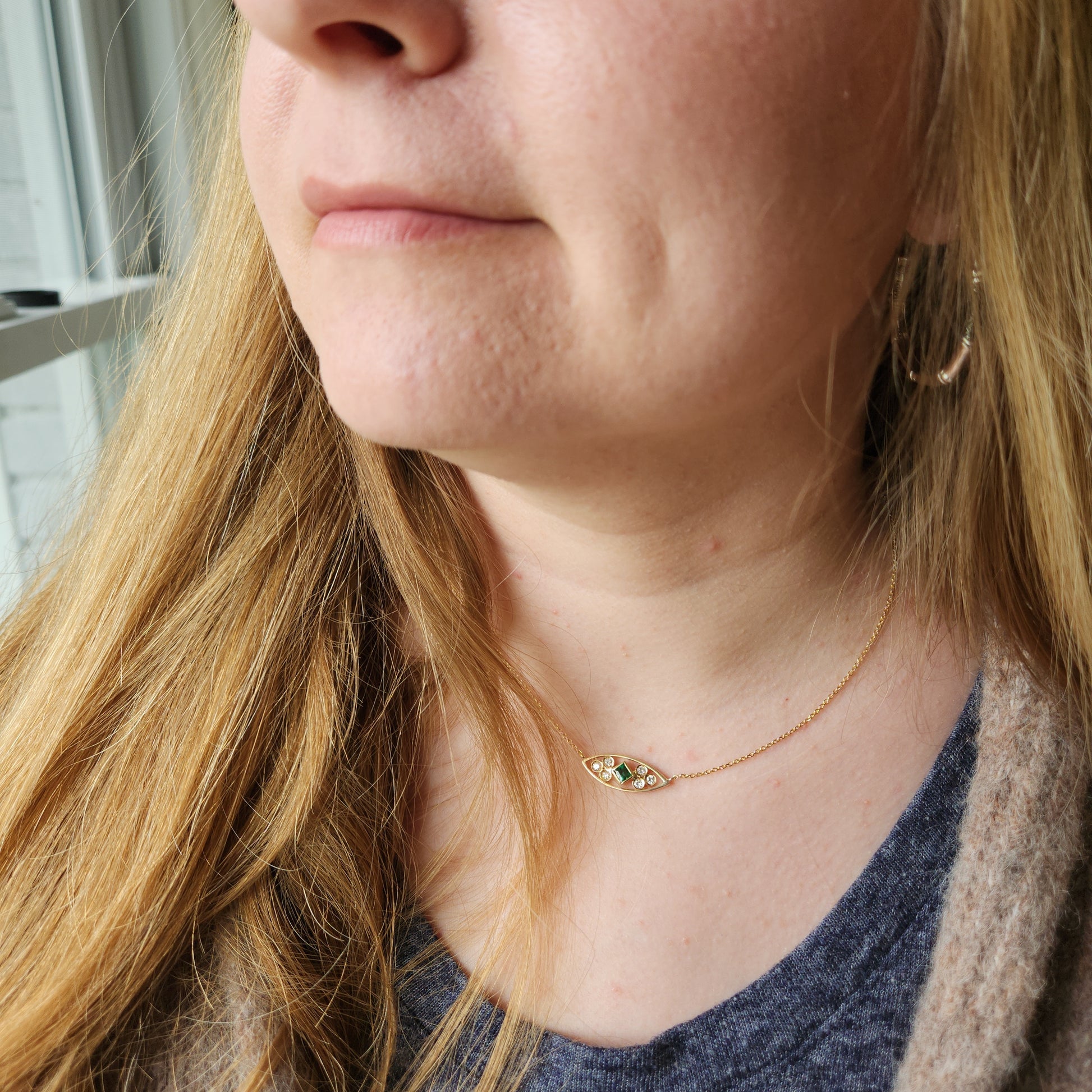 Embrace your wild side! Vibrant and lush, the green on this emerald can be seen from across the room. This is a handcrafted piece, and oh-so-unique. Sitting high on the neck, this can be worn with so many necklines.