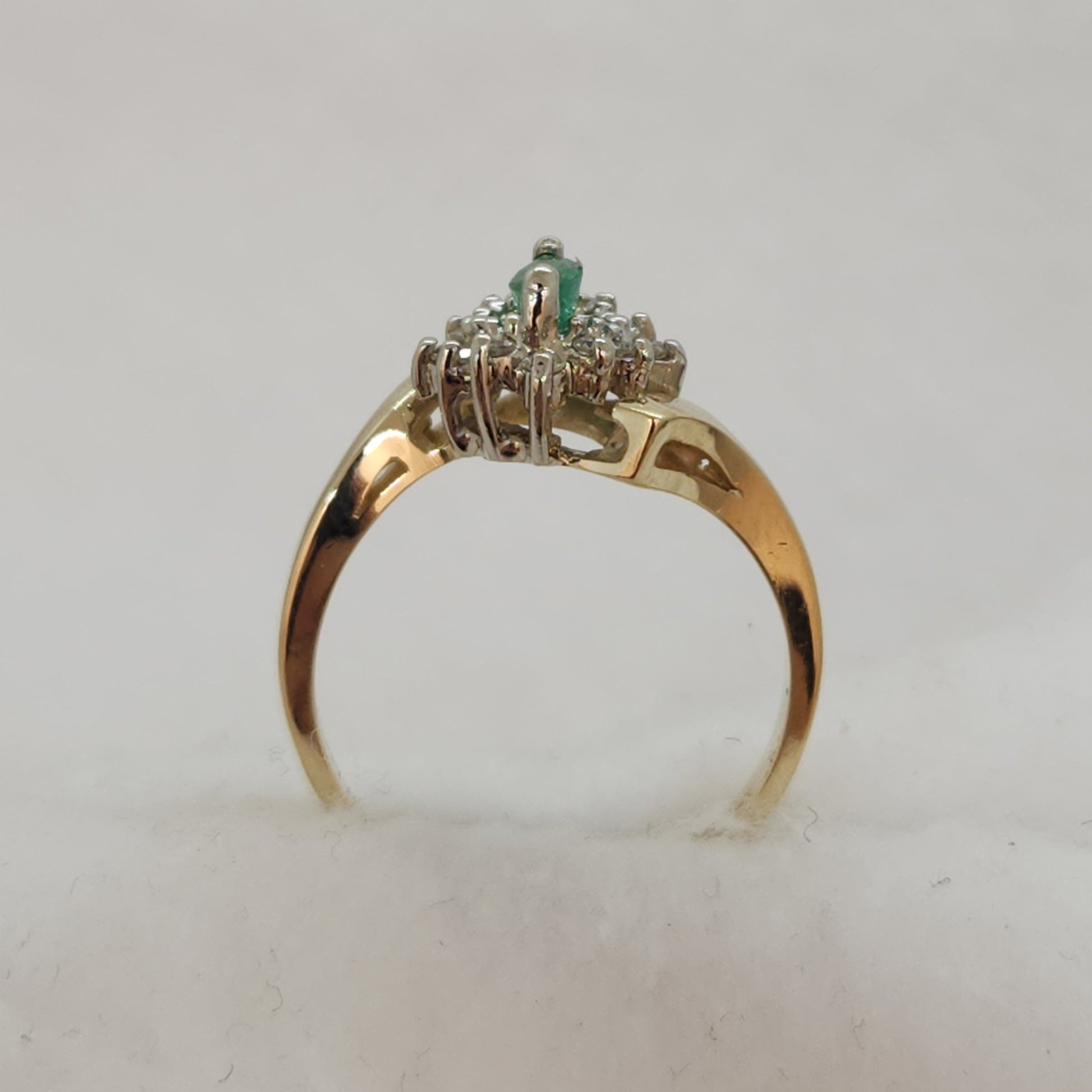 When you want to be a little different from the crowd, choose a marquise cut! This stunning bypass features a light emerald, akin to the color of freshly cut grass, and is joined by 12 sparkling single cut diamonds surrounding the central stone.