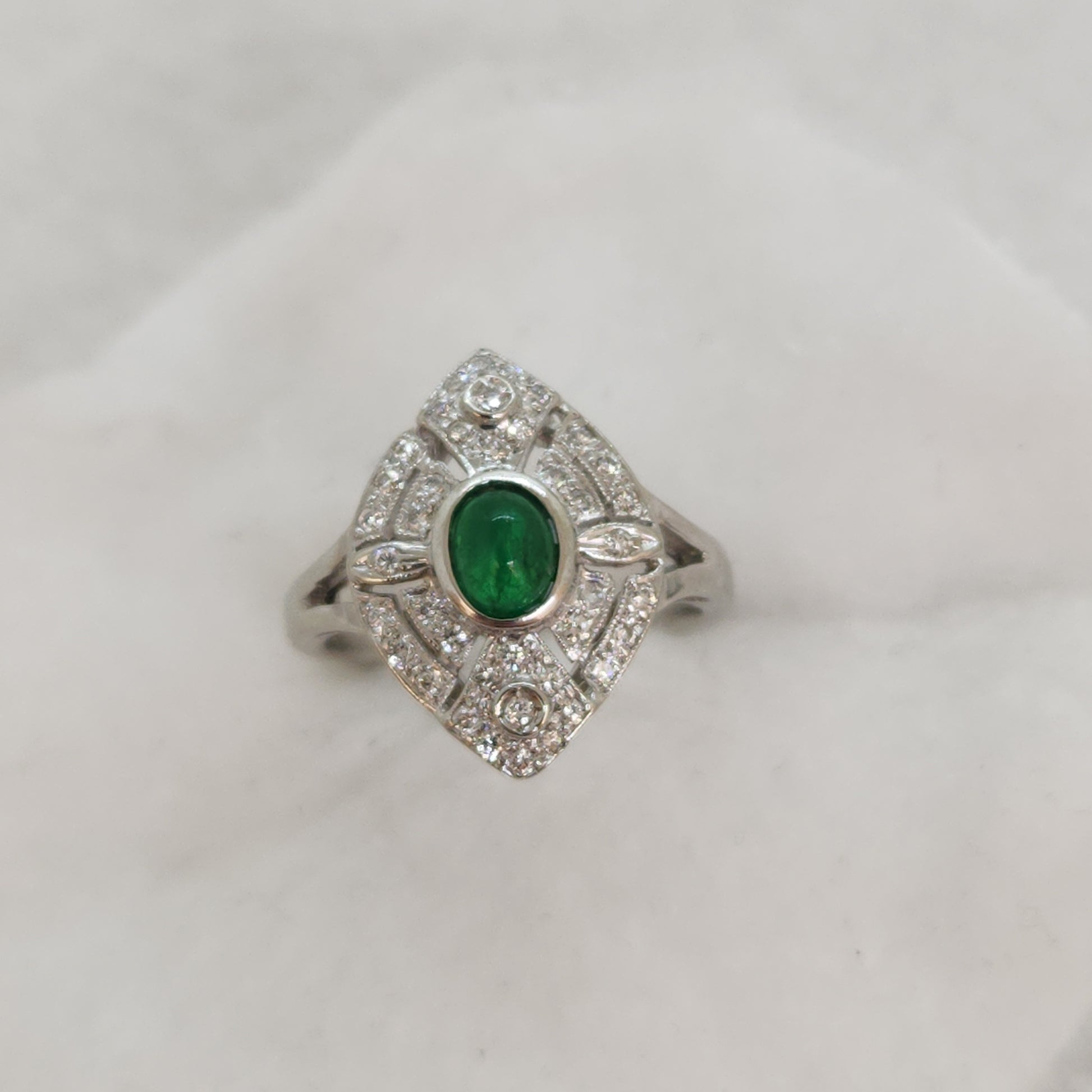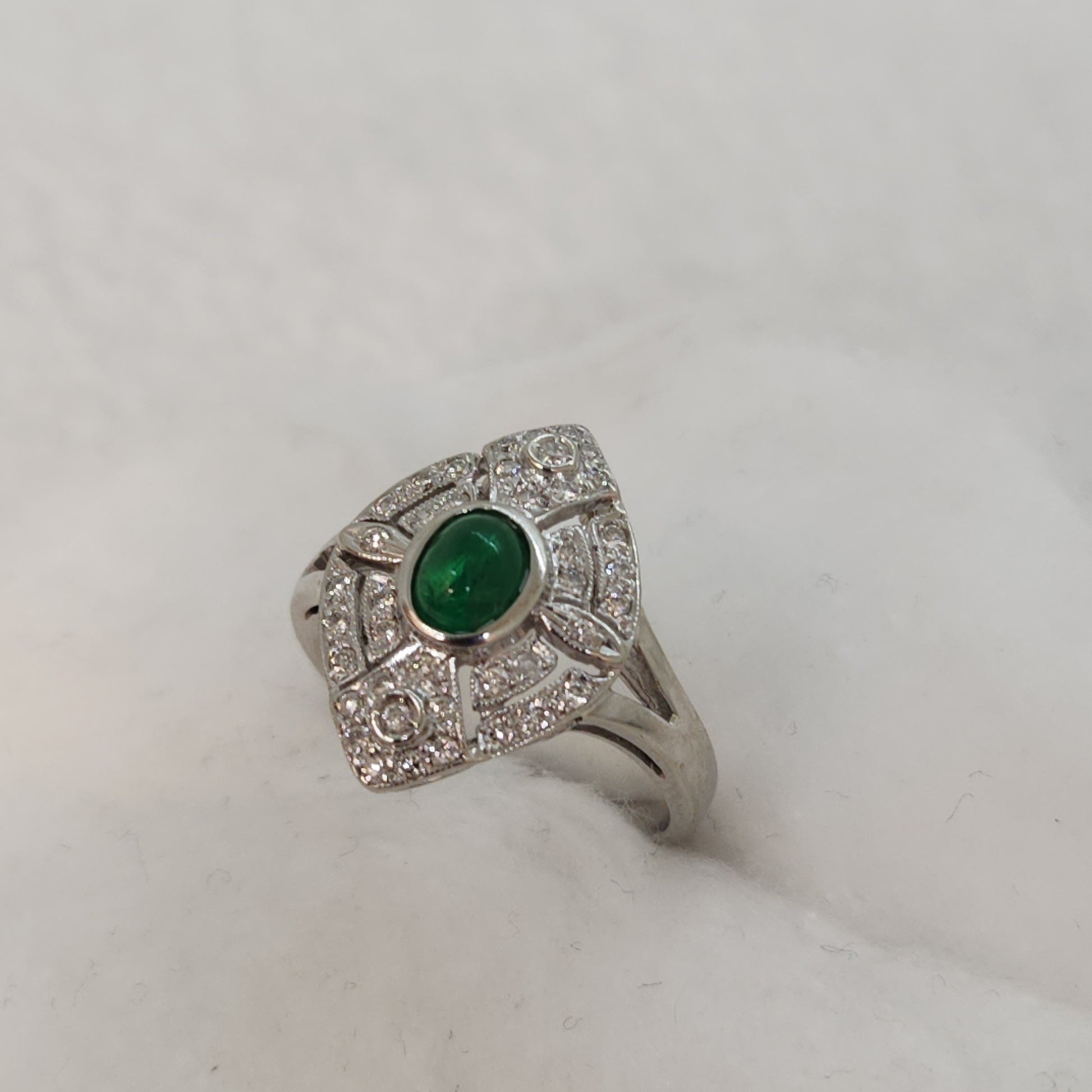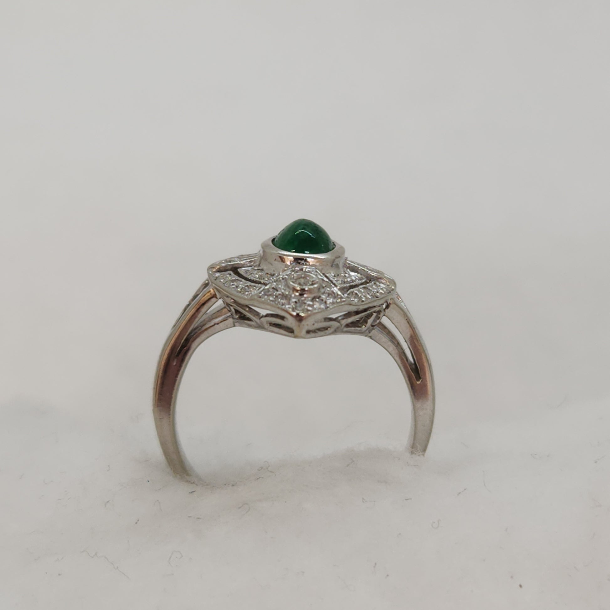 Refined elegance perfectly describes this little lady. Beautiful 18k white gold manufactured ring made in North America circa 1970's. The diamonds are of very high quality and the showstopper central cabochon cut emerald is a vibrant grass green. At a smaller size of 4.25, this is lovely on a smaller hand, it also makes for a perfect pinky ring.