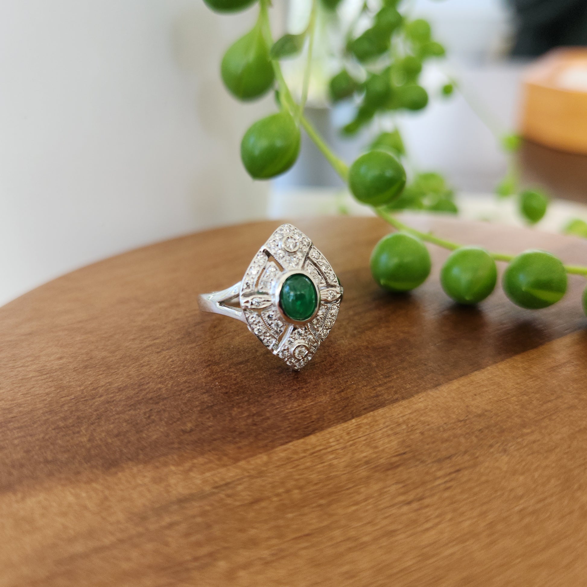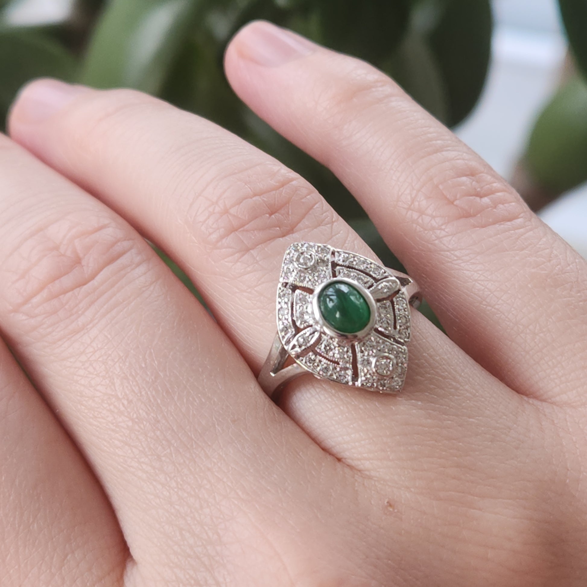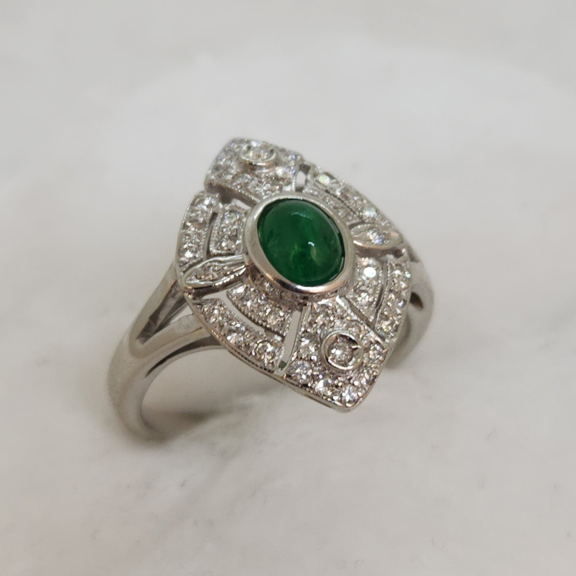Refined elegance perfectly describes this little lady. Beautiful 18k white gold manufactured ring made in North America circa 1970's. The diamonds are of very high quality and the showstopper central cabochon cut emerald is a vibrant grass green. At a smaller size of 4.25, this is lovely on a smaller hand, it also makes for a perfect pinky ring.