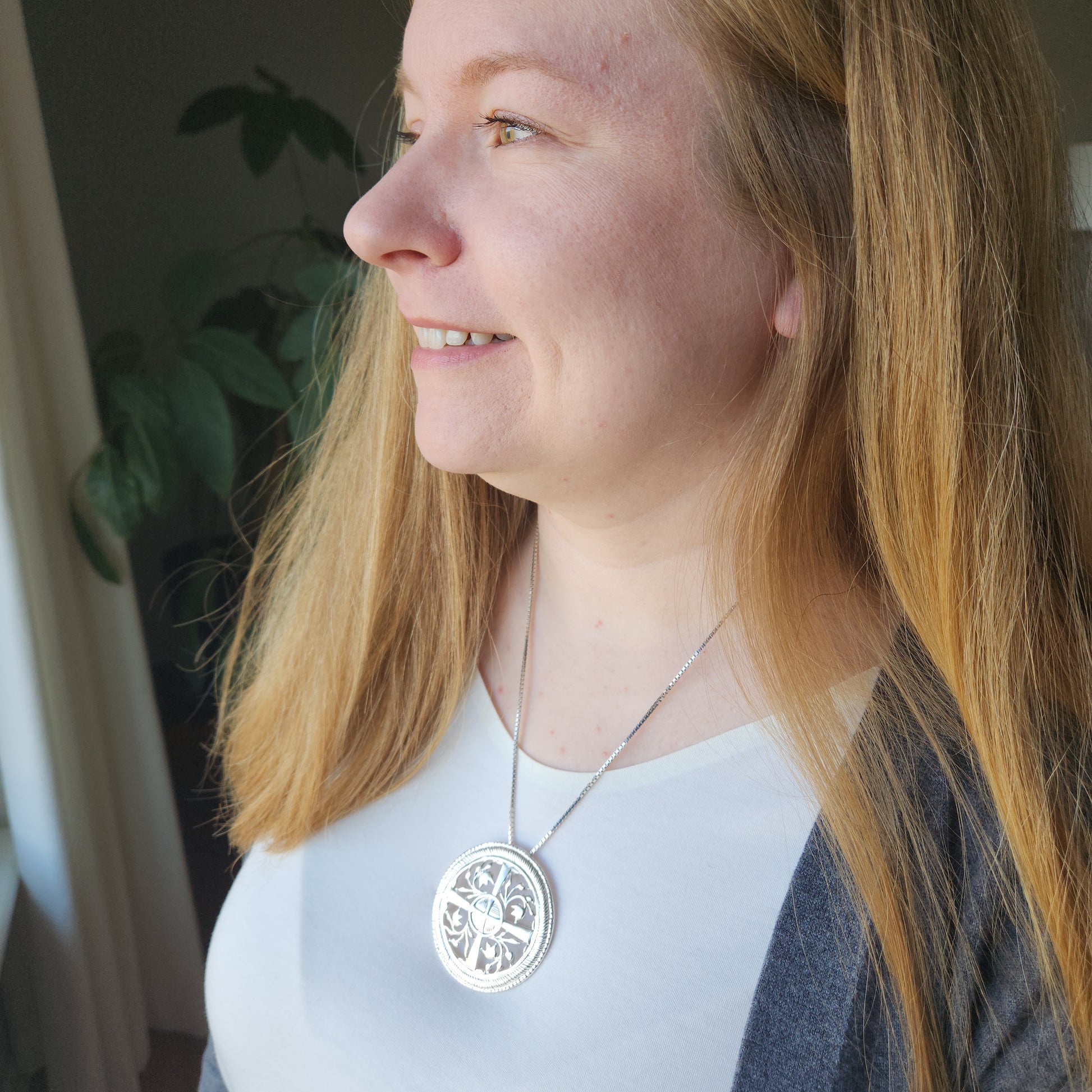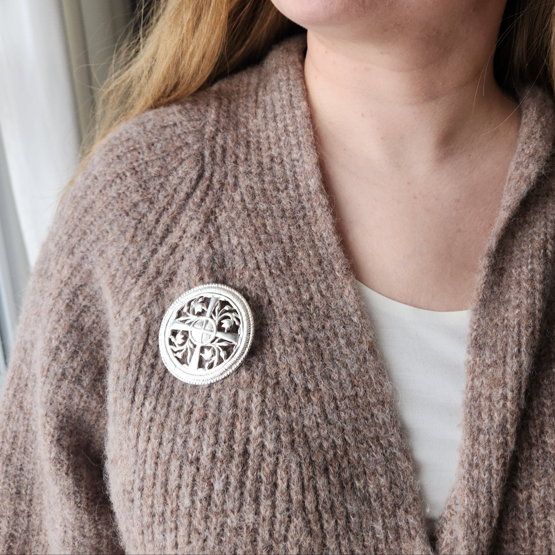 Made and designed by the Finnish designer Kalevala, a company that has been around since 1937. They are rooted in equality and sustainable values, 1/3 of their profits are used for charity projects. With this, they have developed a society of clients that wear their distinct jewellery as a symbol of helping to create a better tomorrow. Visit their website below to see their current designs. This piece can be worn as a brooch or a pendant.