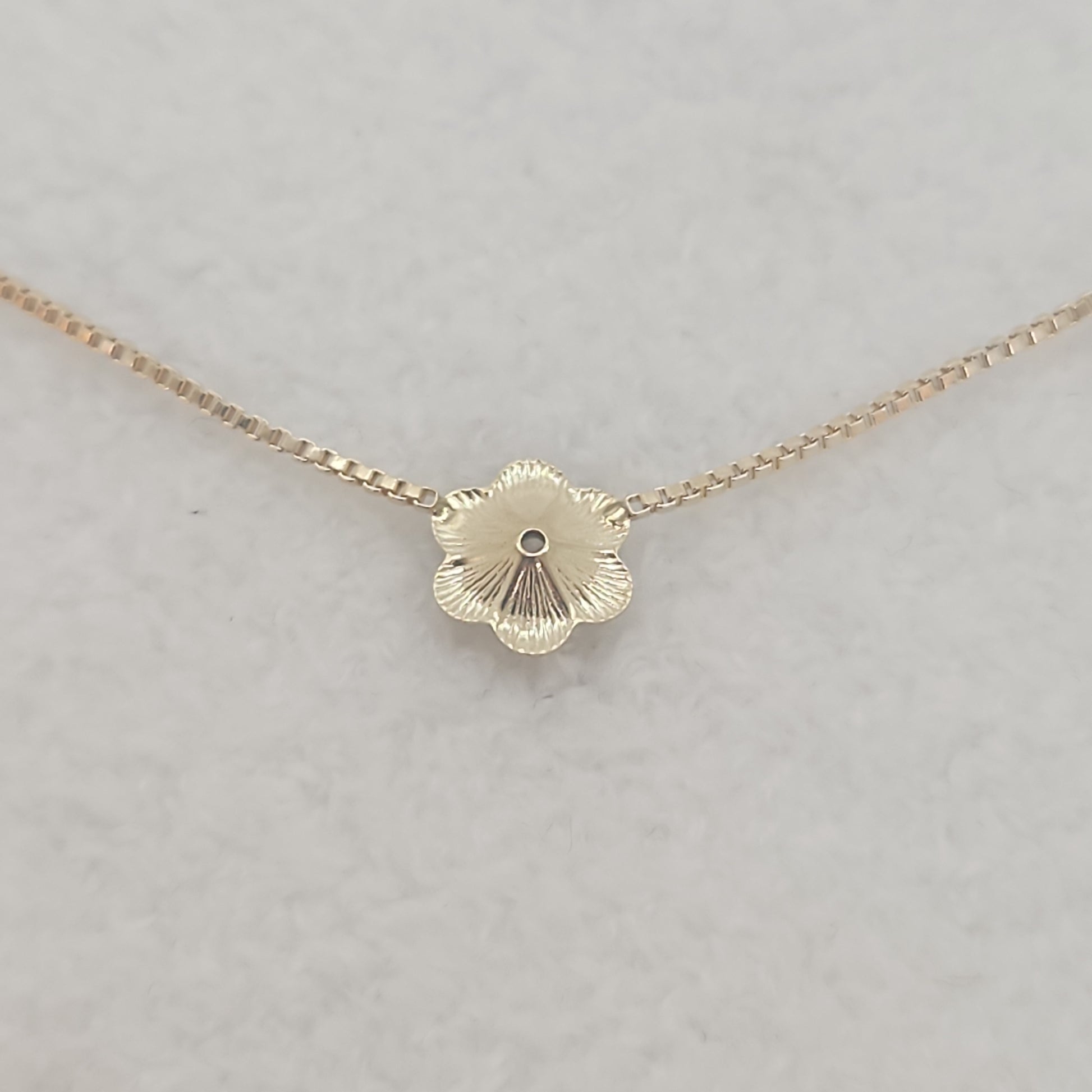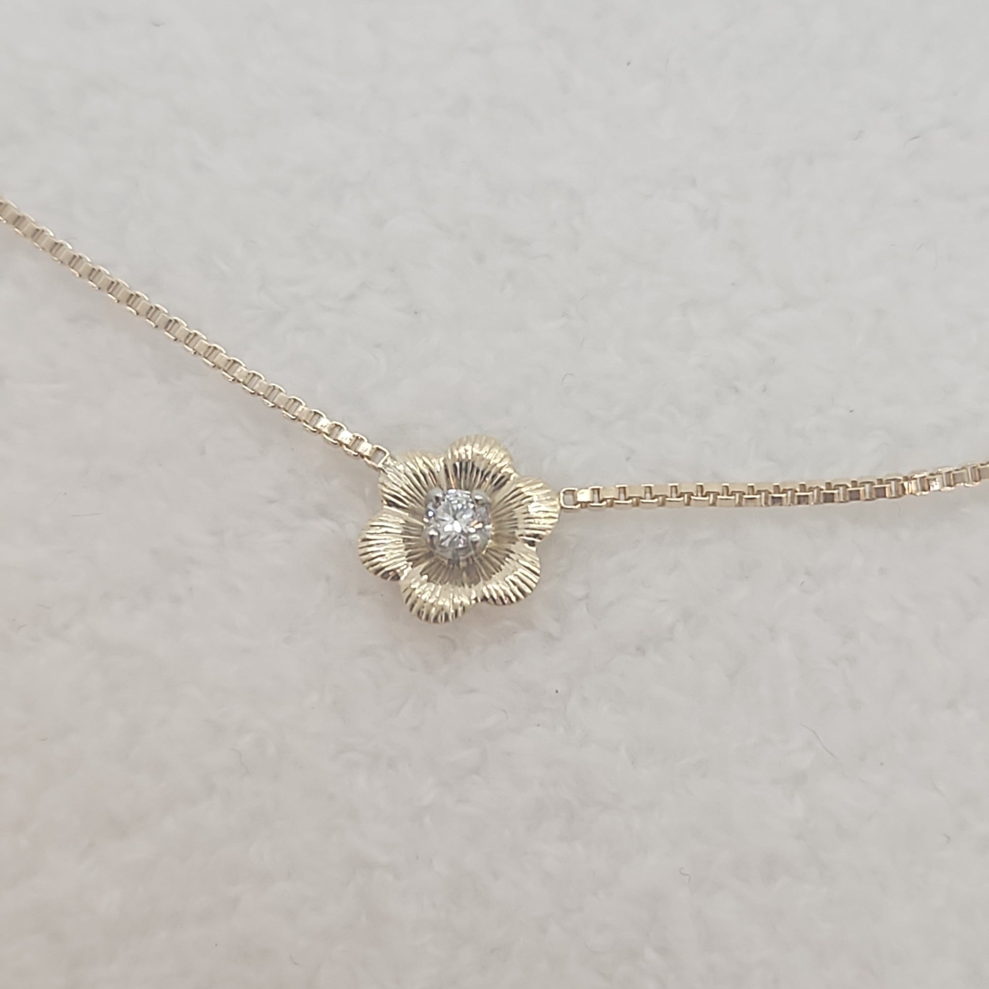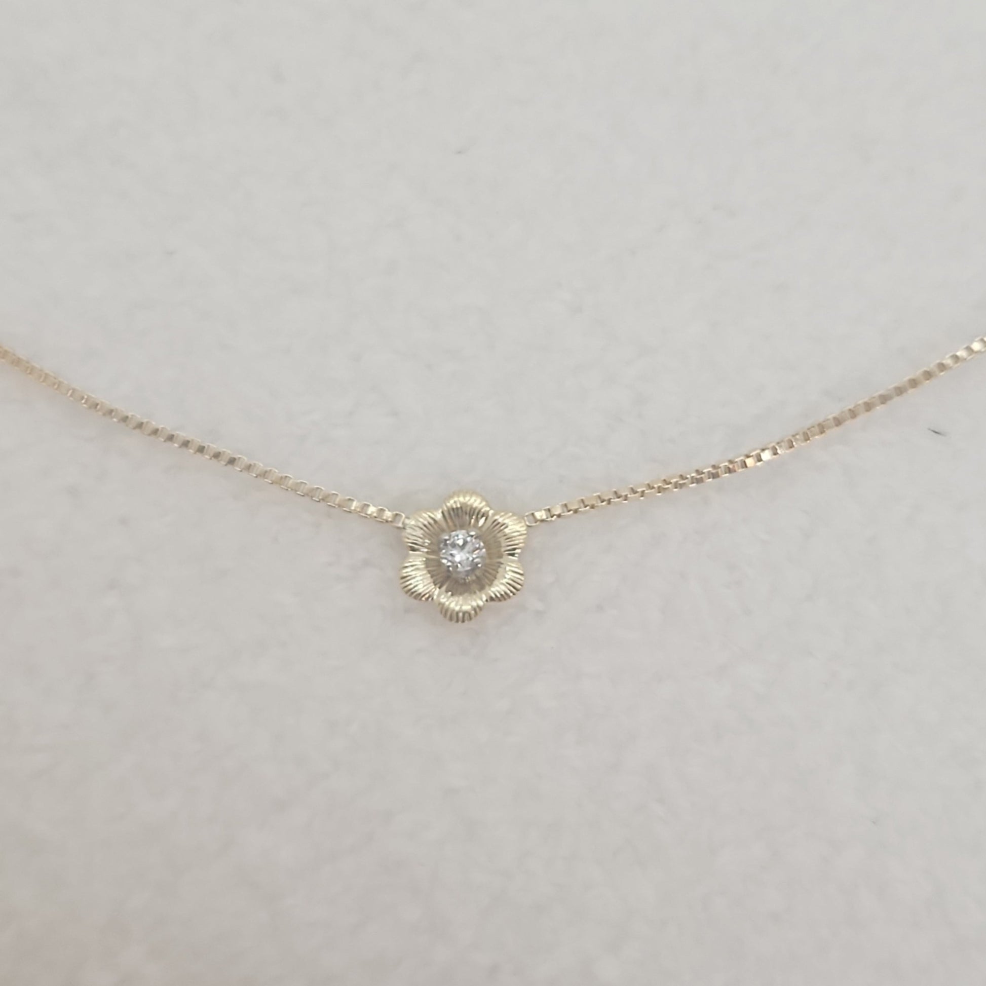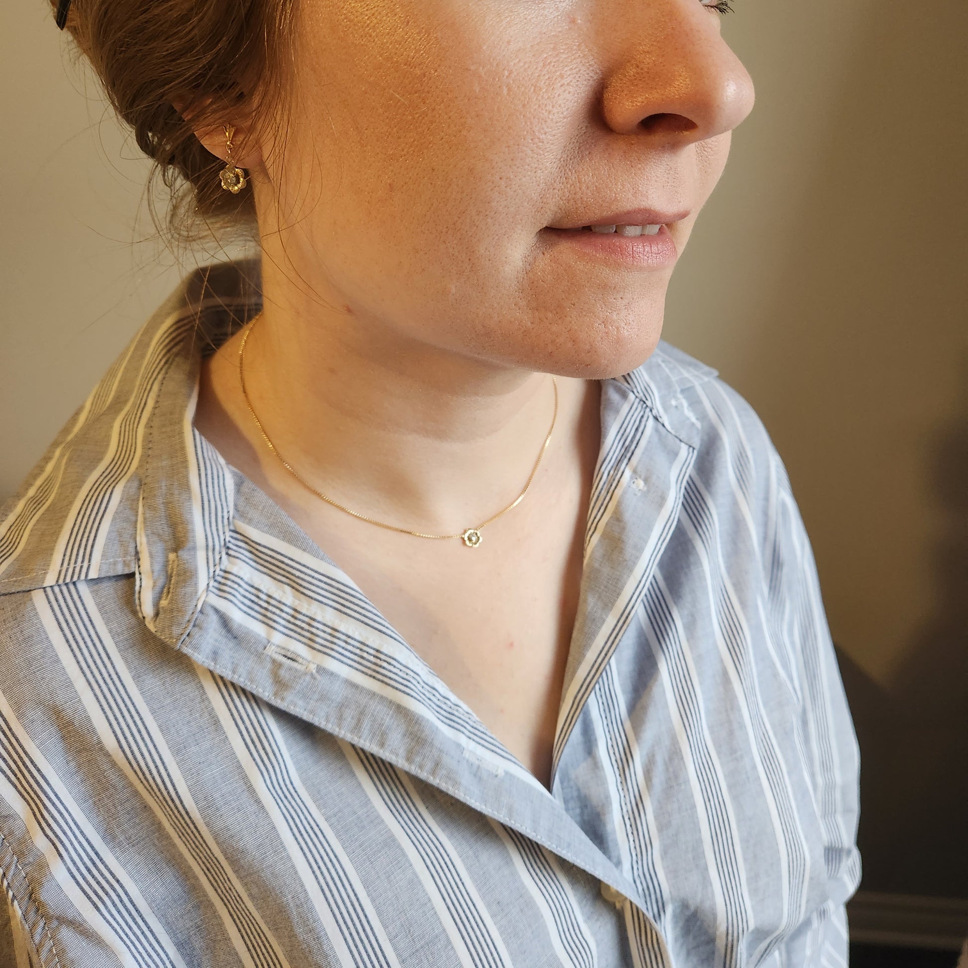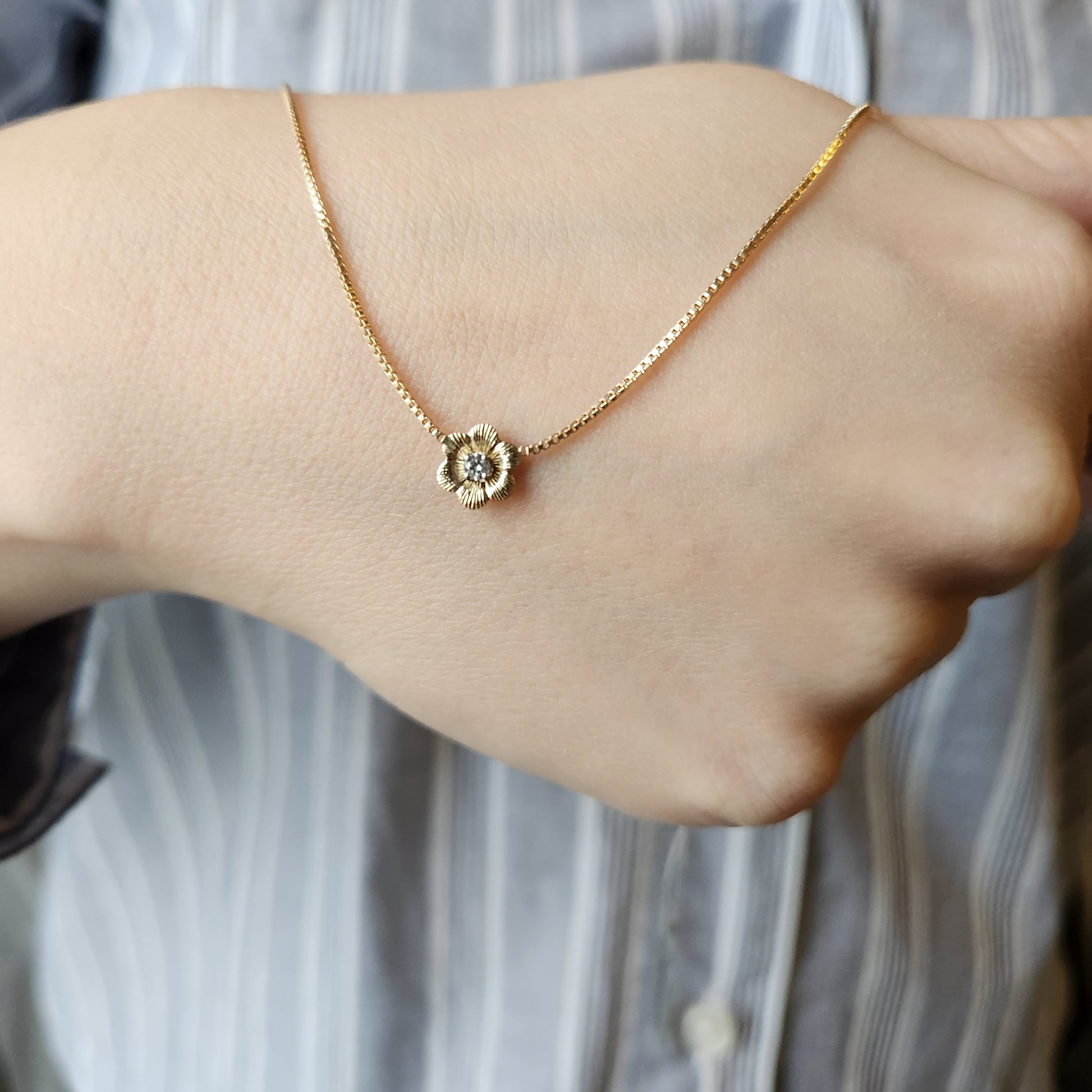 Refined and minimalist. This petite flower with it's sparkling diamond center sits upon a sleek box chain. Perfect on it's own or layered with other chains. At 15" long, this sits high on the neck, pairing well with various necklines. Contact us if you wish an optional 2-3" chain extender.
