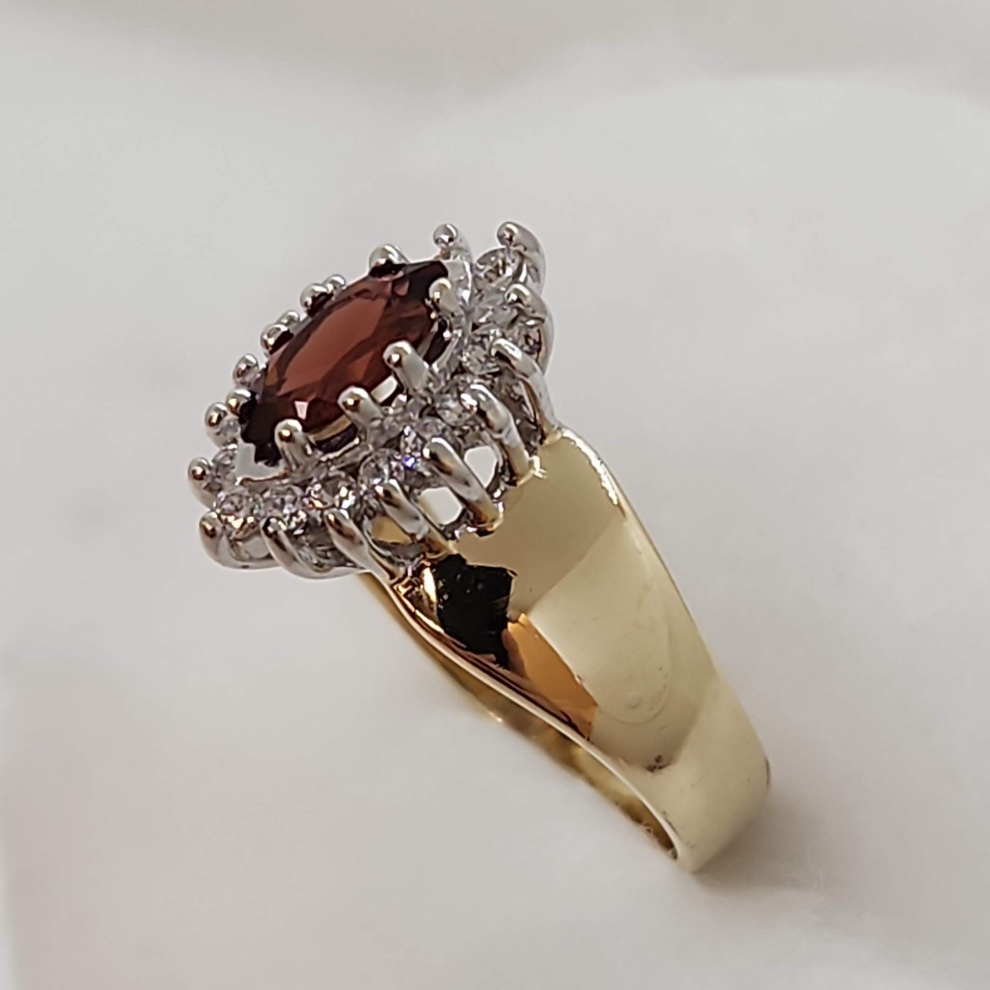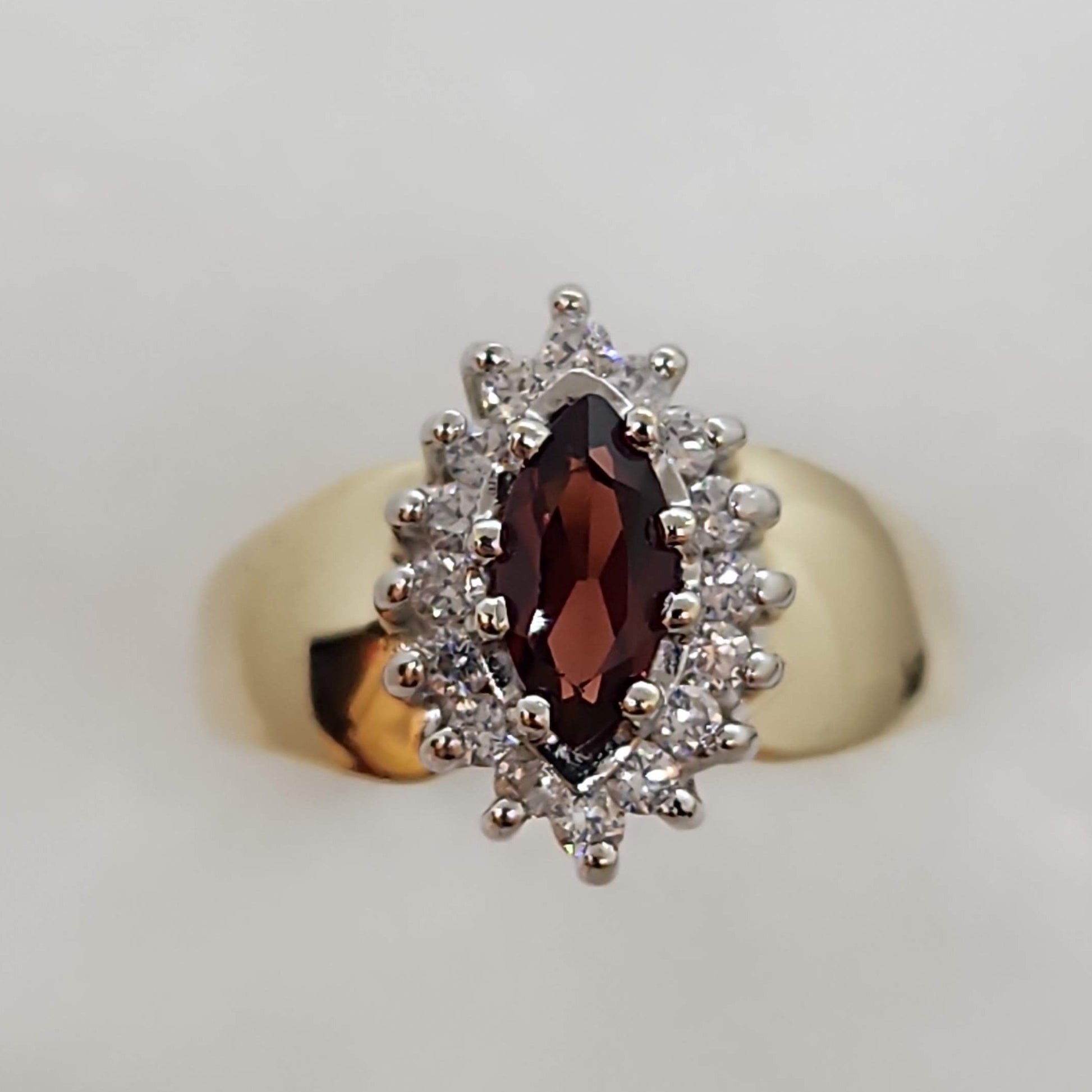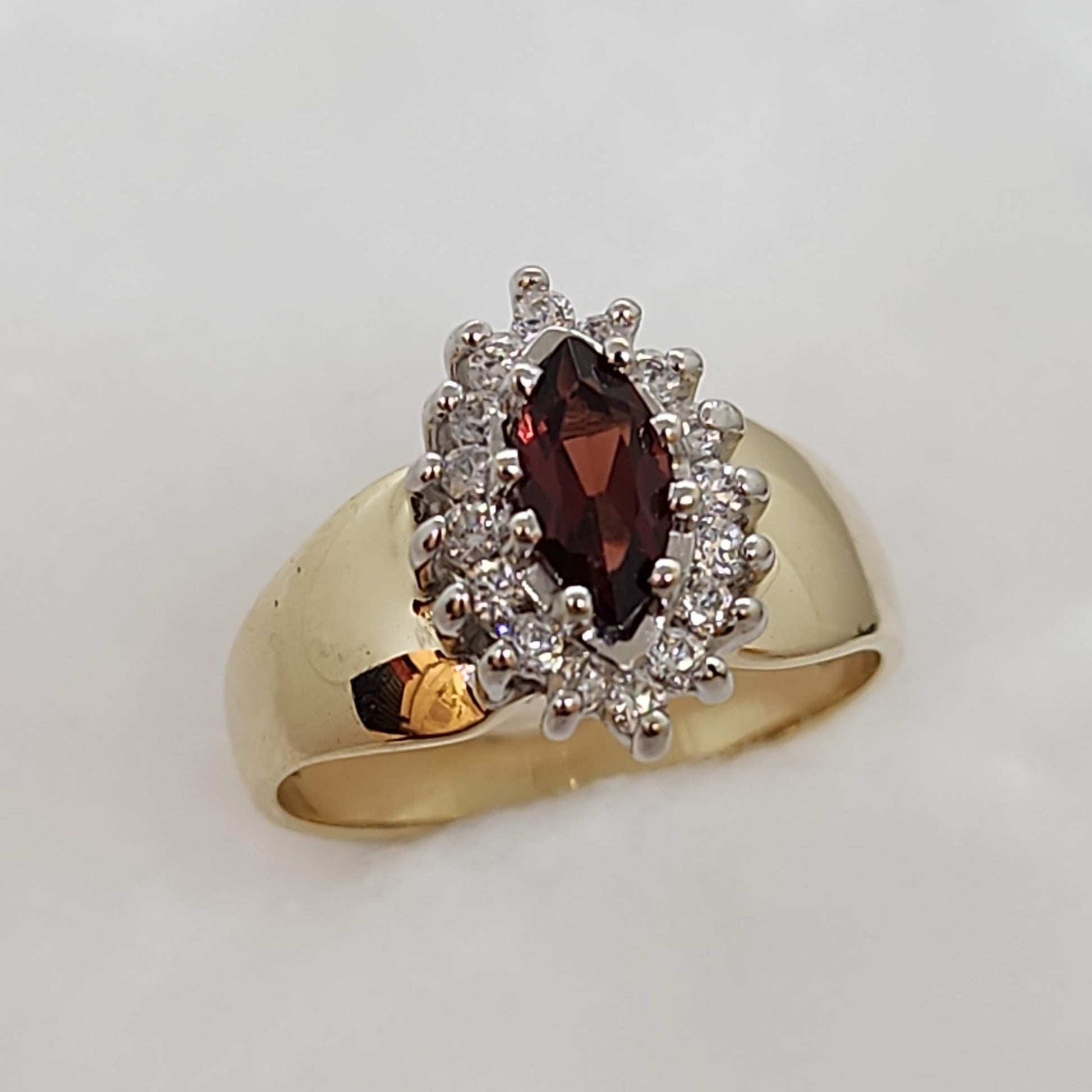 Marquise shapes are often associated with a creative, theatrical personality or anyone who enjoys a touch of drama tinged with glamour. The sharp points of the stone also convey a sense of edginess. This marquise cluster has a beautiful, highly polished wide band, especially flattering on a larger hand. Also a lovely January birthstone ring.