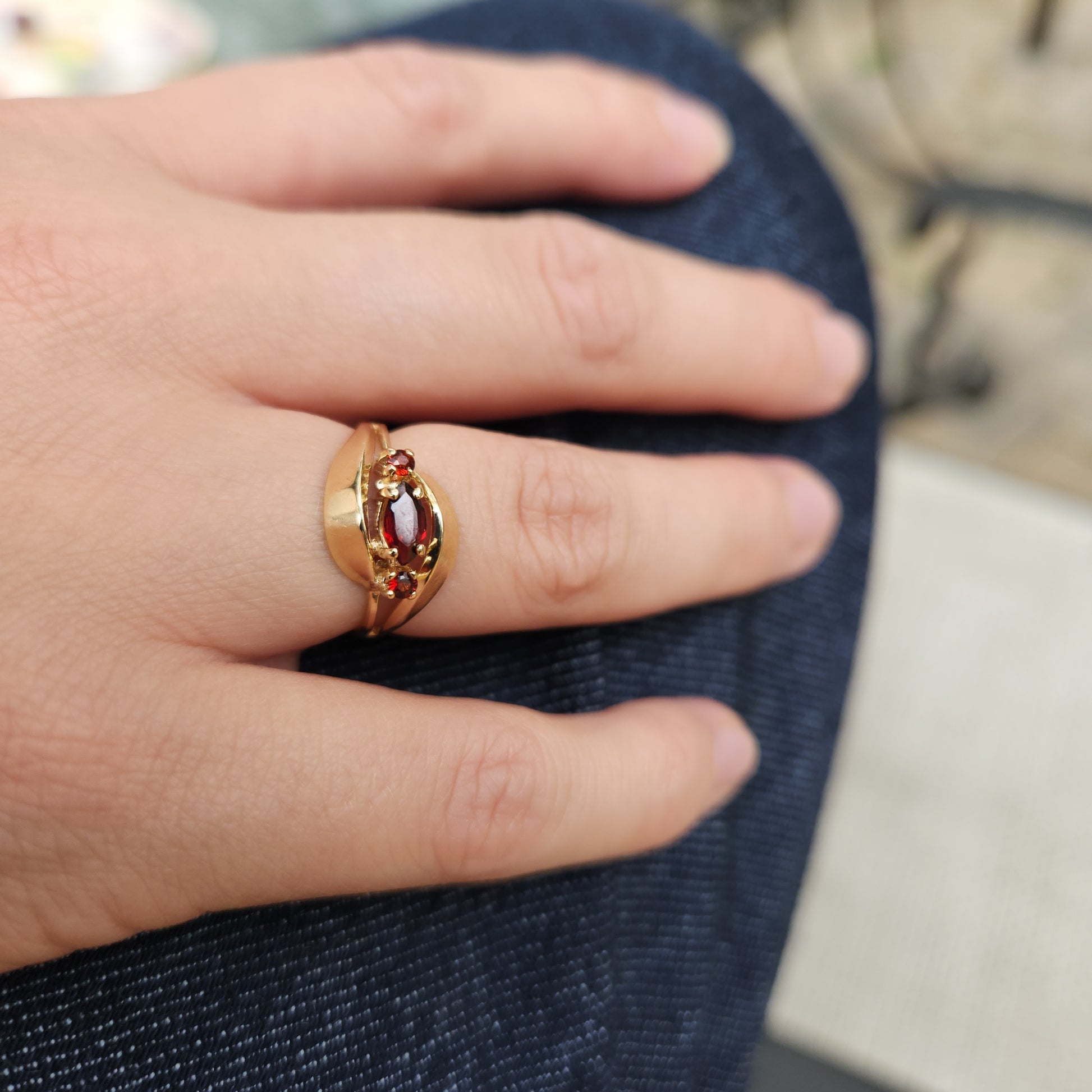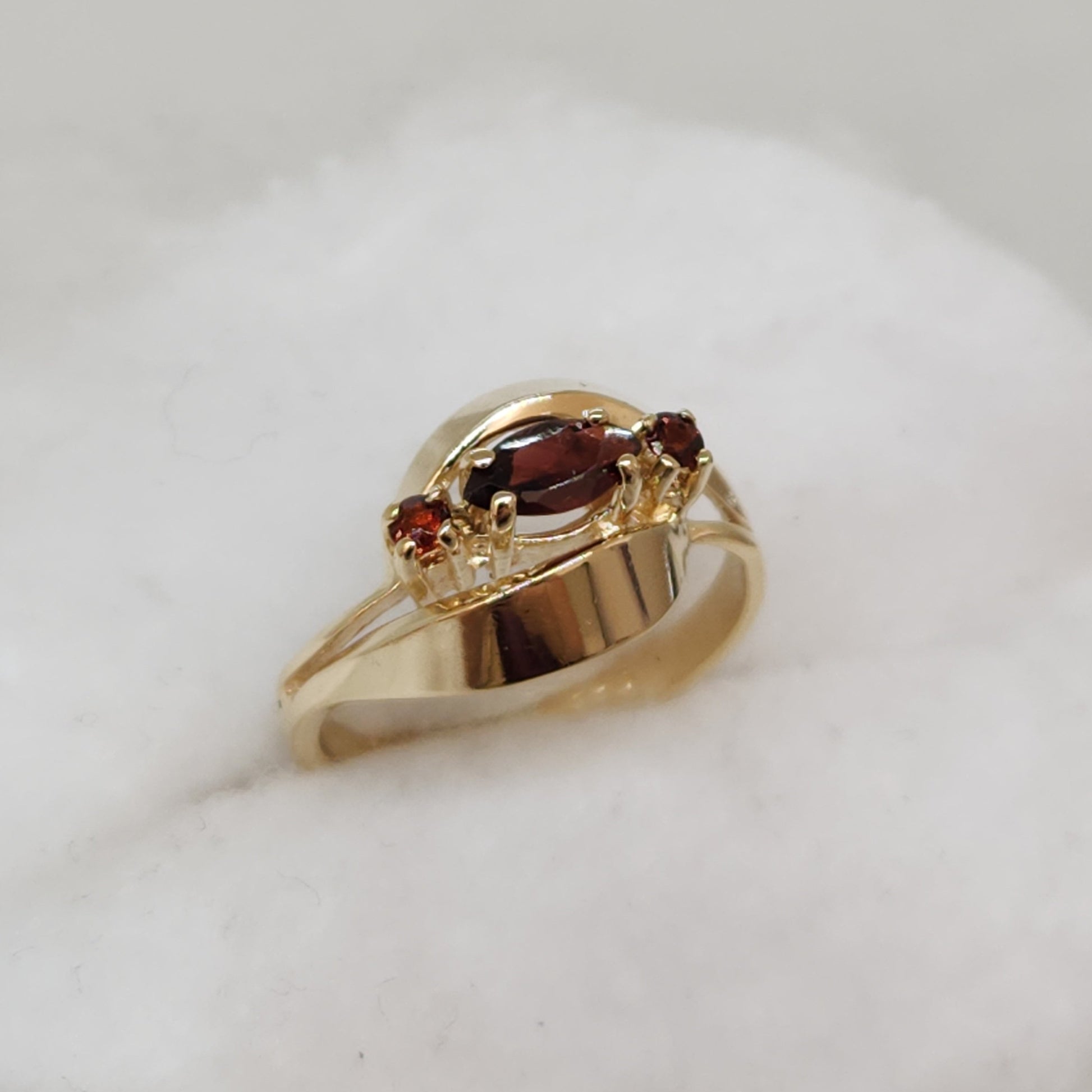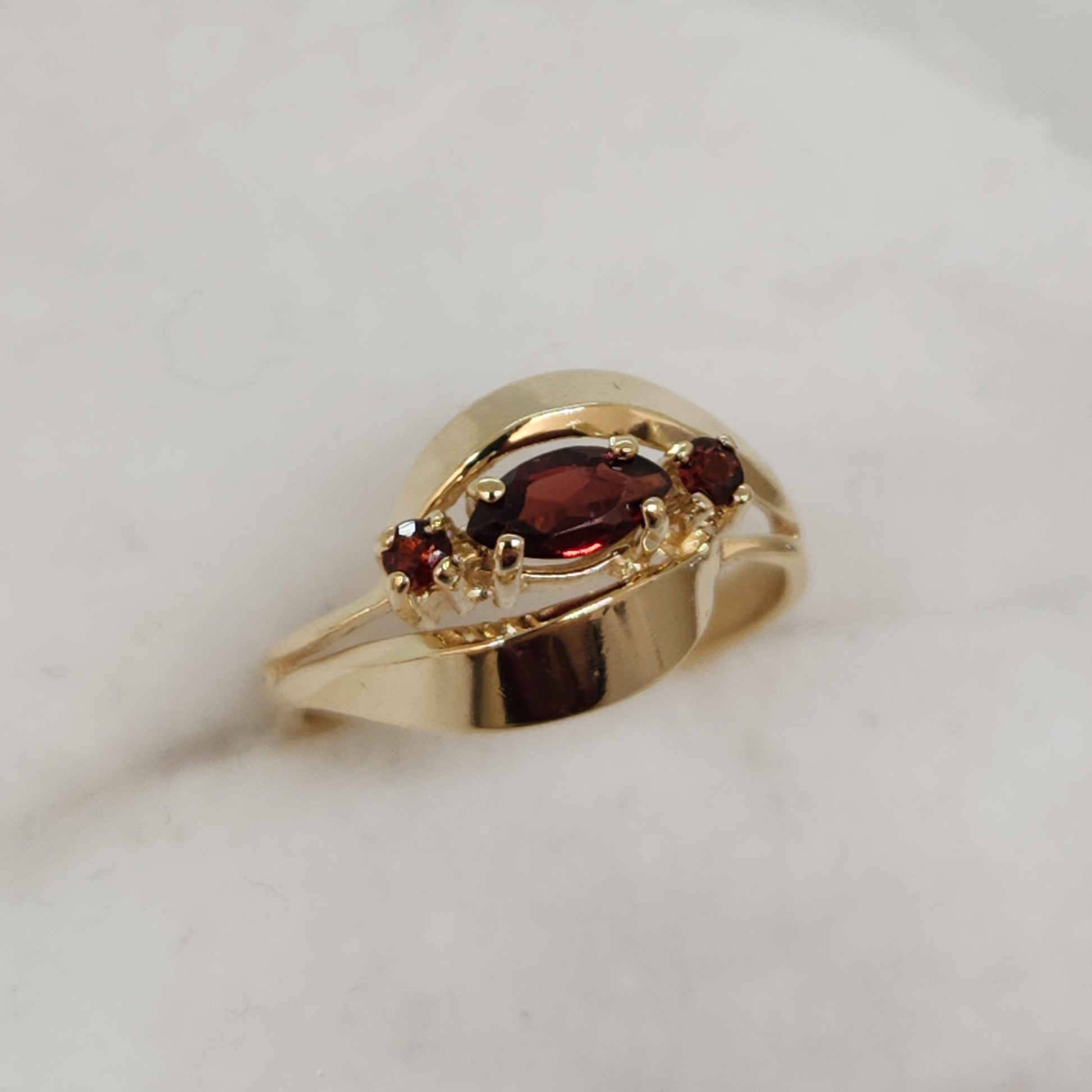 Two swirling ribbons of gold cradle a warm autumnal shade of garnet. The swirls elicit a feeling of mystical charm to the central gemstone.