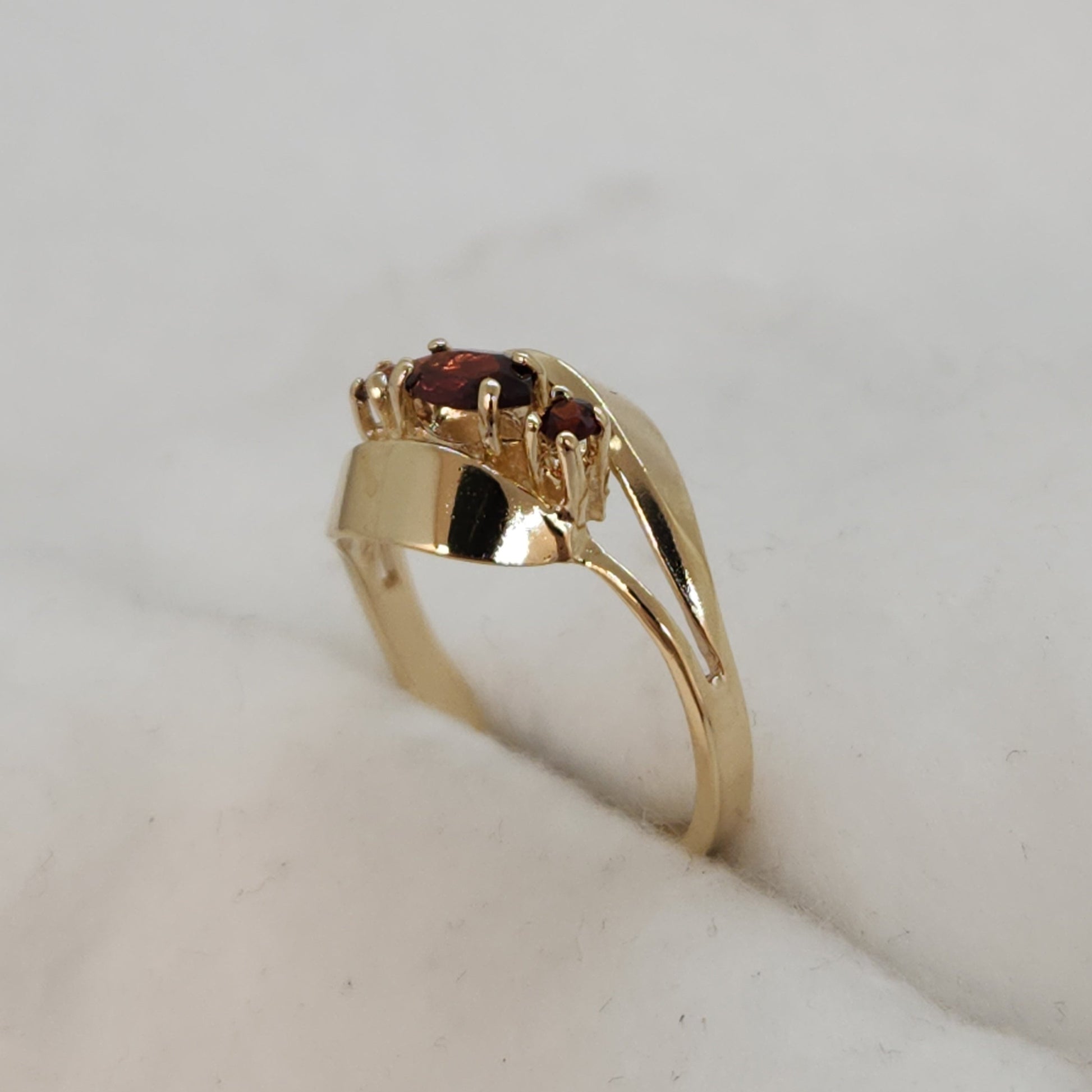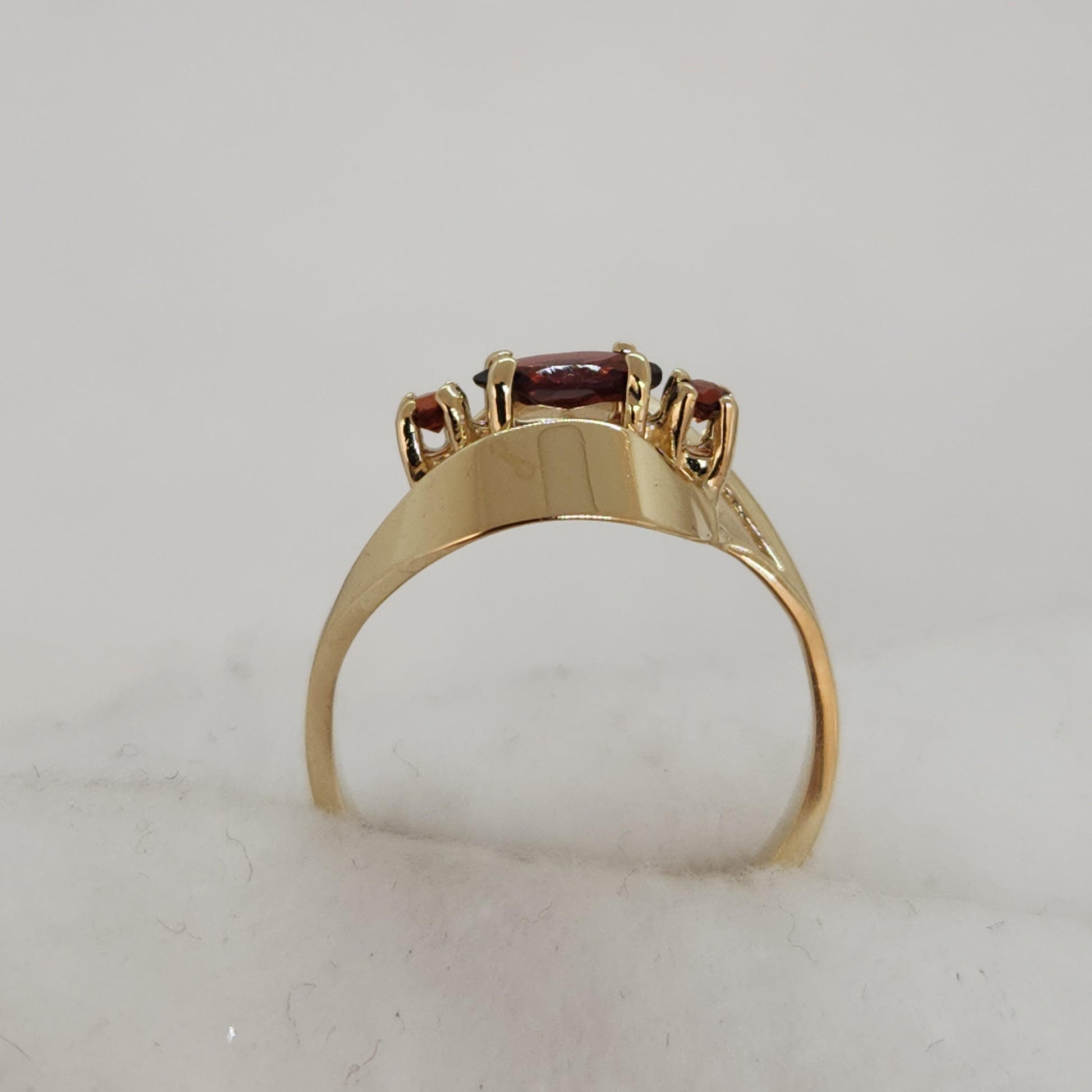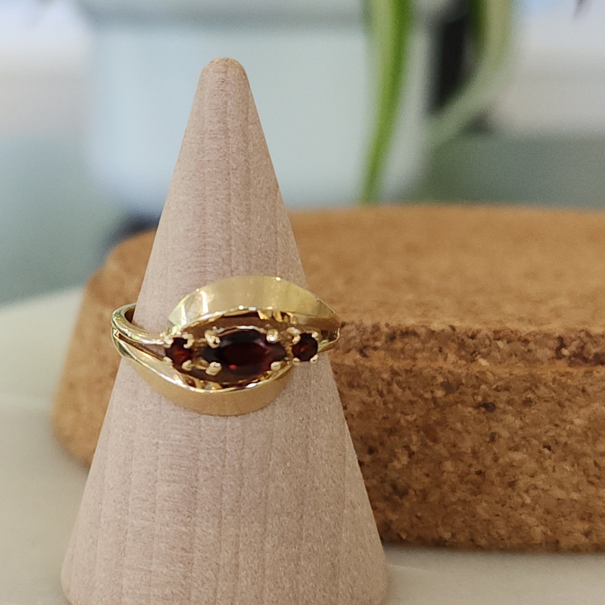 Two swirling ribbons of gold cradle a warm autumnal shade of garnet. The swirls elicit a feeling of mystical charm to the central gemstone.
