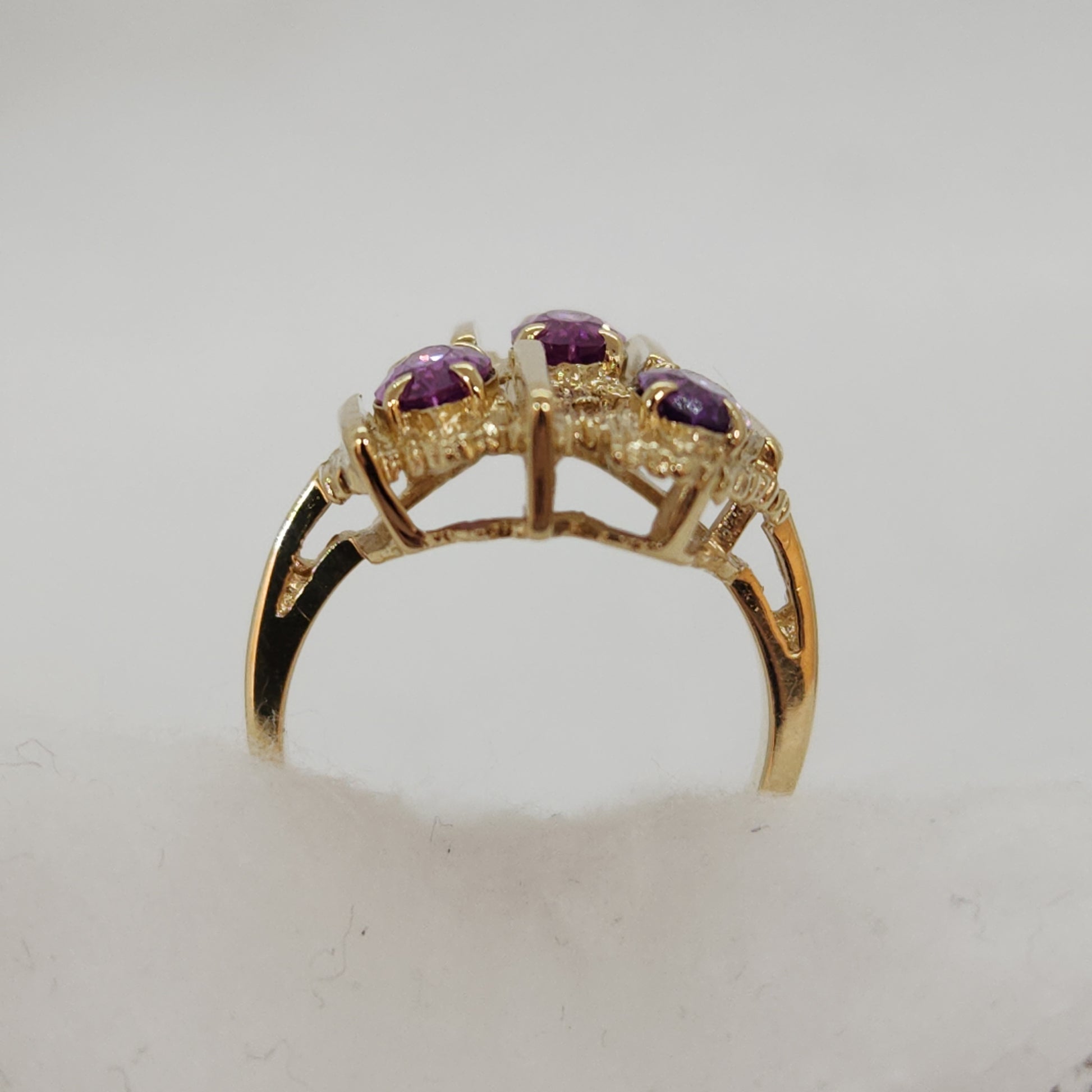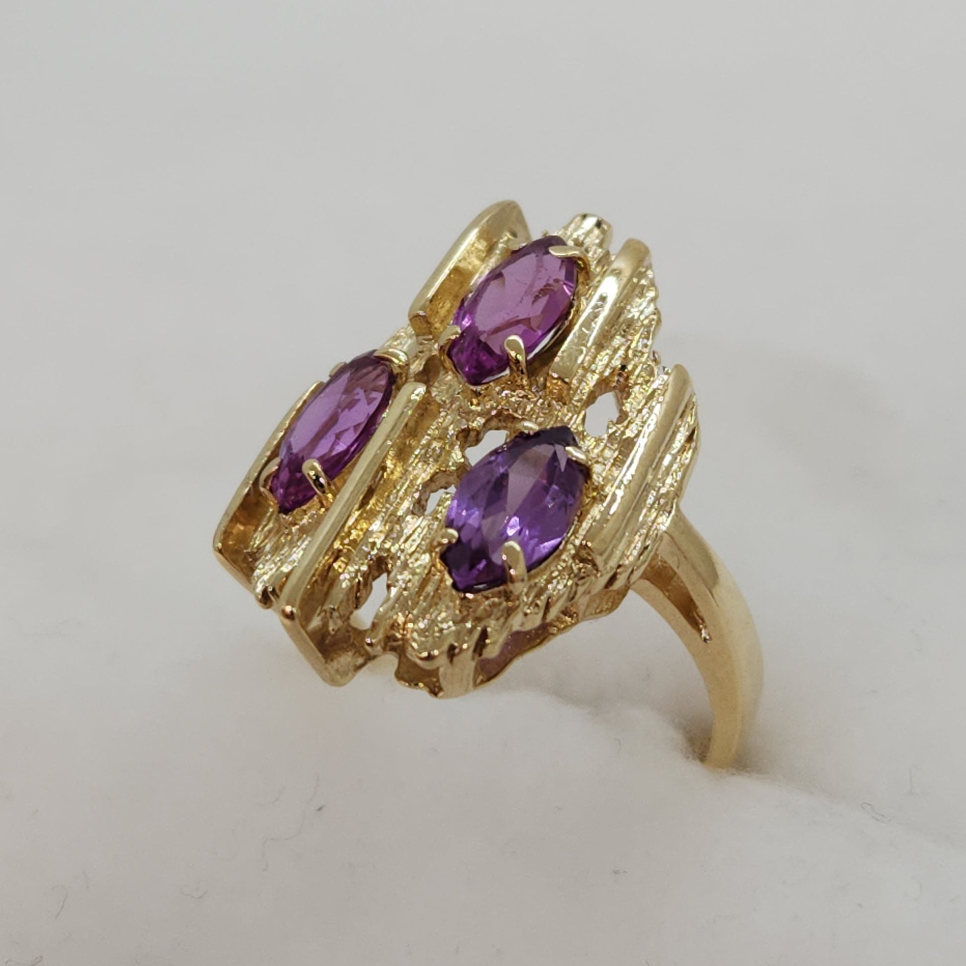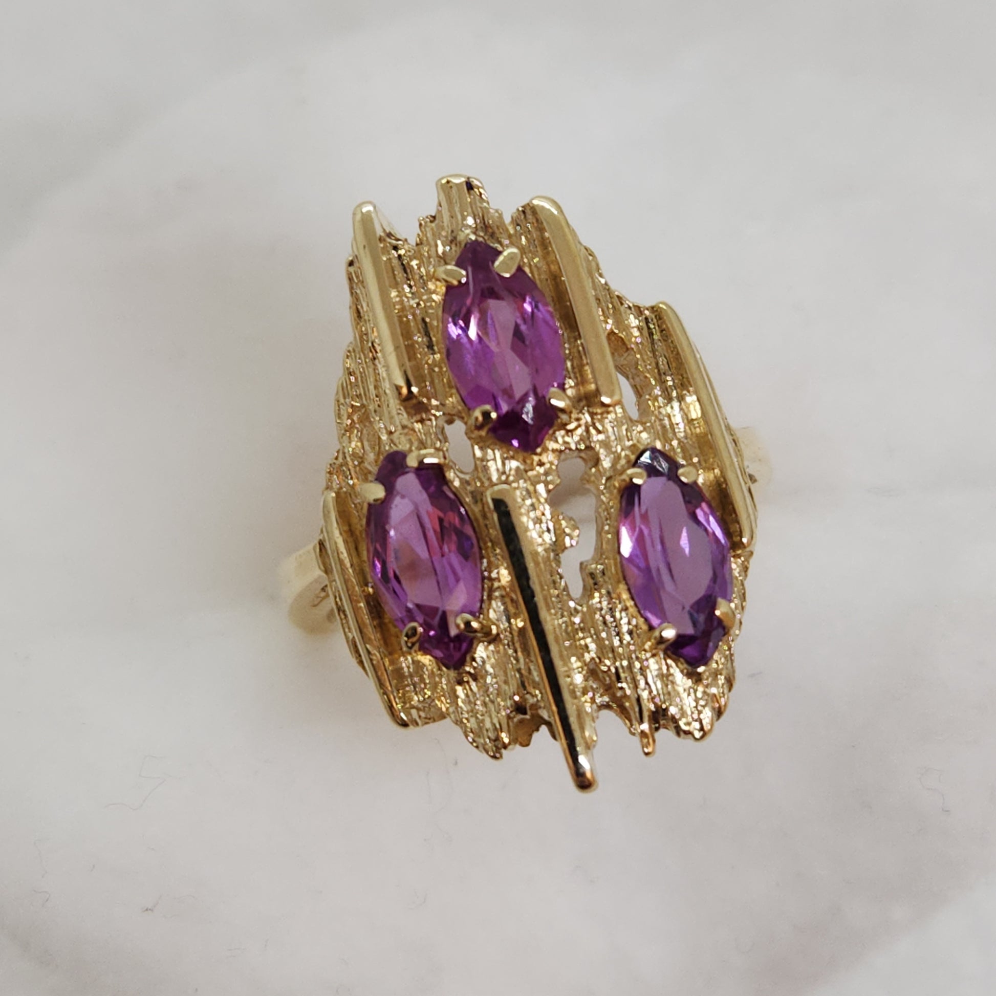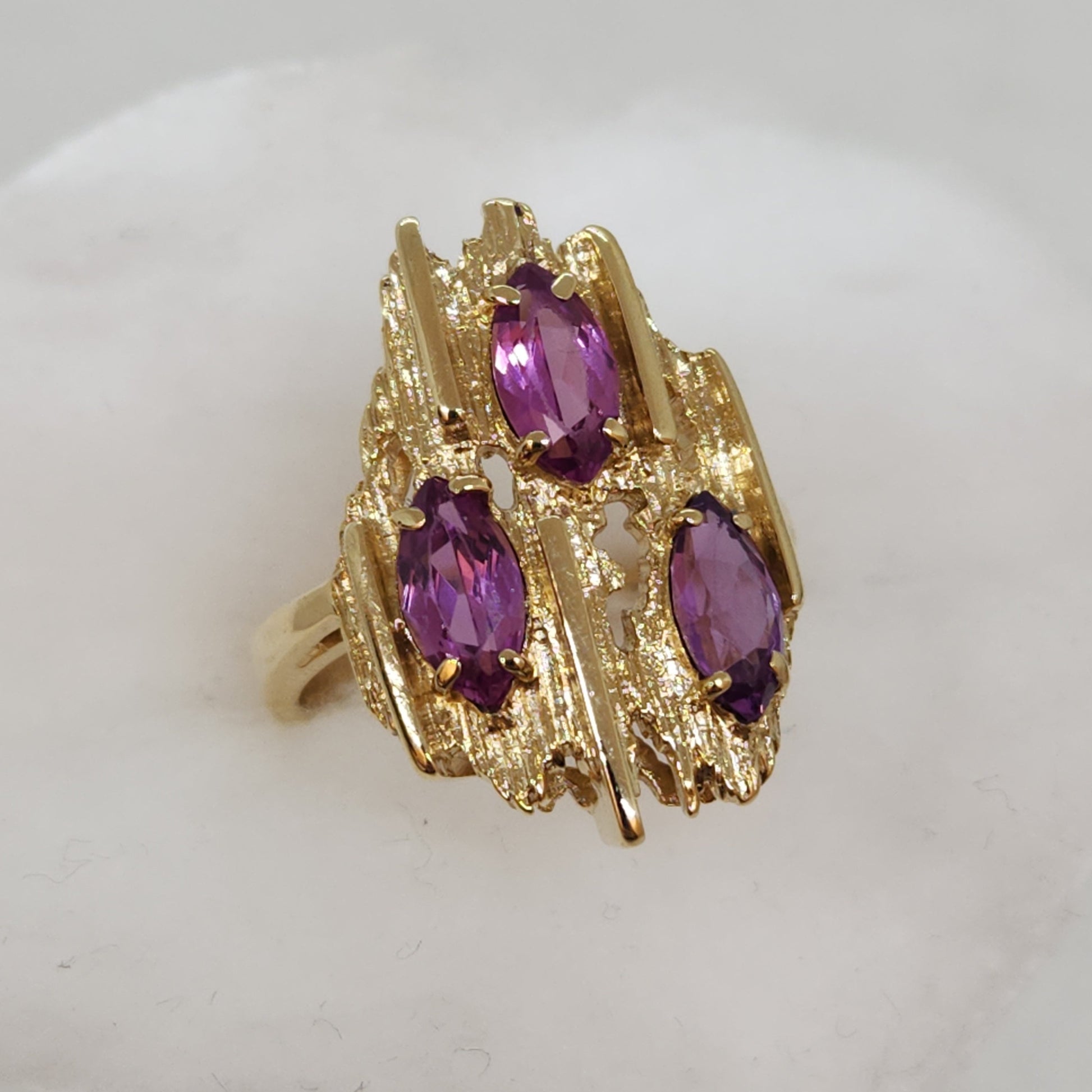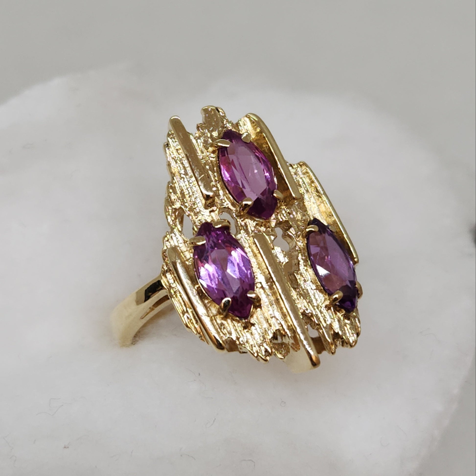 Gold texture and form that mimic the rough crystals of gemstones before they are cut and facetted into the shapes we see in finished jewellery. This is a style of jewellery called 'Brutalist', and was made popular in the 1950s. New manufacturing processes lead to new and exciting textures for jewellery designers to experiment with. Try wearing this one with another touch of purple in your outfit - it pops!