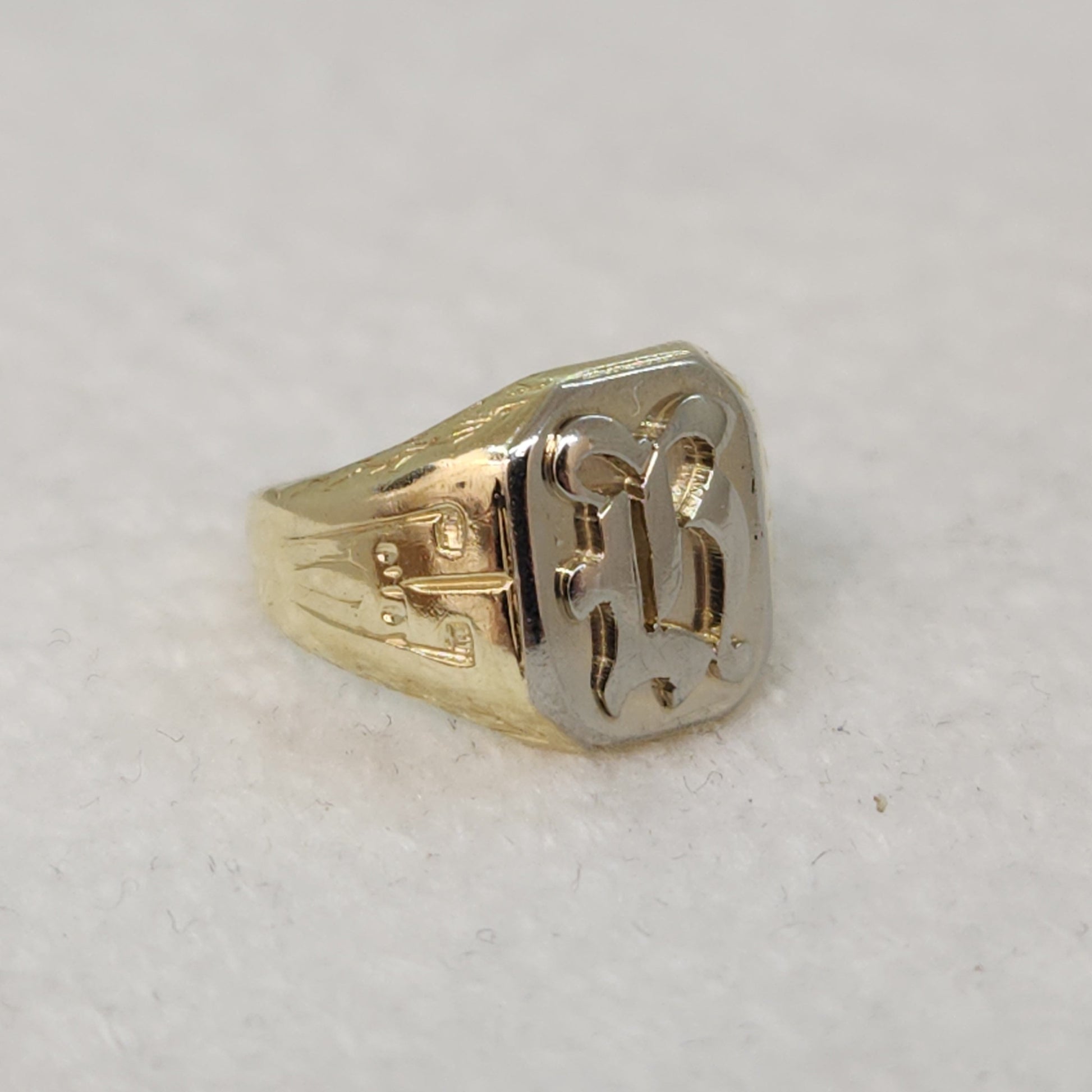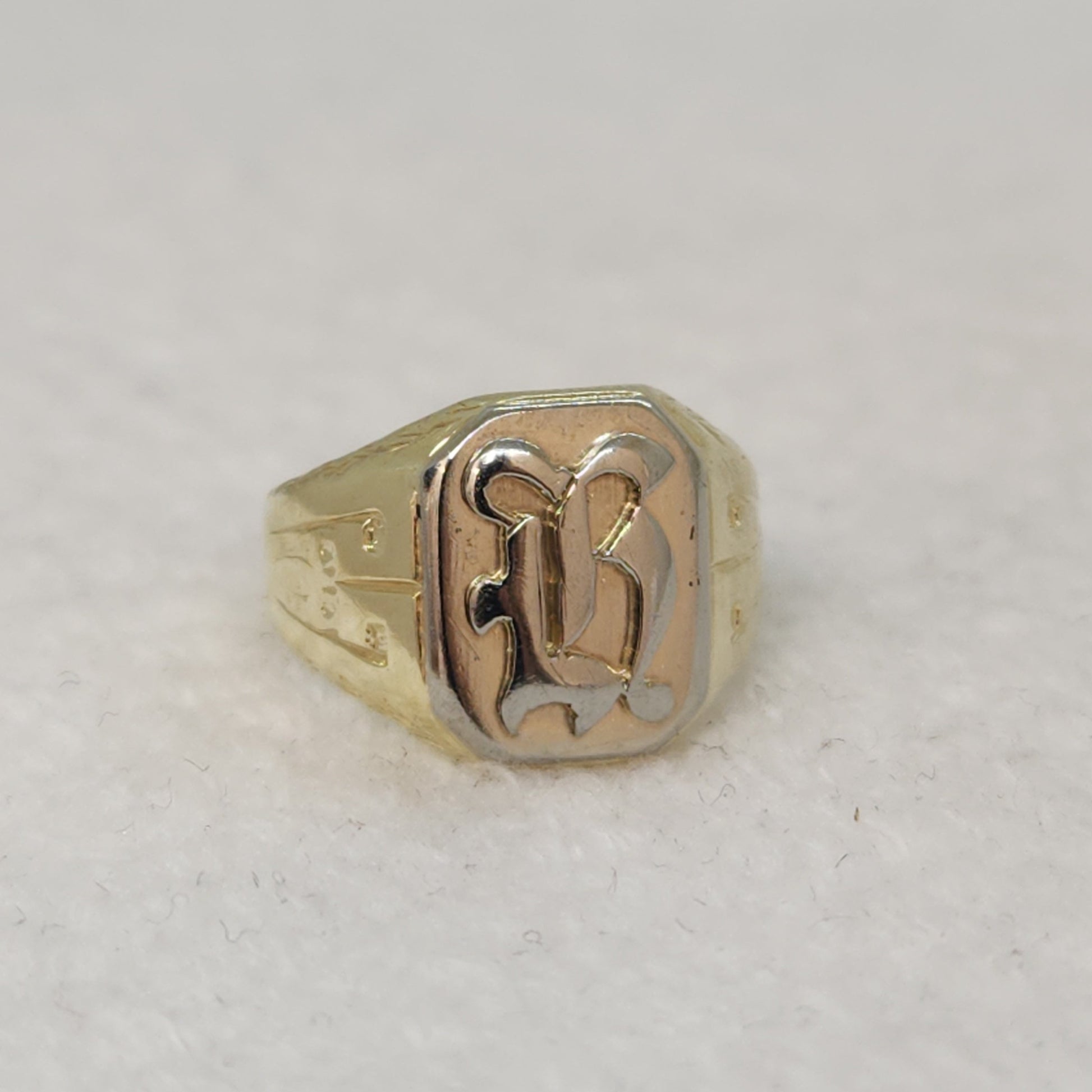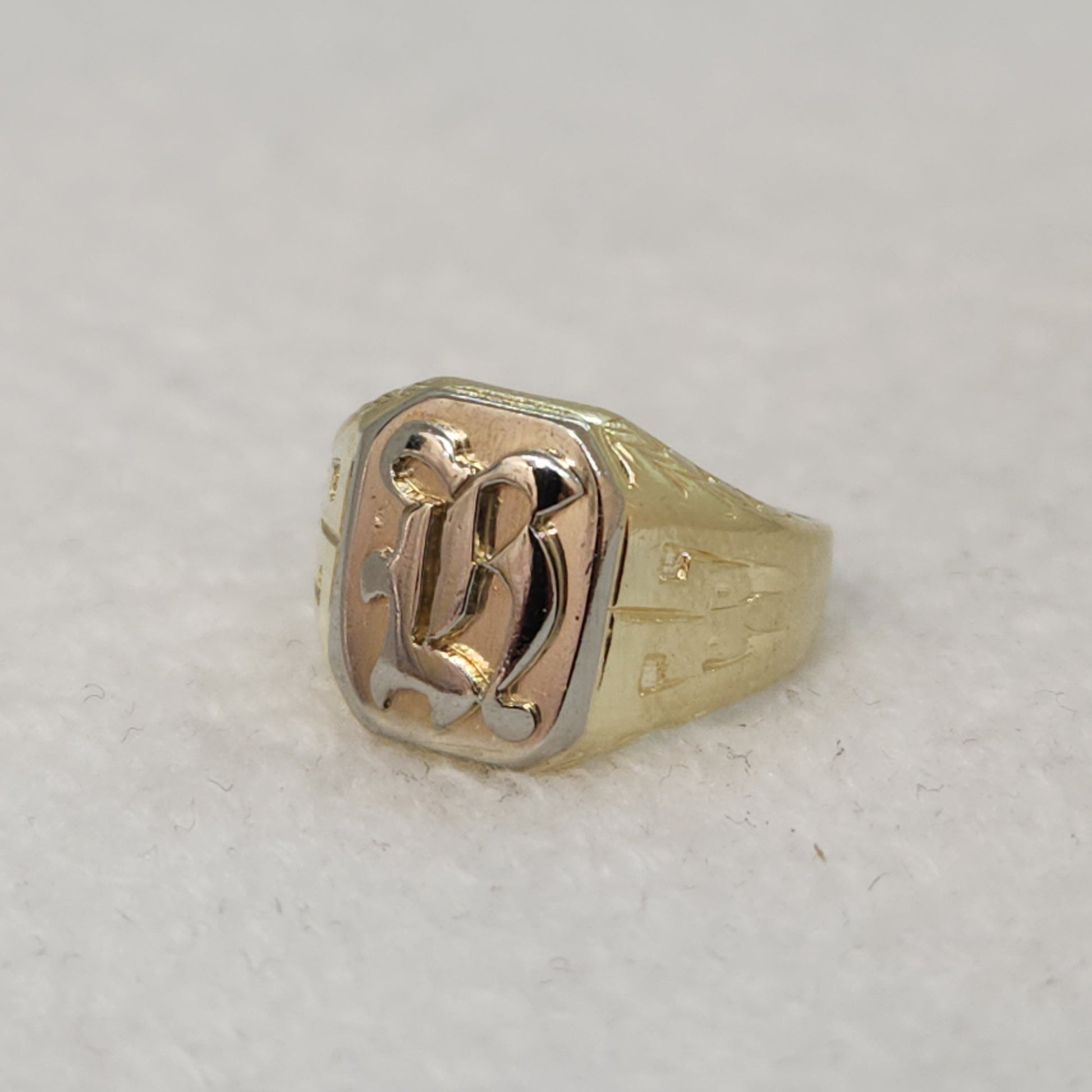 This delicate pinky ring is punctuated by a monogrammed gothic letter "B" emblazoned in white gold on its face.