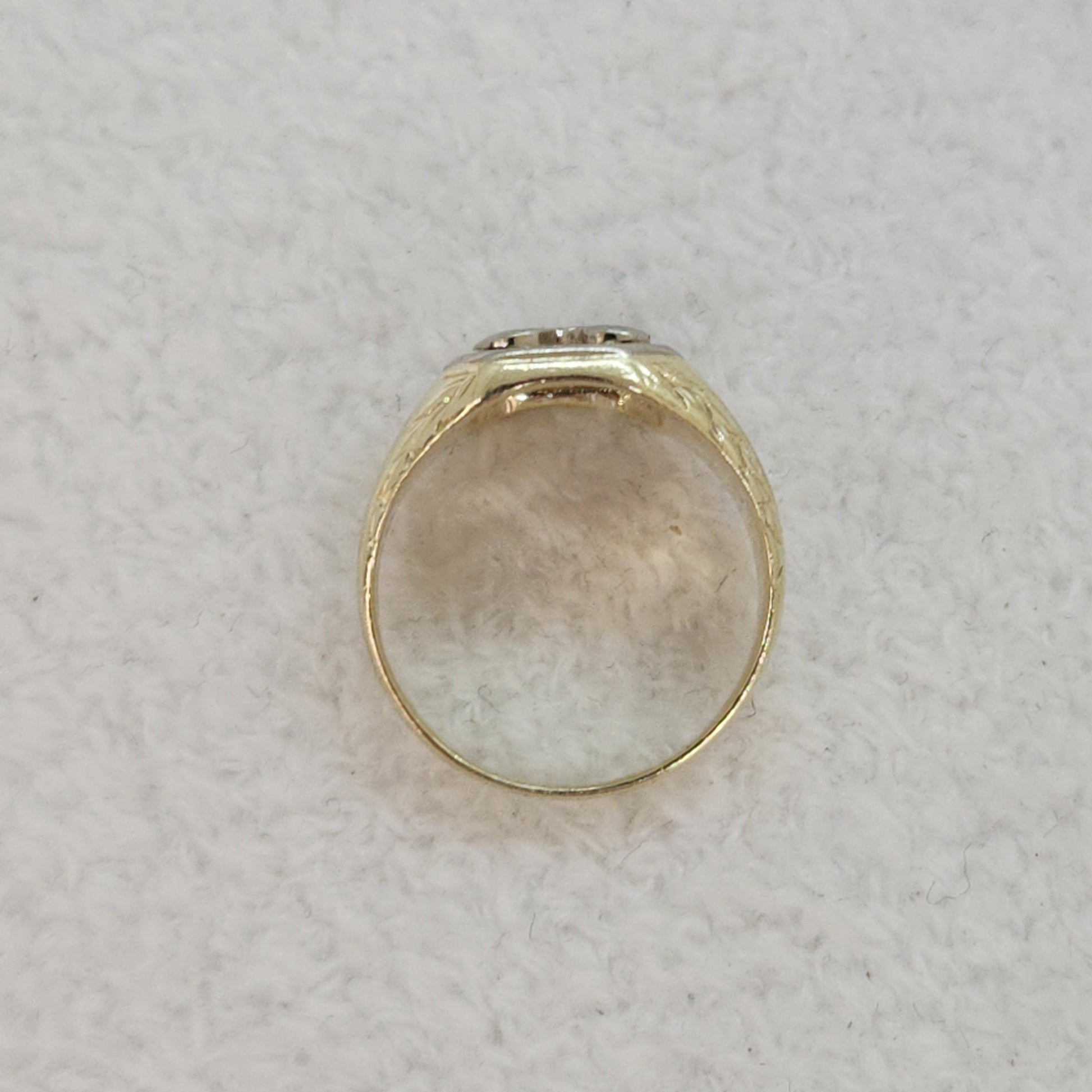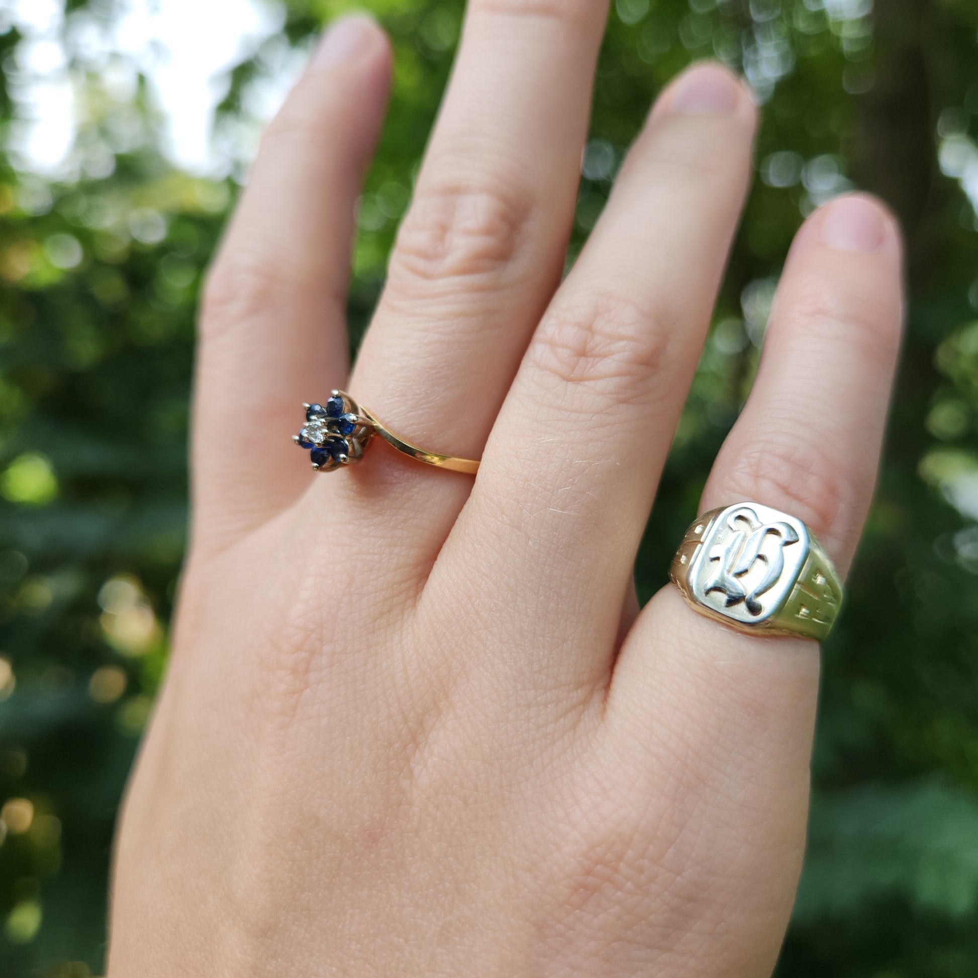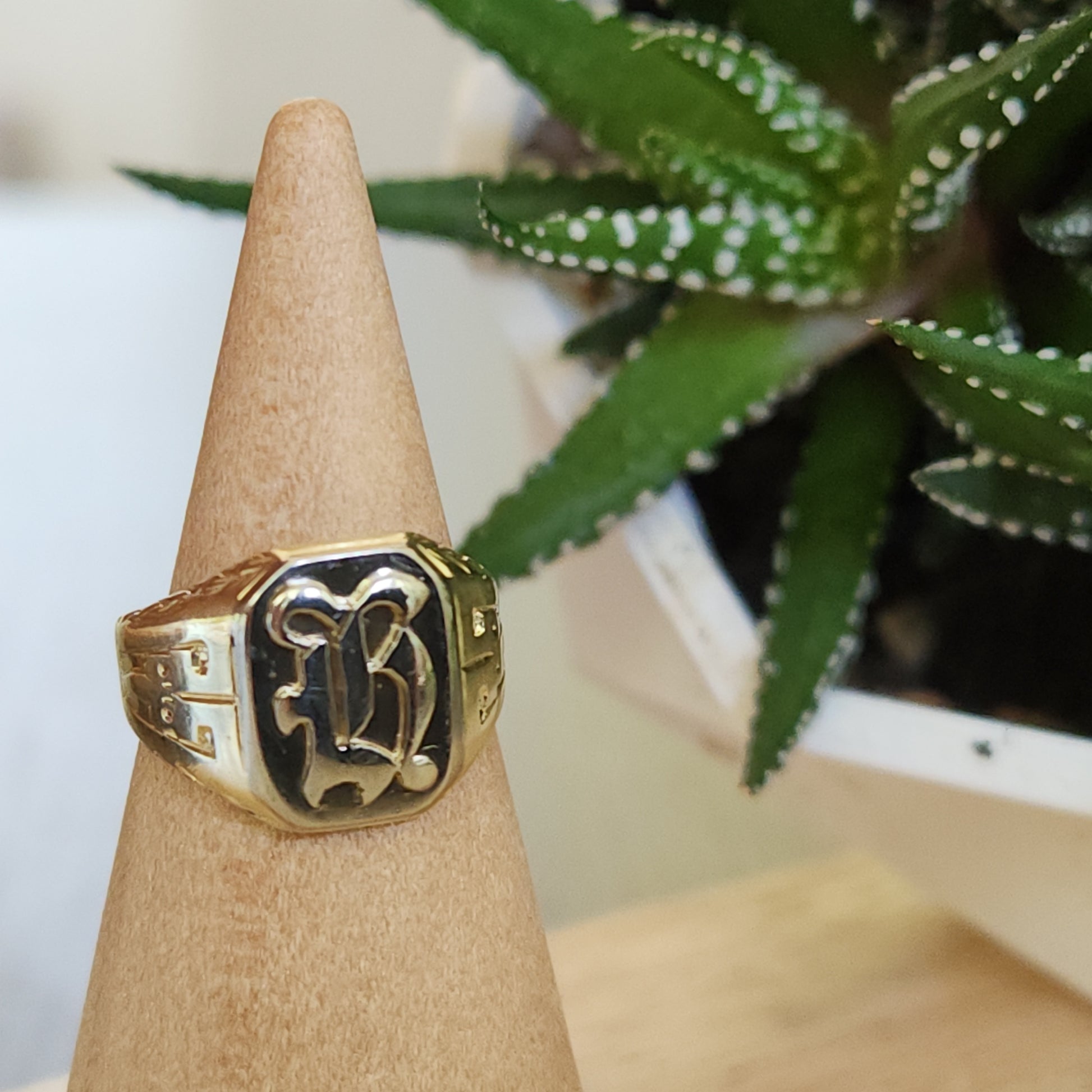This delicate pinky ring is punctuated by a monogrammed gothic letter "B" emblazoned in white gold on its face.