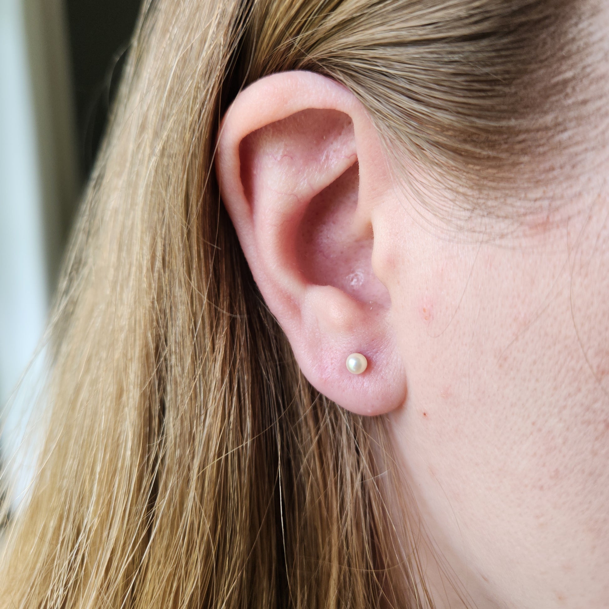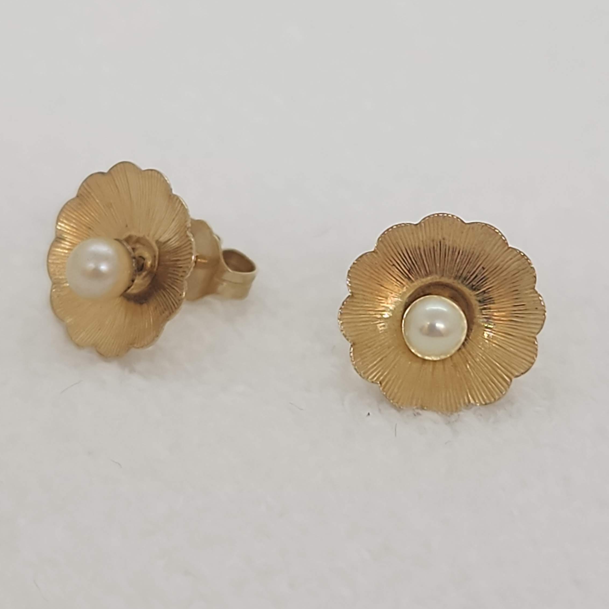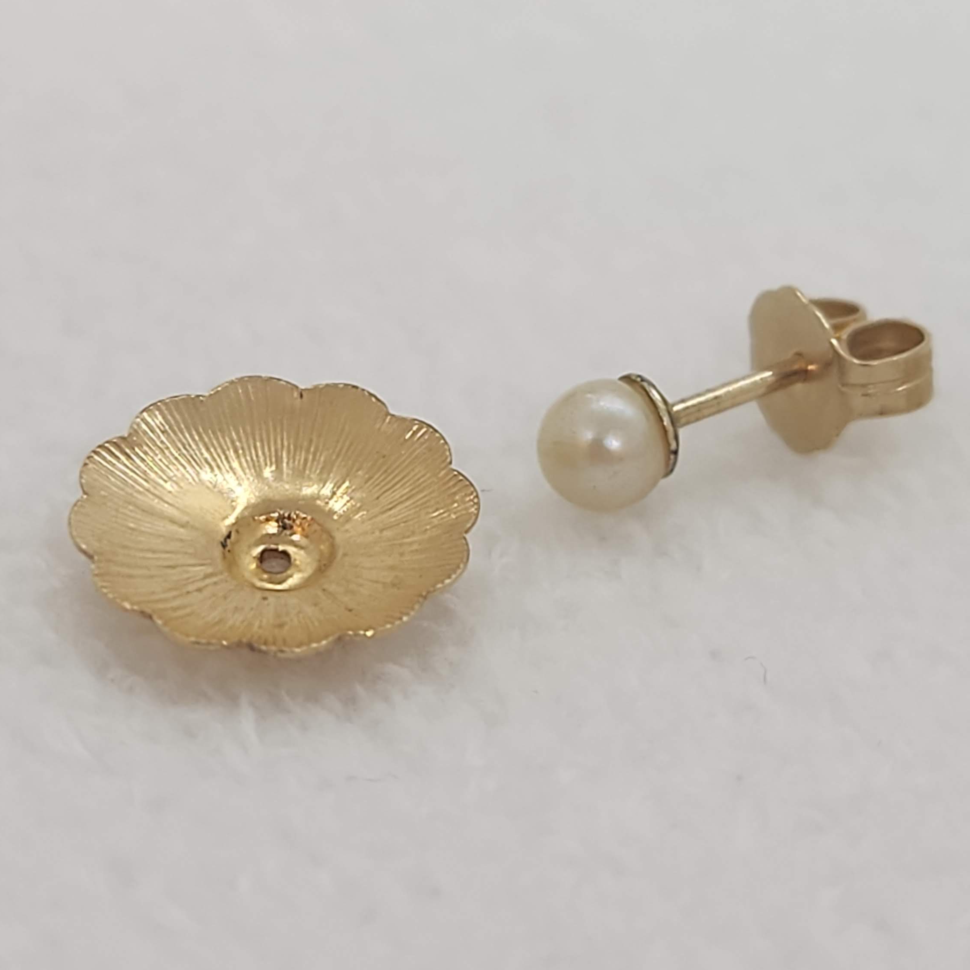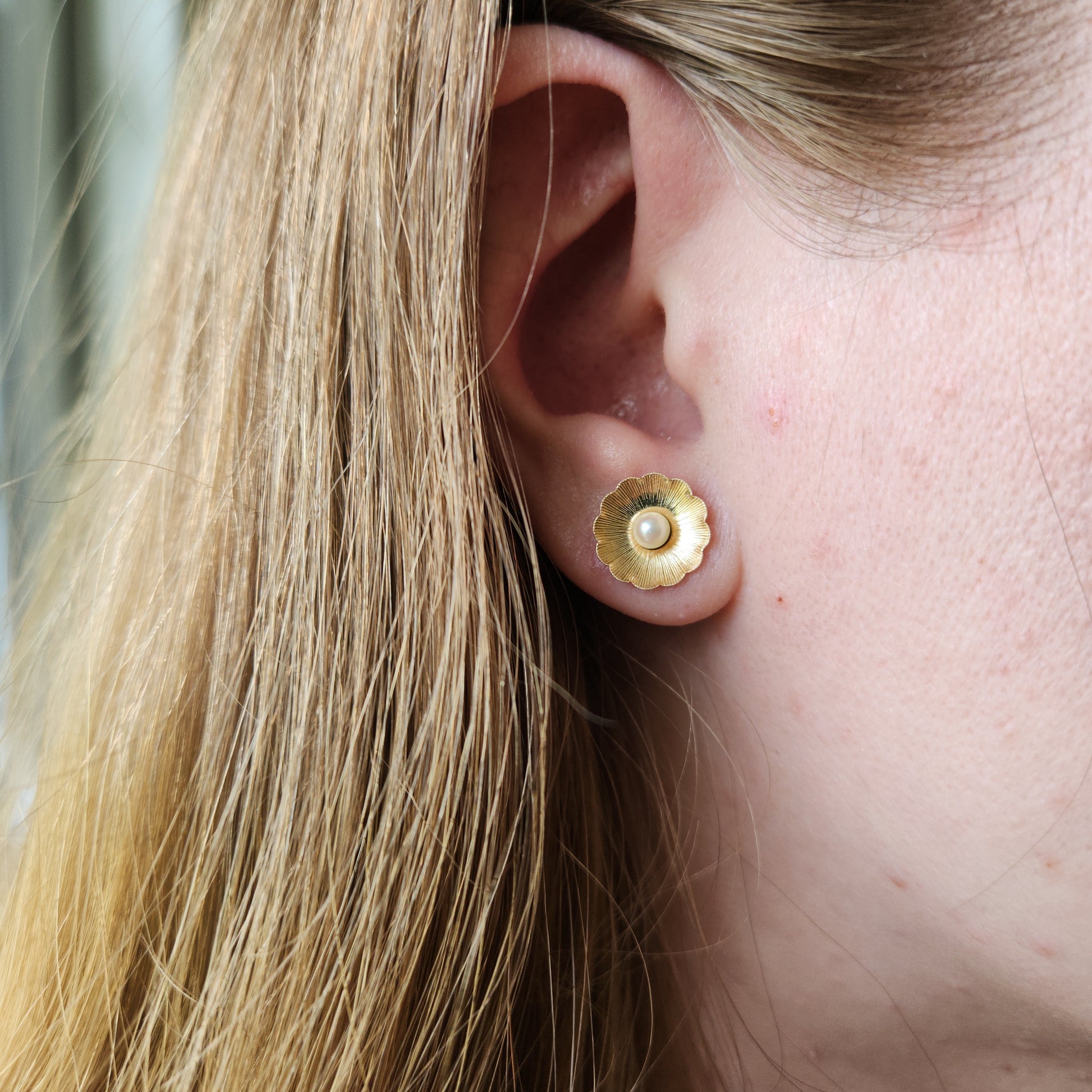 Delicate (size) pearls, set freely through a detailed poppy-esque gold flower. A lovely accent to a summer dress. The flower jackets can be removed and interchanged with another stud earring, they would particularly complement diamond studs.