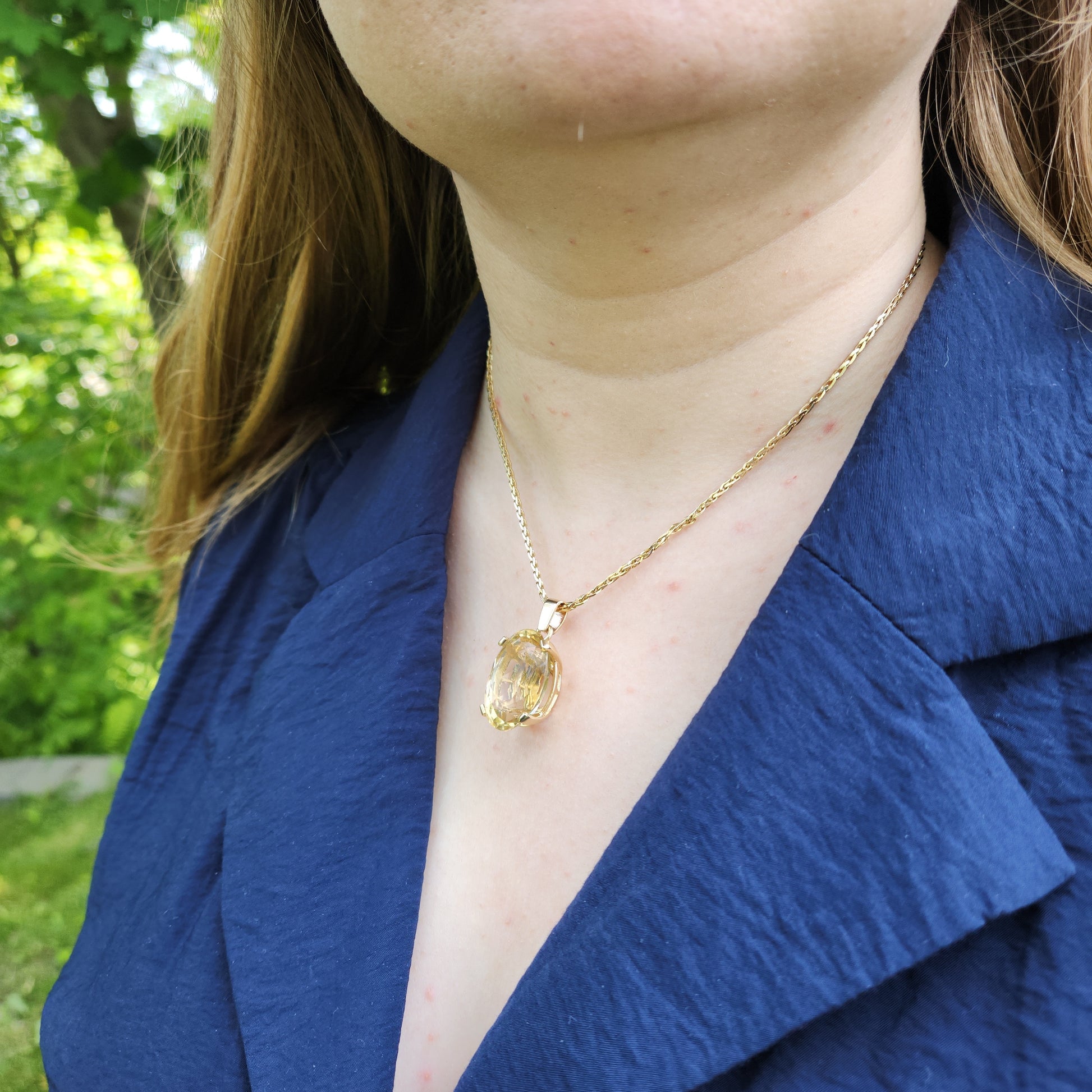 Stand out from the pack with your very own golden egg! Champagne tinted this oval stone has the most unique cut with extra facets on the crown and multi unique faceting on the pavilion which make it shimmer. Citrine is known as the Merchant's stone because it resembles gold and has been thought to bring prosperity, wealth, and good fortunes.